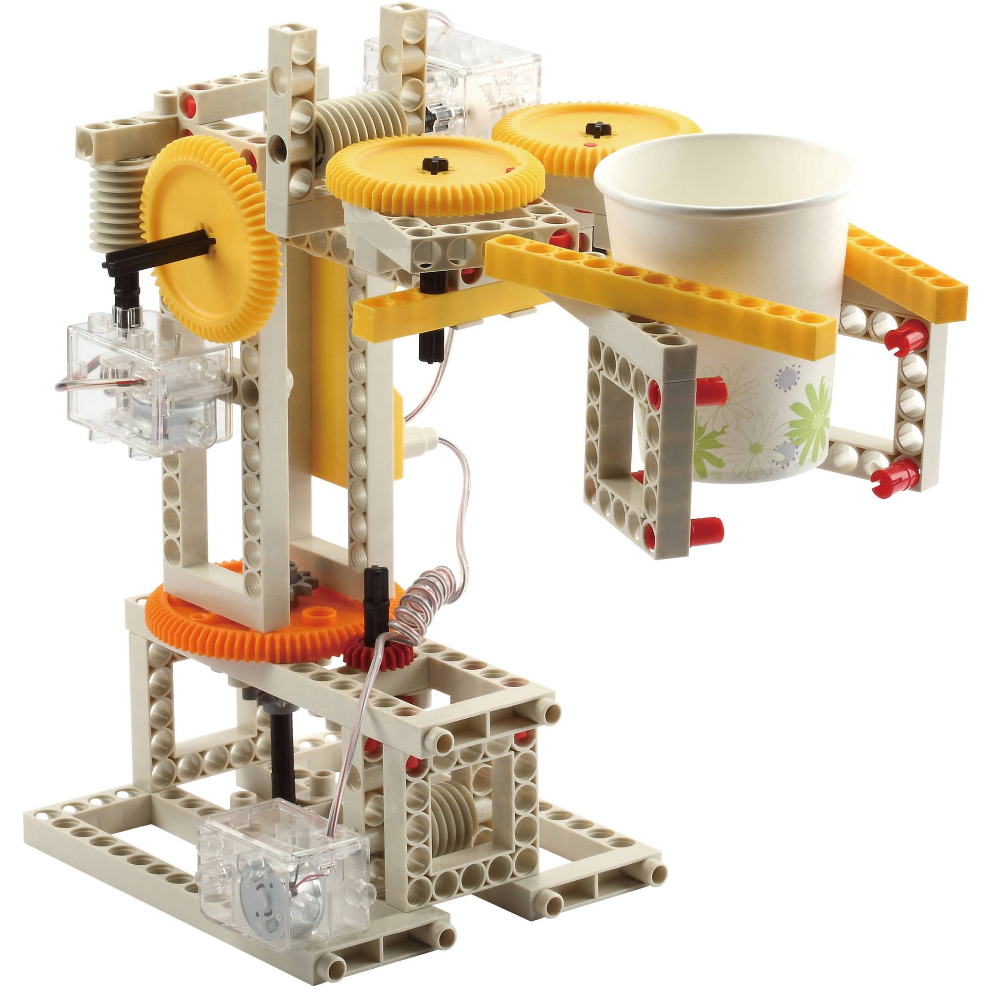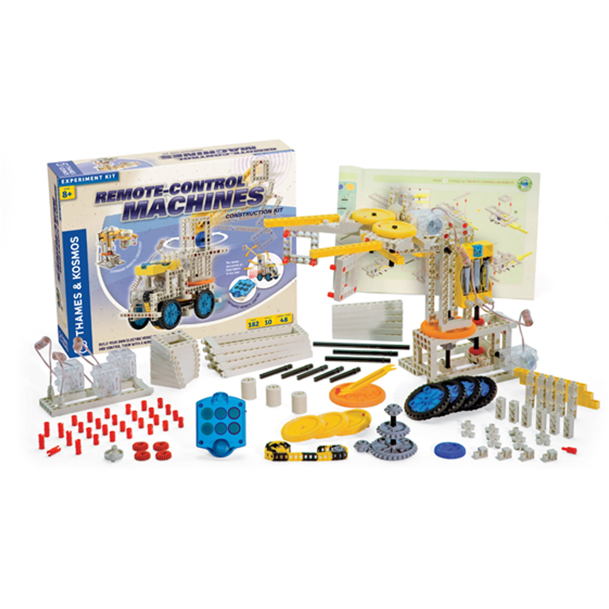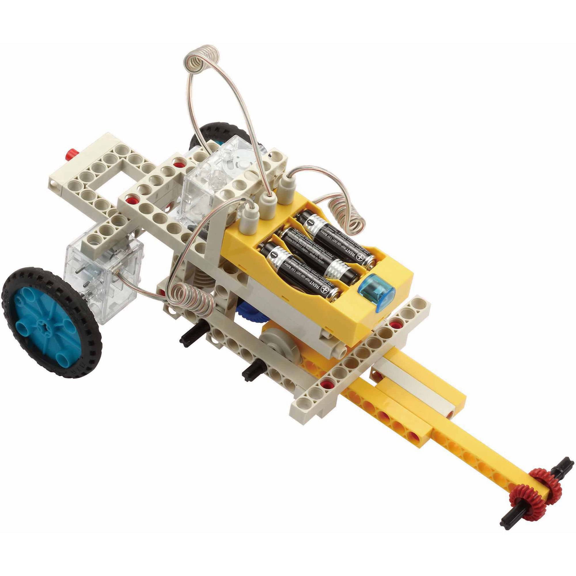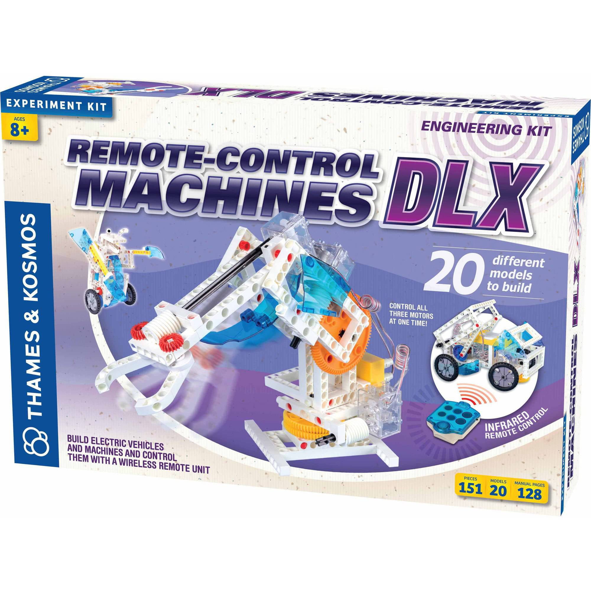 Build your own motorized vehicles and machines and control them with a wireless remote control unit. A unique six-button infrared remote allows you to control three different motors simultaneously, moving each of them forward or in reverse, with easy-to-activate touch sensors. The three motors can be combined to make complex vehicles and machines in numerous configurations limited only by your imagination. Assemble ten models demonstrating different ways in which the motors can be used including a bulldozer, car, three-wheeler, crane, antique car, plow, folding car, formula one racer, three-blade dozer, and robotic arm. After you have built the models in the instructions, you can design your own remote control creations! The kit comes with three motors, remote control unit, battery holder, and 182 building pieces. 48-page color instruction book.