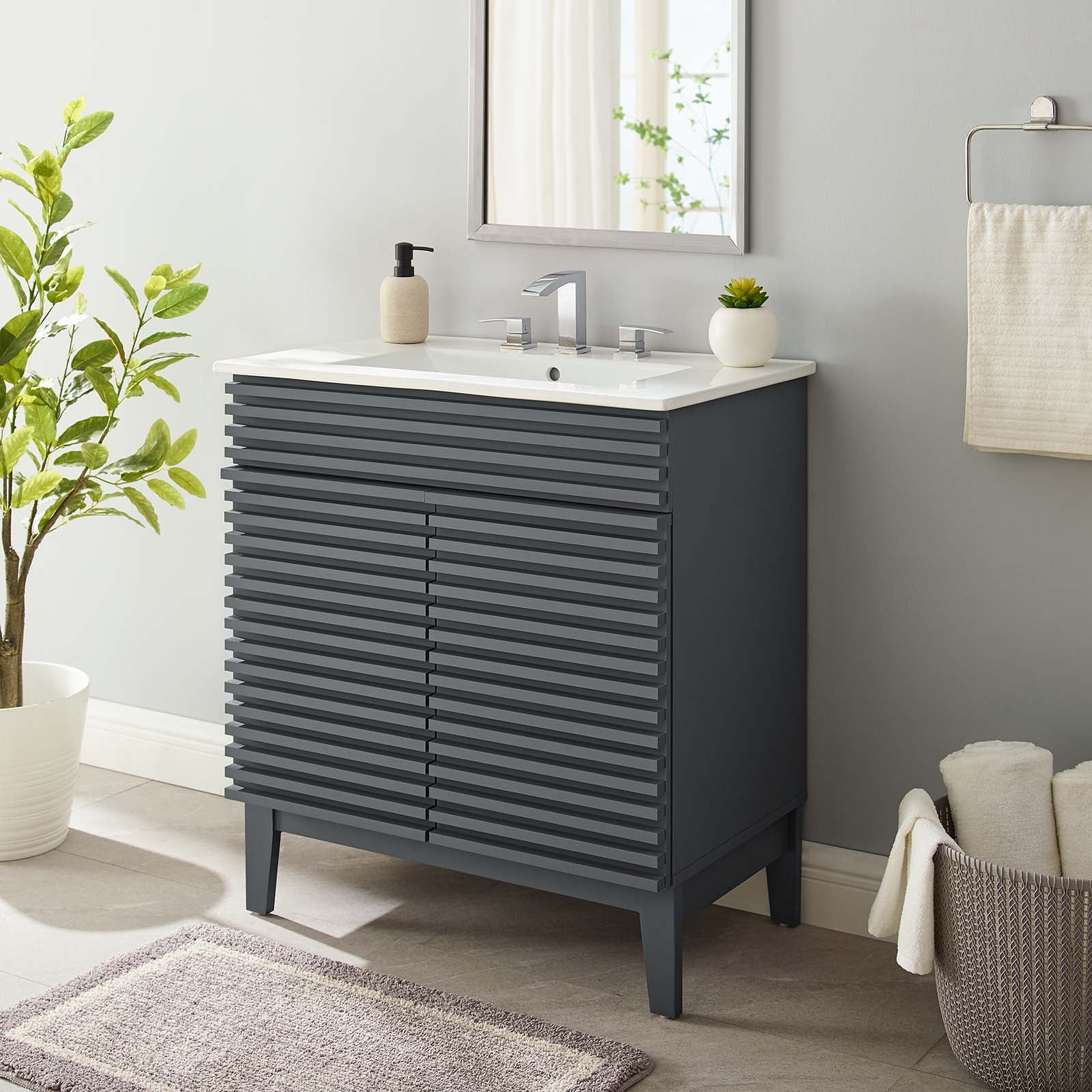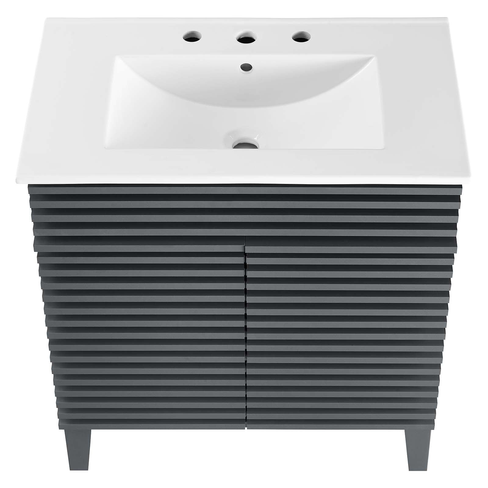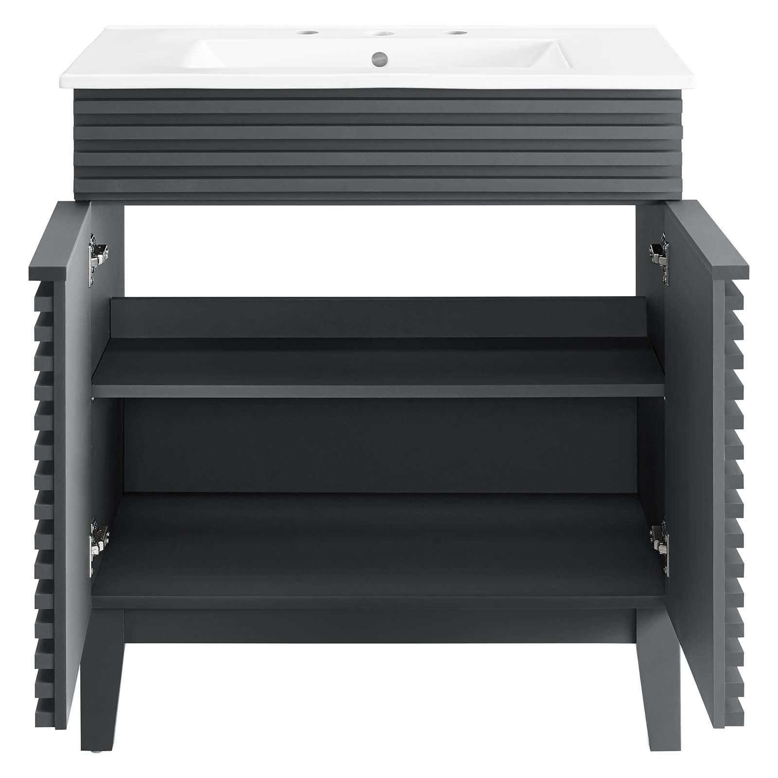 Render 30″ Bathroom Vanity Cabinet-EEI-5422-CHA-WHI Tap into mid-century aesthetics with the Render Vanity. Render Bathroom Vanity features a durable particleboard frame with smooth laminate, four tapered wood legs, and adjustable storage shelf behind two soft-close hinged doors. A curved ceramic basin and integrated countertop with three faucet holes create sleek lines and crisp design for an edgy style designed to meet your needs. Boasting a mid-century modern style this vanity features a solid construction with a pleasing look and practical functionality. 8″ centerset faucet holes. Assembly required and fixtures not included.Set Includes:One – 30″ Ceramic Basin TopOne – 30″ Vanity cabinet