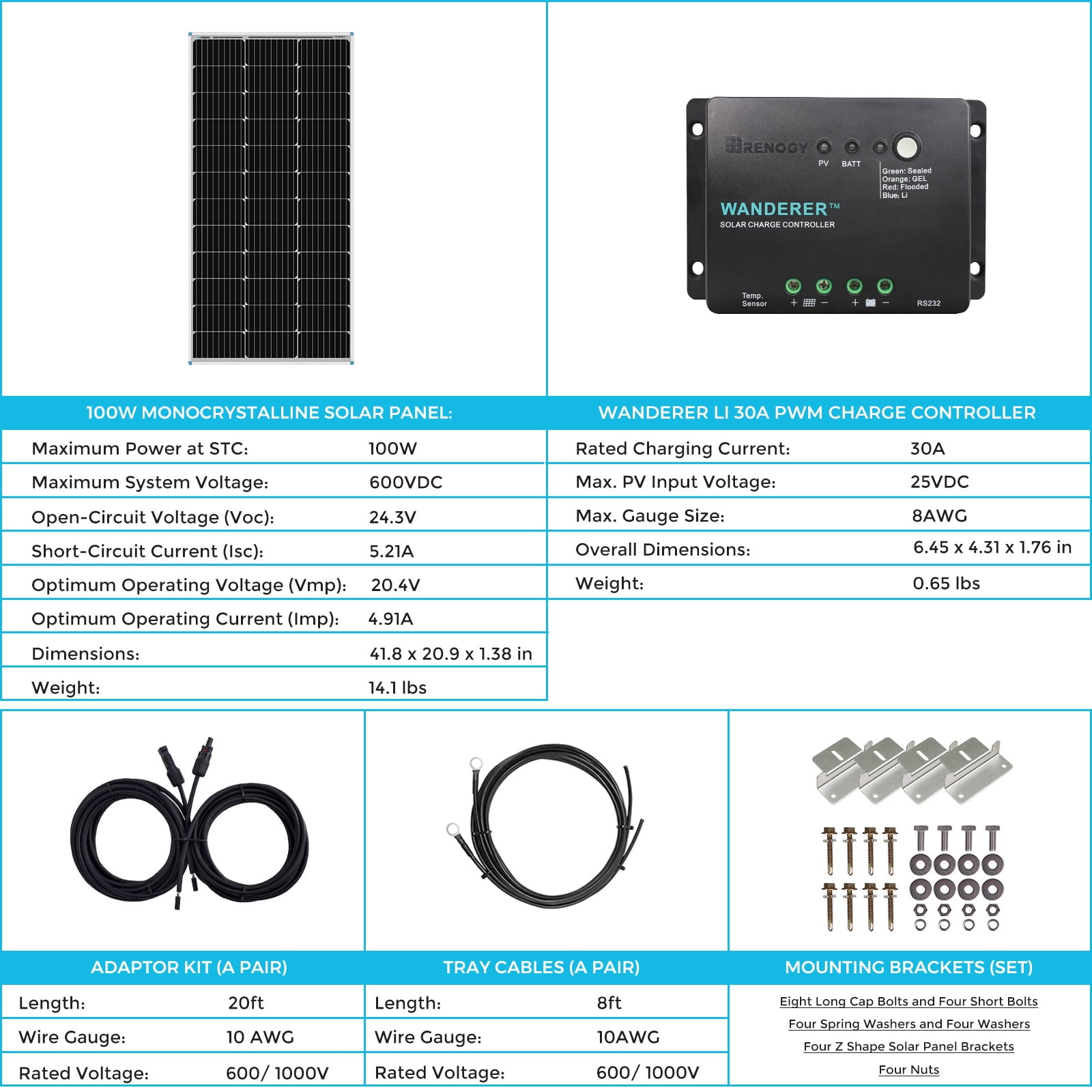 The 200W Solar Panel Starter Kit will produce an average of 1000Wh of electricity per day (Based on 5 hours of direct sunlight condition). The Cell Efficiency can reach 22%. The bypass diodes can ensure the panel has an excellent performance in a low-light environment and the TPT back sheet dissipates excess heat to ensure smooth output performance. Advanced encapsulation material with multi-layered sheet laminations protects cells from physical damage and distortion, improving cell performance and providing a long service life. The Wanderer PWM Charge Controller is compatible with four different types of batteries: Sealed, Gel, Flooded, and Lithium batteries. It also features advanced 4-stage charging (bulk, boost, float, and equalization) to ensure your battery is efficiently and safely charged to 100%. The Wanderer PWM Charge Controller has a number of built-in protections to safeguard your systems, such as reverse polarity protection, battery overcharging protection, overload protection, and short circuit protection. This Renogy 200W Solar Panel Kit includes all of the equipment necessary for building a new system. The included cables, Z-brackets, and pre-drilled holes on the back frame of the panel allow fast and secure mounting. With the Wanderer 30A PWM Charge Controller, the kit can meet your further power needs by adding more of the same solar panels to expand up to 400W. Renogy 100W Monocrystalline Solar Panel: Maximum Power: 100W Maximum System Voltage: 600V DC (UL) Optimum Operating Voltage (Vmp): 20.4V Optimum Operating Current (Imp): 4.91A Open-Circuit Voltage (Voc): 24.3V Short-Circuit Current (Isc): 5.21A Operating Temperature: -40°F to 185°F(-40℃ to +85℃) Dimensions: 41.8*20.9*1.38in(1062x530x35mm) Renogy Branch Connectors: Withstanding Voltage: 1000V DC(TUV), 600V(UL) Protection Degree: IP67, mated Wiring Size Range: 10, 12, 14 AWG Temperature: -40°F to +195°F Mounting Z Brackets (Set): Eight Long Cap Bolts and Four Short Bolts Four Spring Washers and Four Washers Four Z Shape Solar Panel Brackets Four Nuts Renogy 8ft 10AWG Tray Cables (A pair): Length: 8ft AWG: 10 Rating Voltage: 600/1000V Temperature: -40°F to +185°F Renogy Wanderer Li – 30A PWM Negative-Ground Charge Controller: Nominal Voltage: 12 VDC Rated Charge Current: 30A Max. PV Input Voltage: 25 VDC Max. PV Input Power: 400W (12V) PACKAGE INCLUDES: 2 × 100W Mono Panel 1 × Renogy Solar Y Branch Connectors 2 × Mounting Z Brackets 1 × Renogy 20ft 10AWG Solar Adaptor Kit (A pair) 1 × Renogy 8ft 10AWG Tray Cables (A pair) 1 × Renogy Wanderer Li 30A PWM Charge Controller