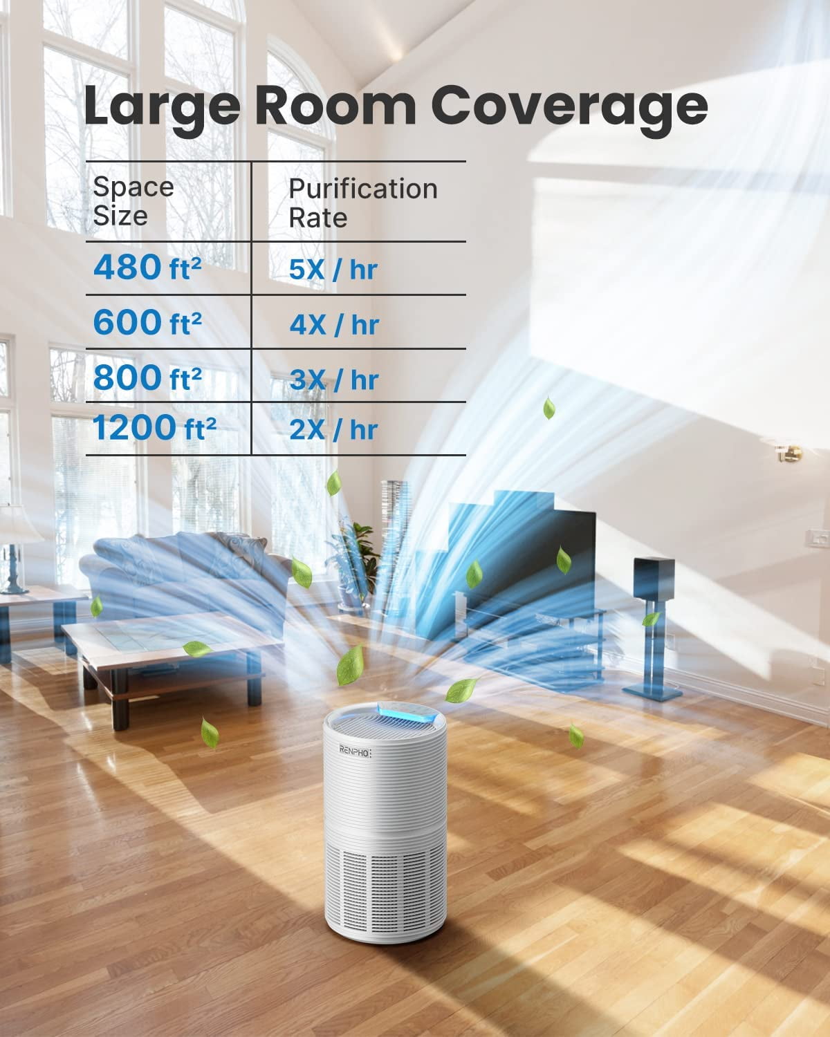 Highlights: DESIGNED FOR LARGE ROOMS: The 360 sleek tower design uses advanced 5-stage filtration with a long-life HEPA filter. Renpho air purifier filters and circulates air in prescribed room size, up to 5 times per hour. The purifying efficiency is 30% higher and purifies speed is 30% faster than other ordinary air cleaners. Cleans large room about 480 sq.ft every 12 minutes, twice as fast as key competitors on speed. REAL-TIME AIR QUALITY DISPLAY: Renpho pollution sensor Imported from South Korea communicates indoor air quality by changing the color of LED in real-time, While auto mode automatically optimizes the speed setting 1 through 4. TIME OPTION: Whether you are saving energy or finding the best setting for you, we’ve included a timer function to fit your needs. A timer is available for 2/4/6/8 hours to consider your convenience. DESIGNED FOR SWEET DREAMS: It is very quiet at sleep mode with only 26db, you can sleep in a restful and soothing bedroom in a dark environment. In addition, Using this HEPA air purifier can relieve allergies and asthma symptoms and make you feel relaxed all night. SMART FILTER CHANGE REMINDER: Built-in Replacement Indicator lets you know that you need to replace the filter. Comparing the prices of other brands’ replacement filters, you can save much with Renpho filters for different demands. STRETCH YOUR DOLLAR: The Corona loss associated with DC is negligible, the air Cleaner consumes as little as 2W of electricity. Running this air purifier 24 hours a day for an entire year can cost as little as 6 dollars up to 30% less than other air purifiers. Specifications: Power Supply: AC120V 60Hz Product Size: 9.8 x 9.8 x 17.2 inches CADR: 176CFM(300m³/h) Air quality sensor: Yes AQ Light: Blue, Green, Orange, Red Mode: Auto, Sleep Speed Setting: 4, 3, 2, 1 Timer: 2H, 4H, 6H, 8H Child Lock: Yes Lowest Noise Level: Filter Replacement Indicator: Yes Filter Level: HEPA 13 Type of Filter: Pre filter+H13 True HEPA + Activated Carbon Filter Certified: ETL, CARB, CARB (California Air Resources Board) Effective Range: 480 ft2 Smart Control: None What’s in the Box: 1 x Air Purifier 1 x User Manual