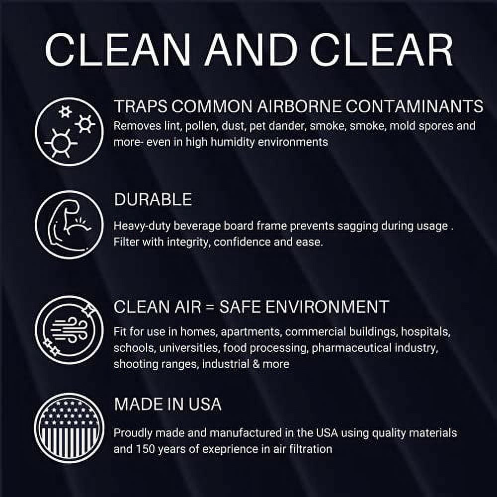 The Rensa MERV 11 is a pleated air filter that uses electrostatically charged synthetic media to trap airborne contaminants like lint, pollen, mold spores, pet dander, smoke, bacteria, virus carrying particles and more. Its heavy-duty beverage board ensures filter integrity even in high humidity environments! Use with confidence in a variety of spaces. From homes, apartments, commercial buildings, hospitals, schools, universities and more. With more than 150 years of experience in the air filtration industry, Rensa is dedicated to keeping your home and work spaces clean and clear. Rensa proudly makes and manufactures the MERV 11 in the USA, offering you the best-in-class solutions to keeping your home or workspace safe, thanks to Rensa’s quality materials and industry expertise.
