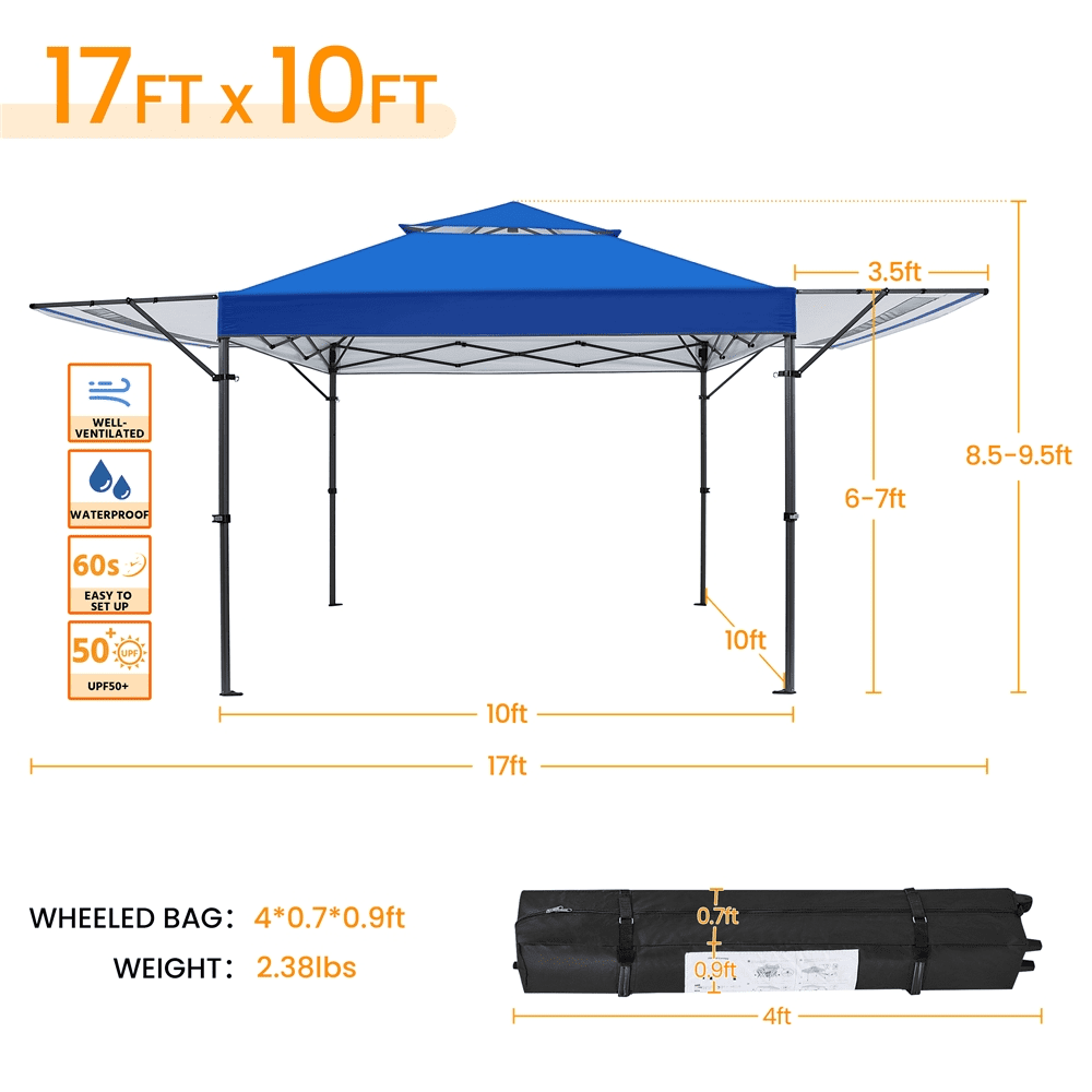 Renwick 10 × 17 ft Pop-up Canopy Tent w/ Side Awnings and One-handed Setup, Blue: Canopy color: Blue Material: powder-coated steel, oxford fabric Overall dimensions (with 90° awning angle): 17ft L x 10ft W x 8.5ft-9.5ft H Overall dimensions (without awnings): 10ft L x 10ft W x 8.5ft-9.5ft H Wheeled bag: 10.6″ L x 9.3″ W x 50.4″ H N.W.: 53.6lbs G.W.: 57.5lbs Please allow errors due to the manual measurement. Please don’t use this canopy in a strong breeze, heavy rain or other extreme weather conditions. Please set the awnings at a tilt angle of 45° when using the canopy in light rain.