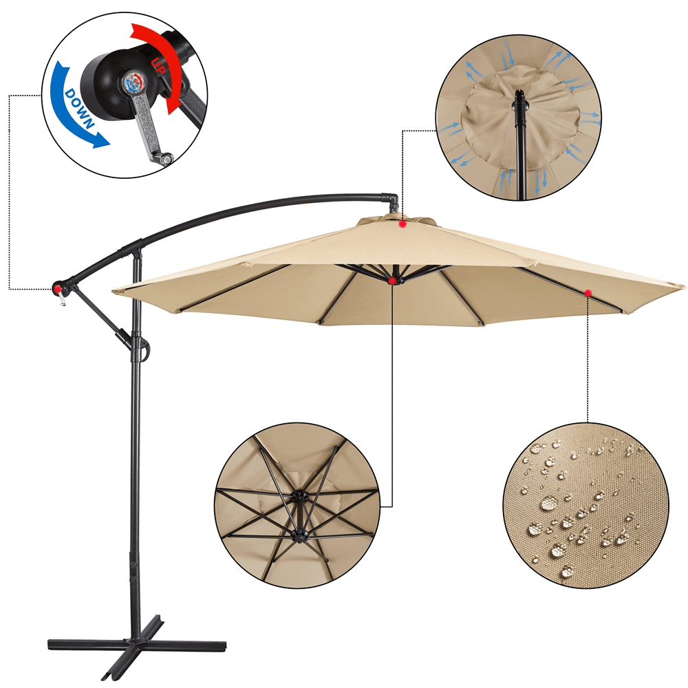 Renwick 10ft Offset Cantilever Patio Hanging Umbrella, Tan Materials: Polyester Fabrics, Iron Color: Tan Diameter of Umbrella: 114″ Highest Point to the Ground: 97″ G.W.:30lb; N.W.:26.3lb Please allow 0.5 inch errors due to manual measurements. Assembly Required Outdoor Use