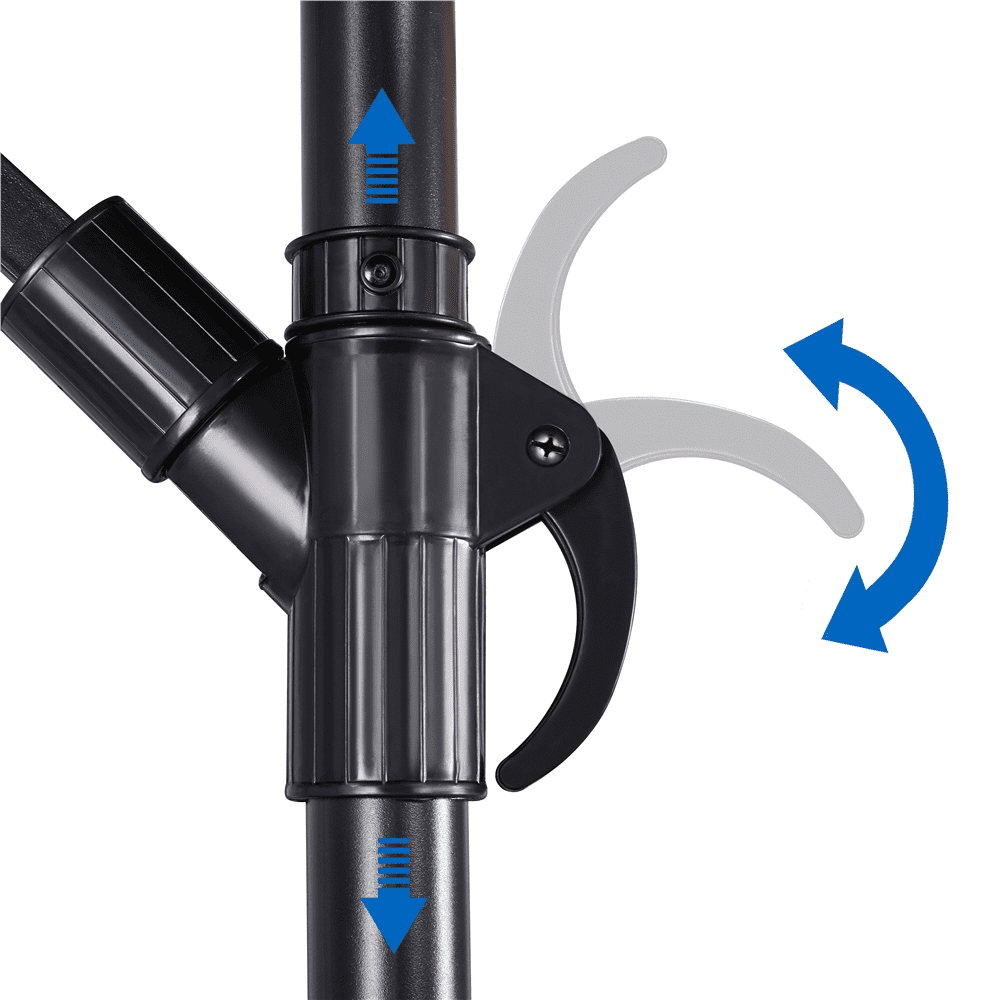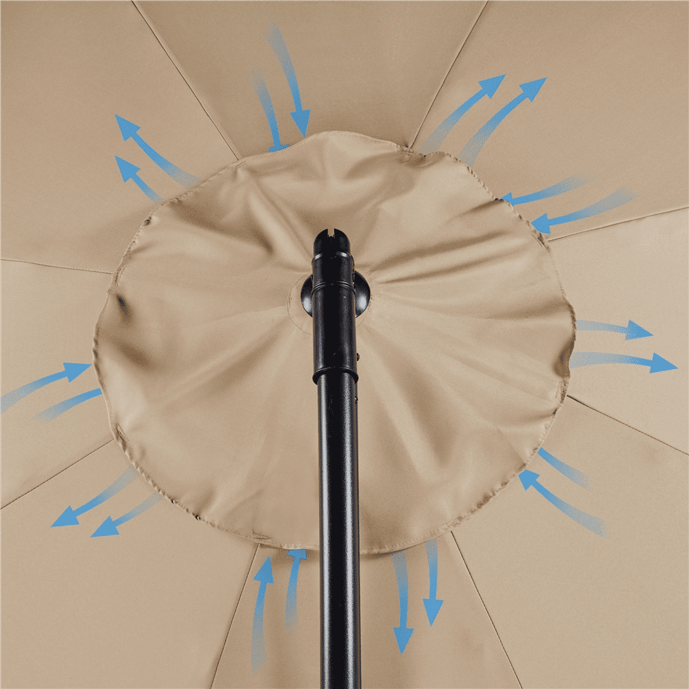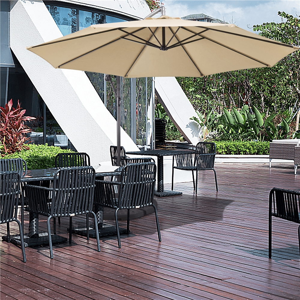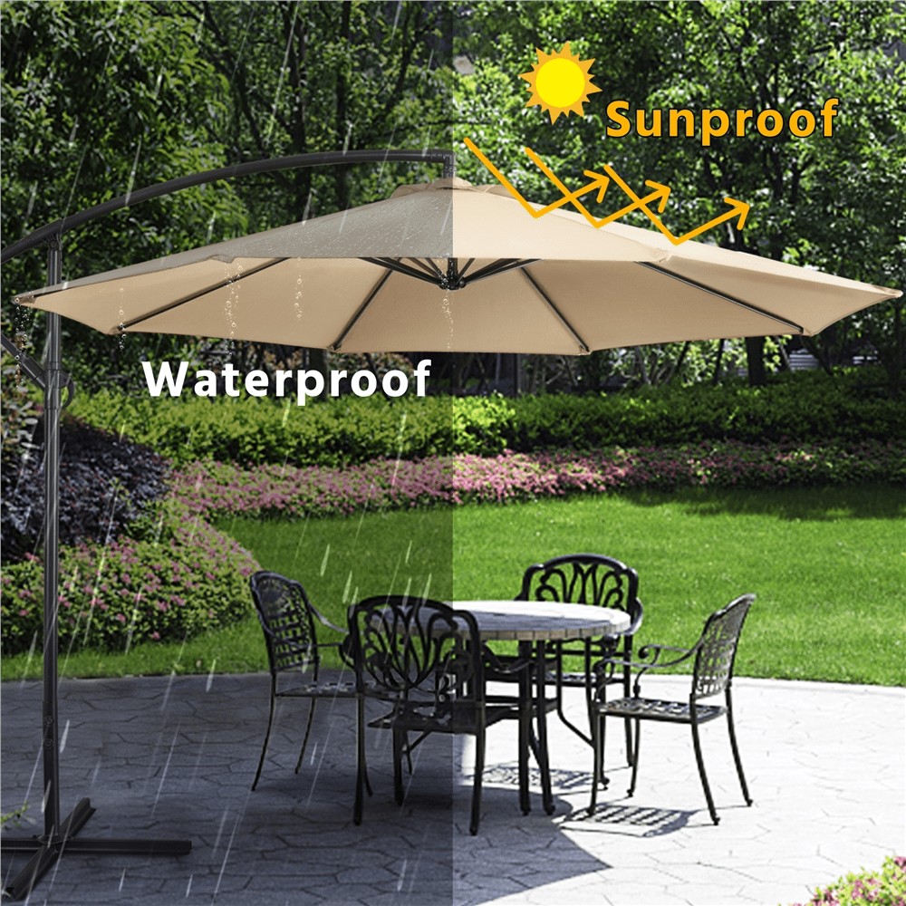 Strong sunlight exposure and rainy season always make us put off all the patio gathering, well, not this time with our patio hanging cantilever umbrella! Our outdoor offset umbrella is constructed of sturdy metal that hard but lightweight, durable enough to have a long lifespan. Polyester canopy serves high intensity, it does not break or change shape. 8 open spot on the top of the canopy for better airflow. Rust-resistant coating provides all-weather protection. Large sized canopy gives wider shading space. Cranking system is easy to use and require less assembling steps. Stable crossed base make sure this patio offset cantilever umbrella is stable and anti-collapse, it is also compatible with our patio umbrella base to be a complete set.