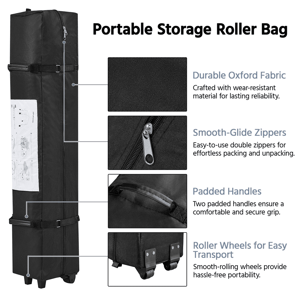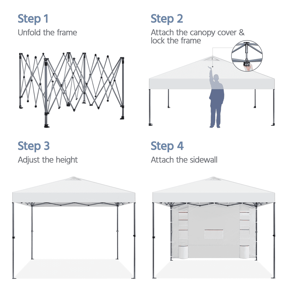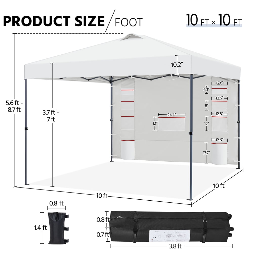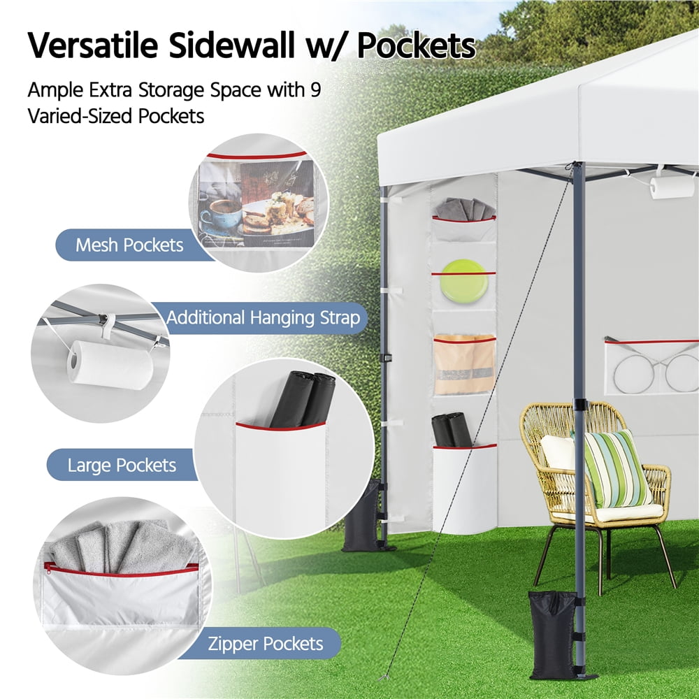 Renwick 10×10 Ft Instant Pop Up Canopy with Storage Sidewall, White: Canopy Color: White Materials: Powder-Coated Steel, Polyester Fabric Assembled Dimensions: 10′ L × 10′ W × 5.6-8.7′ H Roller Bag: 9″L × 8.5″W × 45.7″H Zipper Pocket: 12.6″L × 6.3″W Small Mesh Pocket: 12.6″L × 8″W Medium Mesh Pocket: 12.6″L × 12″W Large Mesh Pocket: 24.4″L × 12″W Large Pocket: 17.7″L × 12.6″W Item Weight: 39.6 lb Shipping Weight: 42.1 lb All-Weather Protection Convenient Multifunctional Sidewall