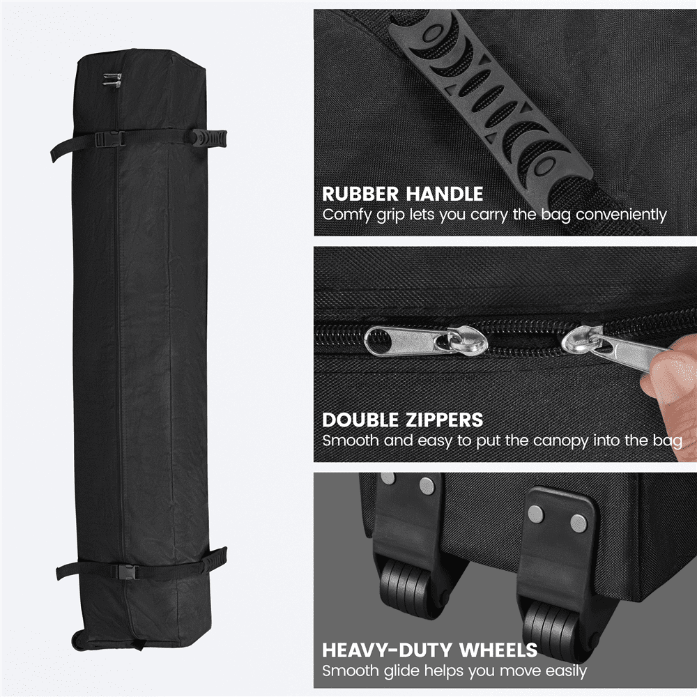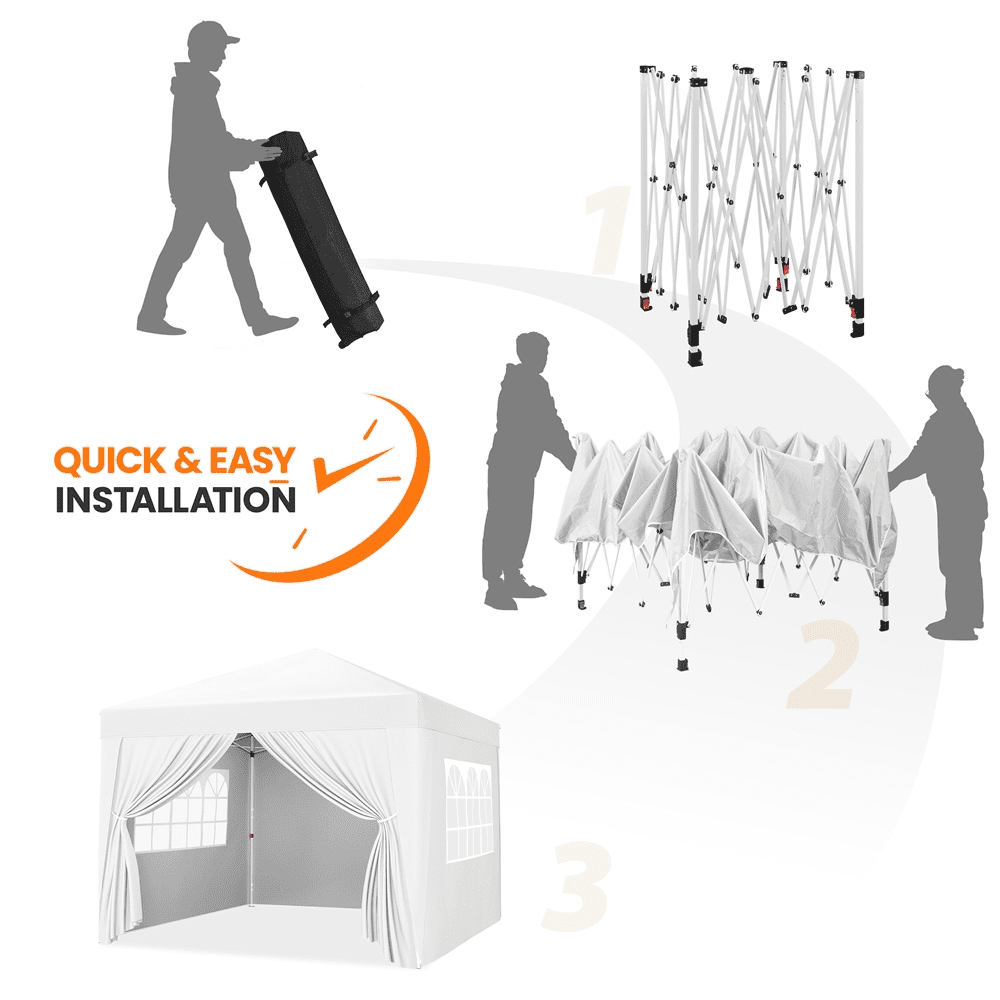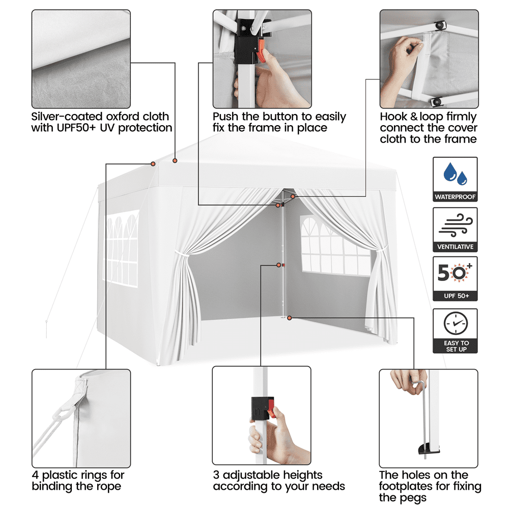 Renwick 10×10 ft Pop Up Canopy Tent with 4 Sidewalls, White: Material: Metal and oxford cloth Color: White Overall size: 10x10x8.3/8.6/9ft (LxWxH) Wheeled bag size: 45.3x10x8inch (LxWxH) N.W.: 32.2lb G.W.: 35.3lb