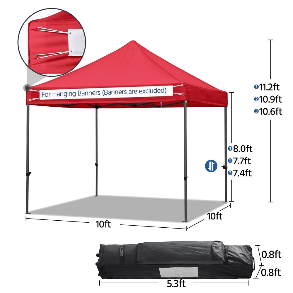 Renwick 10x10ft Commercial Pop-up Canopy Tent with Wheeled Carry Bag, Red: Canopy Color: Red Material: 500D Polyester, Steel Assembled Dimensions: 10′ L × 10′ W × 10.6-11.2′ H Eave Height: 6.5-7′ Storage Bag: 10.2″L × 10.2″W × 64″H Banner Section: 10′ W × 1′ H Item Weight: 50 lb Shipping Weight: 55.2 lb