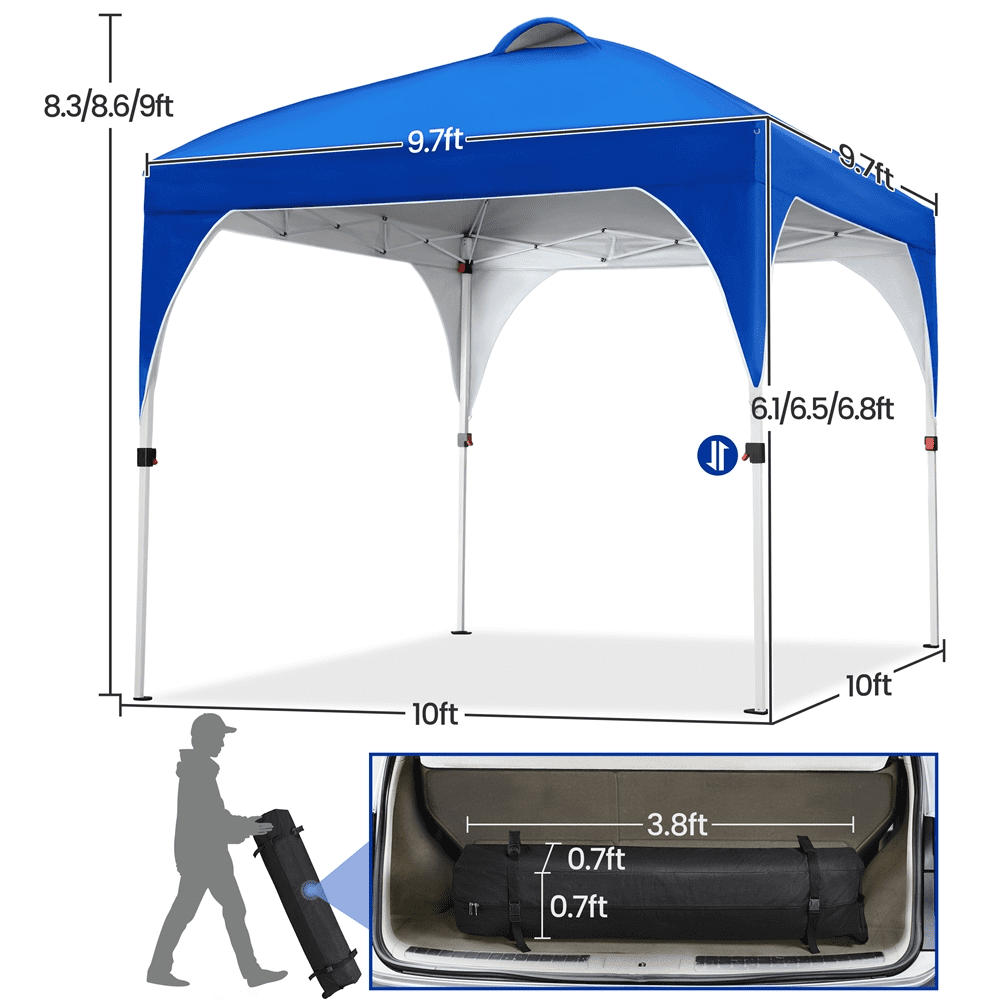 Renwick 10x10ft Outdoor Instant Pop-Up Canopy with 4 Sand Bags, Blue: Canopy Color: Blue Materials: Powder-coated Steel, Polyester Fabric Assembled Dimensions: 10′ L × 10′ W × 8.8-9.4′ H Adjustable Canopy Height: 8.8′, 9.1′, 9.4′ Roller Bag: 10″L × 8″W × 45.3″H Item Weight: 32.6 lb Shipping Weight: 35.3 lb Assembly Required Outdoor Use