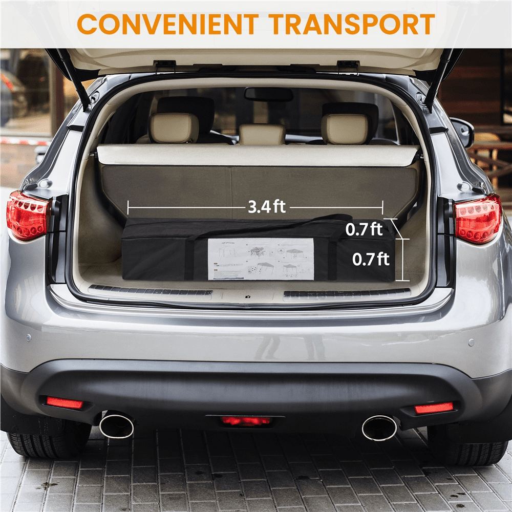 Canopy Color: White Materials: Powder-coated Steel, Polyester Fabric Assembled Dimensions: 10′ L × 10′ W × 5.2-8.9′ H Adjustable Canopy Height: 5.2′, 7.6′, 8.9′ Carry Bag: 8.3″ L × 8″ W × 41″ H / 0.7′ L × 0.7′ W × 3.4′ H Item Weight: 23.4 lb Shipping Weight: 25.9 lb Set Includes: 1 Canopy 1 Carry Bag 4 Guy Lines Note: For safety, please do not use the canopy under bad weather conditions. Please allow 2cm/0.8inch error due to manual measurement. Material: Silver-coated oxford cloth and plastic-sprayed metal Color: White N.W.: 28.7lb G.W.: 31.1lb Overall size: 10ft L x 10ft W x 8.5ft H Carry bag size: 51.2inch L x 7.5inch W x 7.5inch H For safety, please do not use the canopy under bad weather conditions. Please allow 2cm/0.8inch error due to manual measurement. Assembly Required Outdoor Use