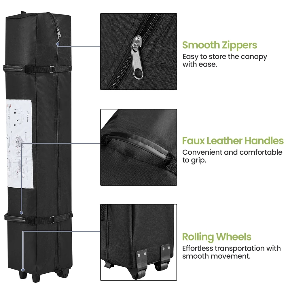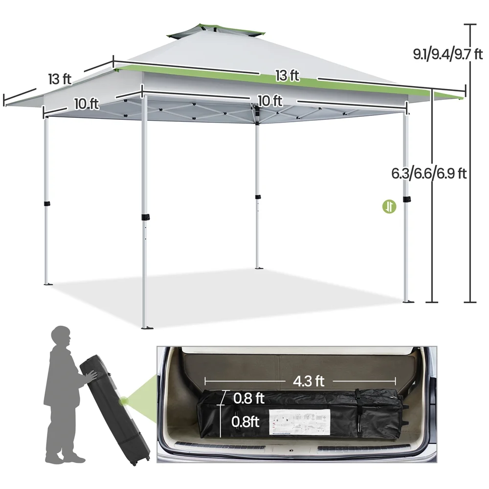 Renwick 13 Ft L and 13Ft W Outdoor Portable Pop Up Canopy with Rolling Storage Bag, Light Gray/Green: Canopy Color: Light Gray/Green Materials: Powder-Coated Steel, Polyester Fabric Assembled Dimensions: 13′ L × 13′ W × 9.1-9.7′ H Adjustable Canopy Height: 9.1′, 9.4′, 9.7′ Rolling Storage Bag: 10″L × 9″W × 51.2″H Item Weight: 46.5 lb Shipping Weight: 50.4 lb Height-Adjustable Canopy for Flexibility Weather-Resistant Materials