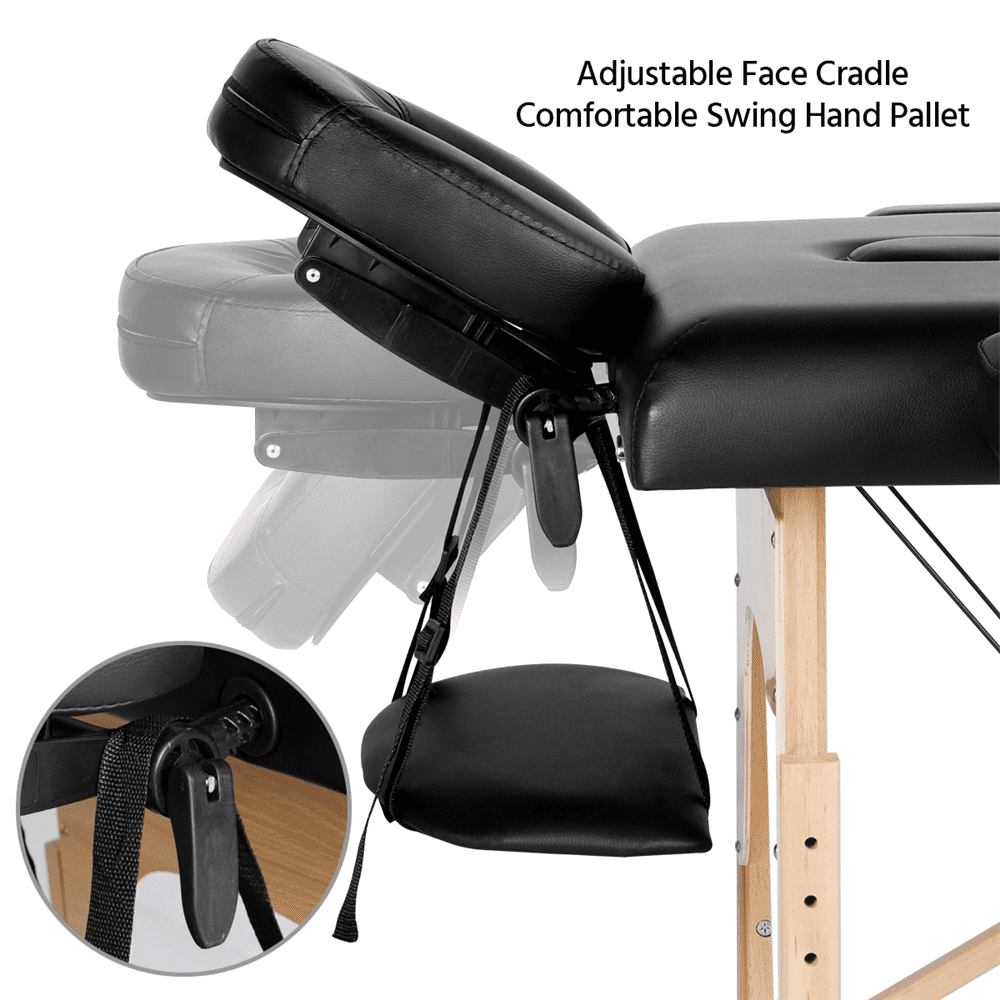 High-strength steel wire ropes connect the massages bed strongly, which can withstand the weight of 250kg/551lb. This massage bed features a foldable design, so you can fold it up when not in use, which is very convenient for home use. There are two twisting adjustment knobs on each leg for 8 kinds of different height adjustments. The height of the massage table can be adjusted from 25″ to 33.5″. This folding massage bed has a face cradle, a swinging hand pallet, two armrests, and a breathing hole. These accessories are removable and adjustable. The headrest faces the cradle and is removable if you do not need it. It is adjustable for different heights or angles, too. The headrest adopts a quick-fix locking device, through which the angle of the headrest can be adjusted.