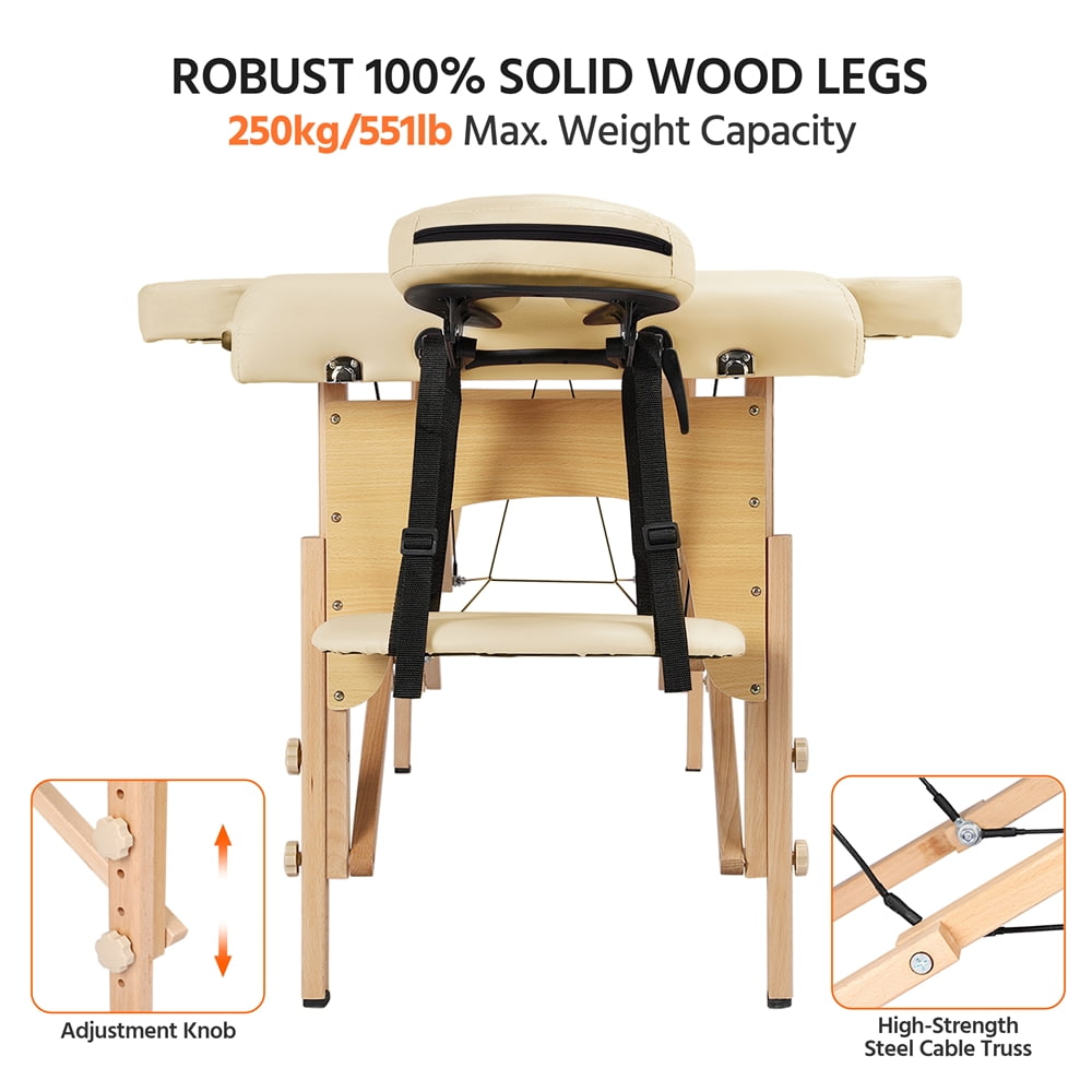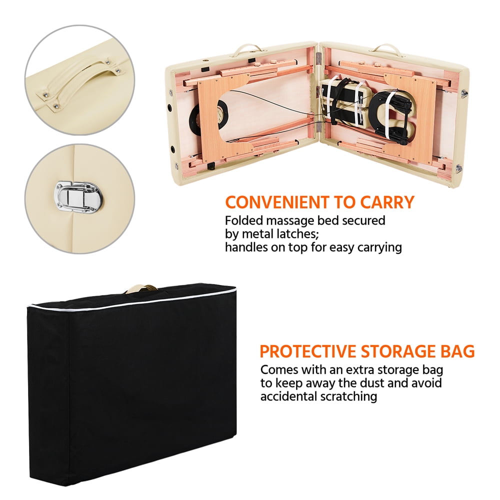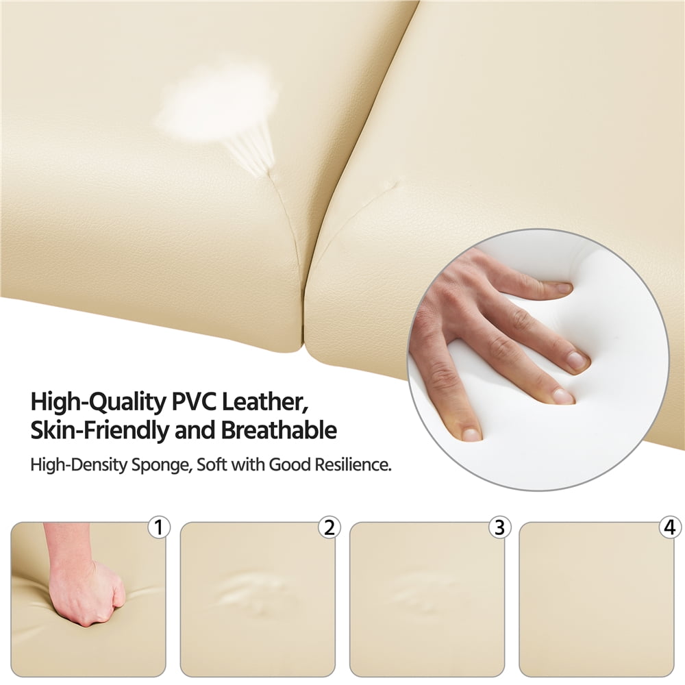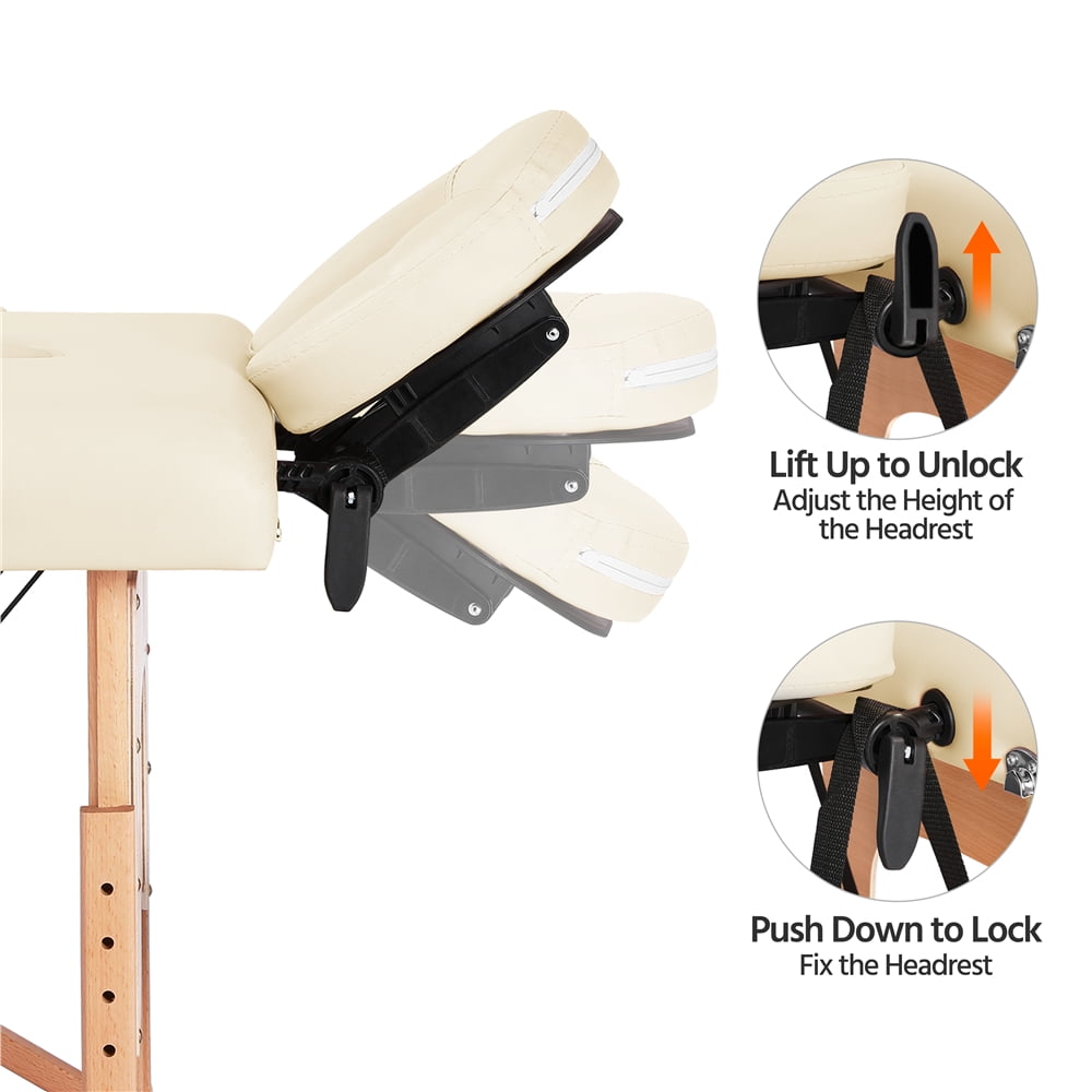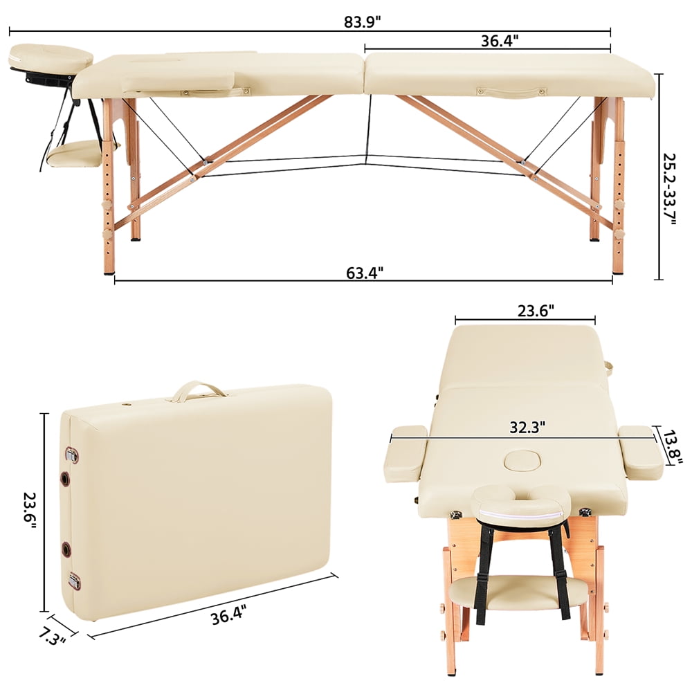 Renwick 2 Sections Adjustable Folding Massage Bed with Headrest,Cream: Materials: Beech Wood Leg + Composite Board + Cushion (Plywood + Non-woven Fabrics + Foam + PVC ) Color: Cream The Thickness of Foam:2inch Unfold Size: 84 x 32.3 x 25.2-33.7inch (L x W x H) Folding Size:36.4 x 23.6 x 7.3inch (L x W x H) Headrest Size:11 x 10.4 x 3inch (L x W x H) Armrest Size: 14 x 4.3 x 2inch (L x W x H) The Thickness of foam: 2inch Max. Load Bearing: static, 551lb; dynamic,220lb G.W.: 33lb Assembly required Adjustable Massage Bed Color: Cream
