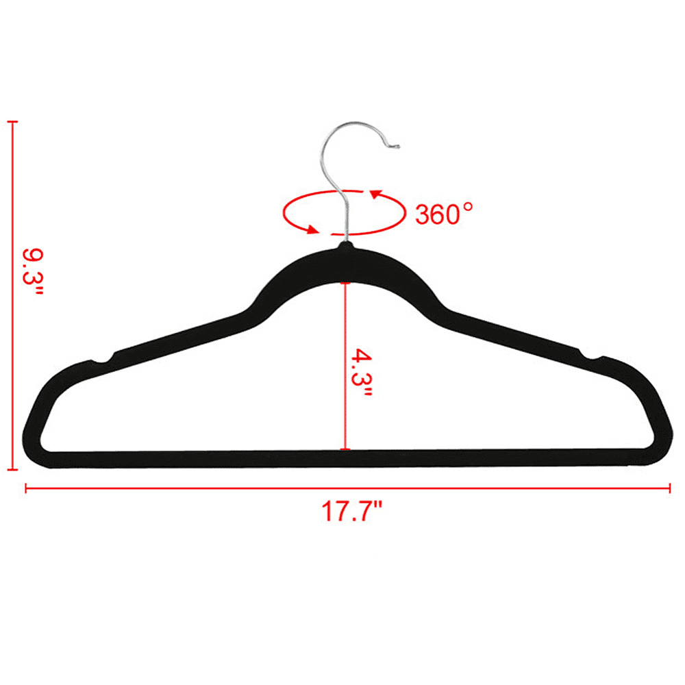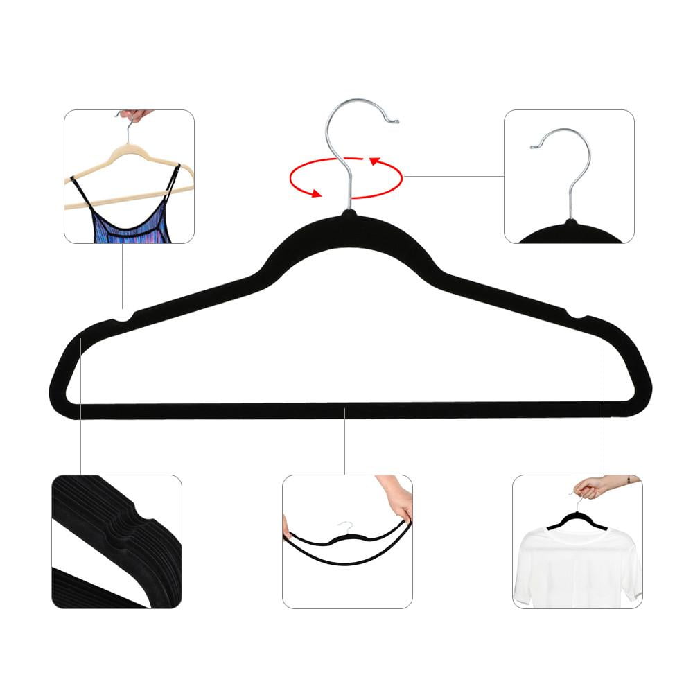 Renwick 200 Pieces Non Slip Velvet Hangers, All Ages, Black: Thoughtful Designs: Contoured shoulder line helps preserve clothes shape and avoid creases. The notches help keep straps in place, a special design for your slip dress and camisoles Notched Arms: Features notched arms, these velvet hangers can hold small straps and keep blouses in place Versatile Hangers: No matter for domestic use or for commercial use, this hanger set is an ideal and nice-looking choice for your needs Extra Hanging Space: The upper tie bar design collects your accessories like ties, bowknots and scarves Premium Materials, High Loading Capacity: Organize your closet effortlessly with our velvet hangers. These hangers offer durability and long-lasting performance with a high loading capacity of 11 lb as they are crafted of selected materials. Say goodbye to messy wardrobes and hello to a tidy space Specifications: Dimension (Approx.): 17.7 × 9.3 × 0.2’’ (L×W×Thickness); Load Capacity (Each Hanger): 11lb