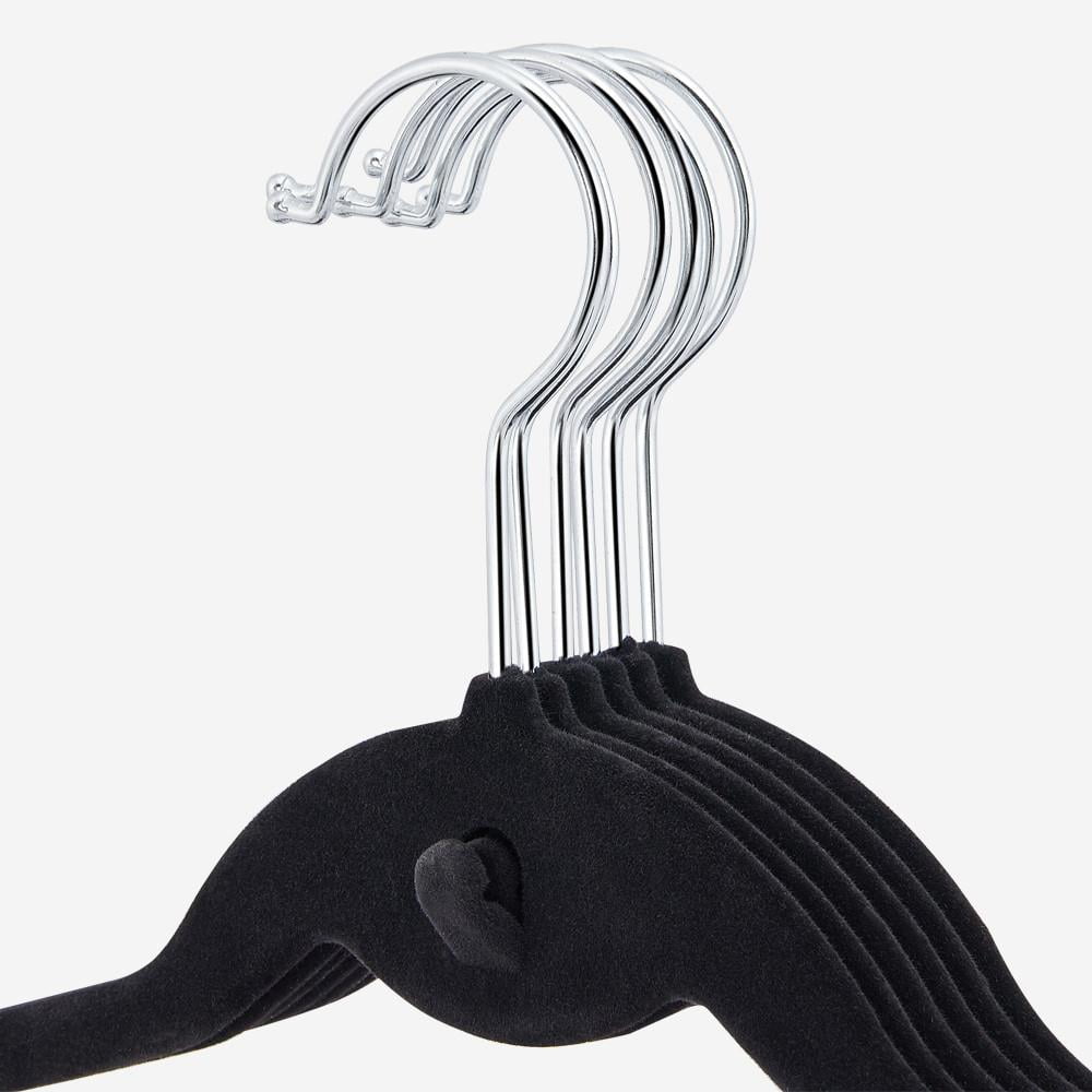 Renwick 200 x Cascading Non Slip Velvet Hangers, Black: Material: ABS Velvet Coating & Zinc Alloy Hook Overall Size (Approx.):17.7 x 9.3 x 0.2” (LxWxThickness) Hook (Approx.): 3.1 x 2.2” (LxW) Wire Diameter:0.1” Max Load (Each Hanger): Approx. 7 Lb G.W. (Approx.):35.2 Lb