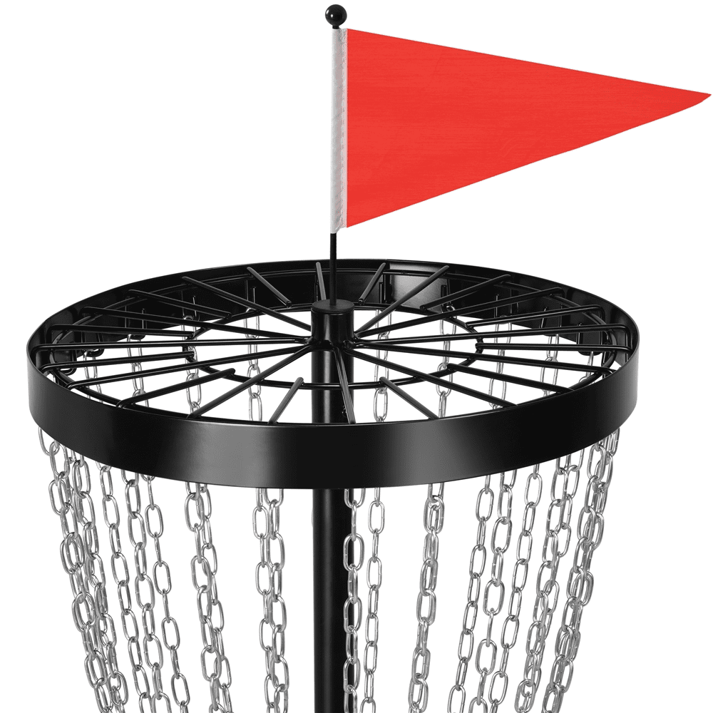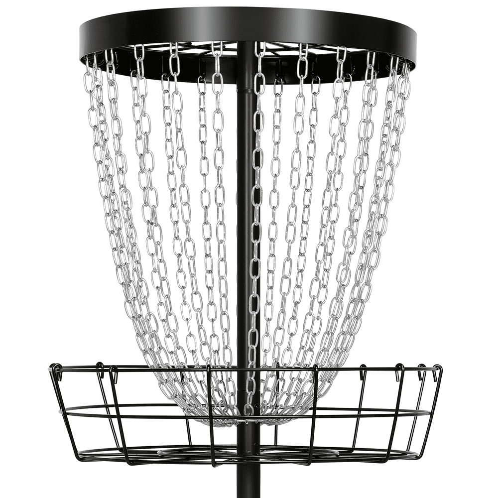 Renwick 24-Chain Disc Golf Basket Flying disc Golf Basket with 3 discs, Black: Color: black Material: steel frame, galvanized steel chains, 600D oxford fabric storage bag Package content: 1 disc golf basket, 1 carrying bag, 3 discs (1 red, 1 blue, 1 yellow), 3 ground stakes, accessory kit Overall dimensions (flag not included): 25.5” L x 25.5” W x 53” H Basket size: 25.5” Dia. x 7’’ H Base diameter: 22’’ Ground clearance: 24’’ N.W.: 26.4 lb G.W.: 31.6 lb Please allow a 0.5” measurement tolerance. Assembly Required Residential Use