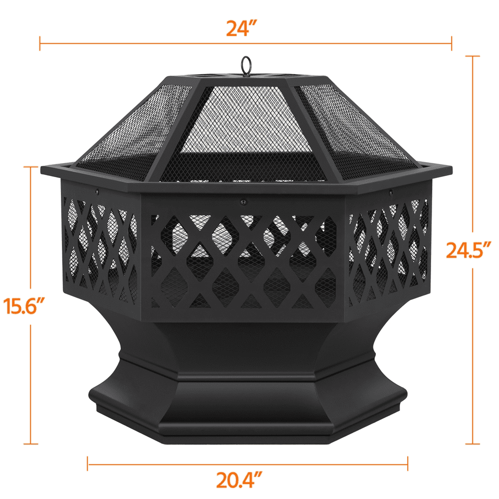Color: Black Materials: Metal Fuel Type: Charcoal, Firewood Assembled Dimensions (w/ lid): 24” L × 24”W × 24.5”H Fire Pit Height (w/o lid): 15.6” Fire Bowl (inside): 21.4” L × 21.4” W × 8”D Distance Between Fire Bowl & Ground: 7.5” Fire Poker Length:20” Item Weight: 15 lb Shipping Weight:21 lb Safety Tips: 1. Please use this fire pit on non-combustible surfaces such as cement ground, rocks, or sand for your safety. 2. Please don’t use it on lawns, wooden decks, or in any enclosed room.