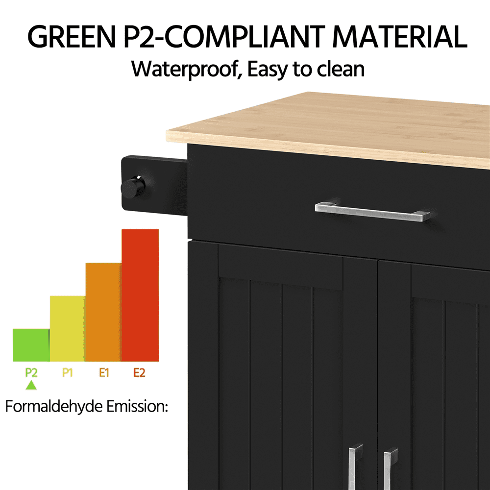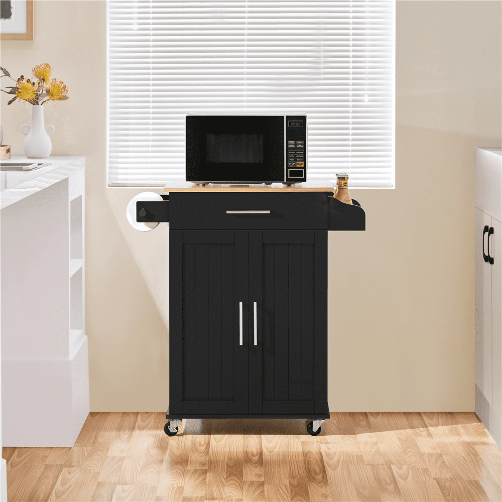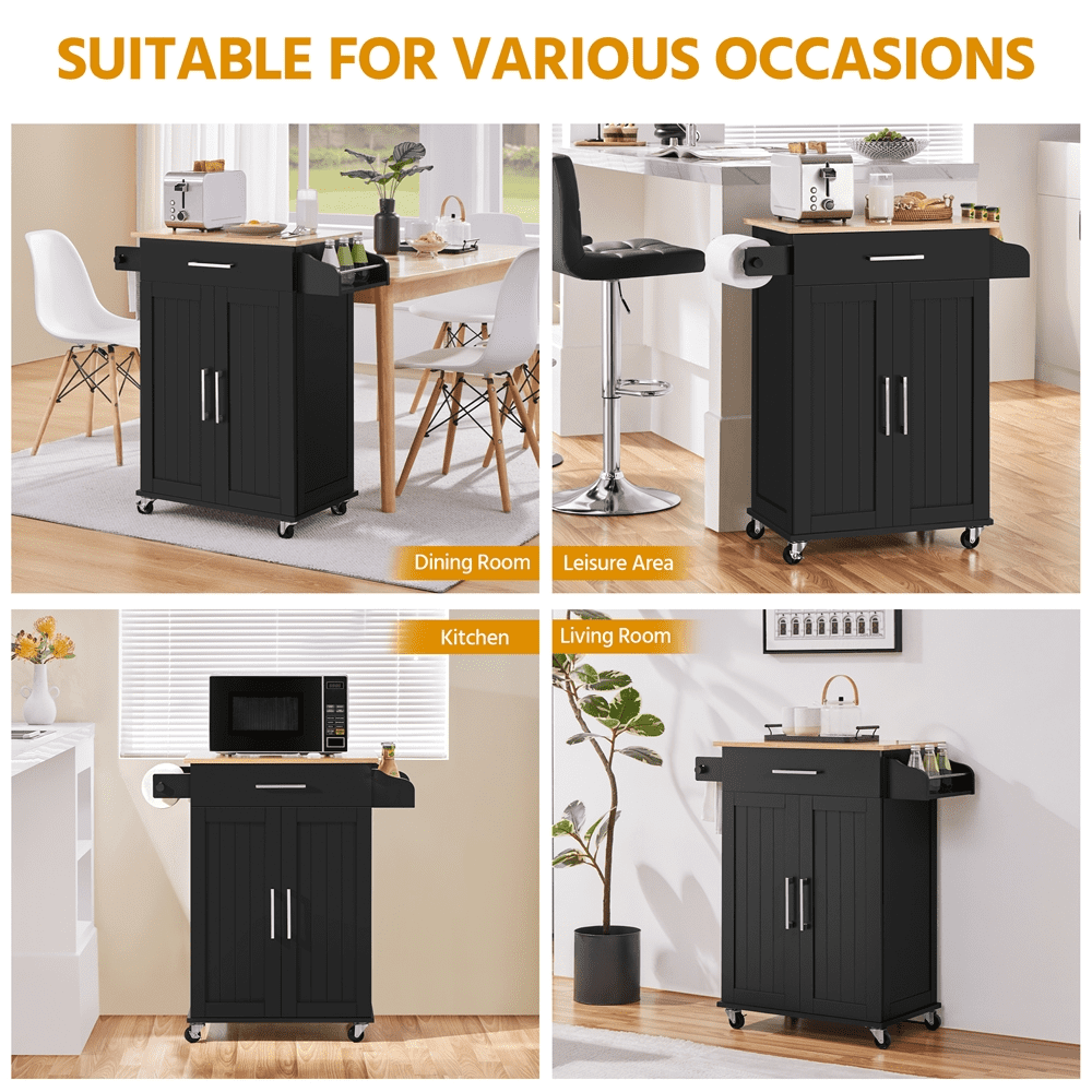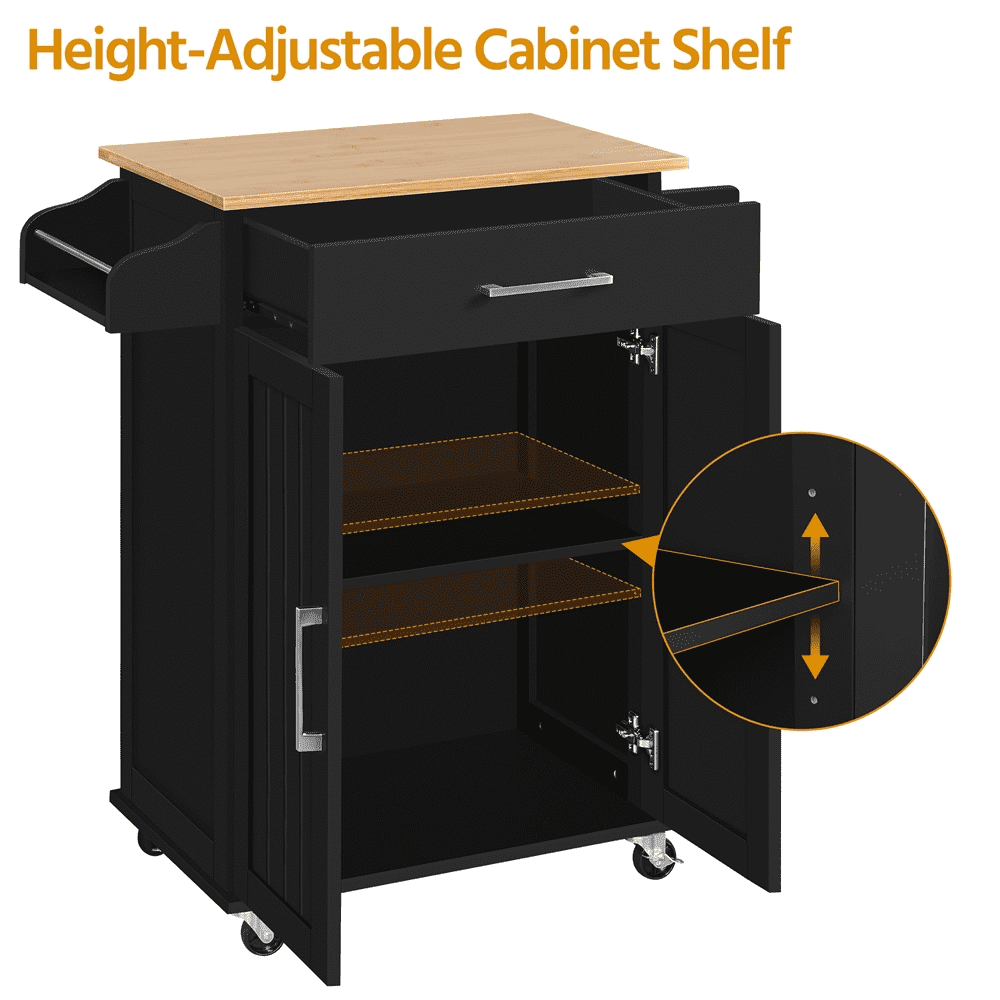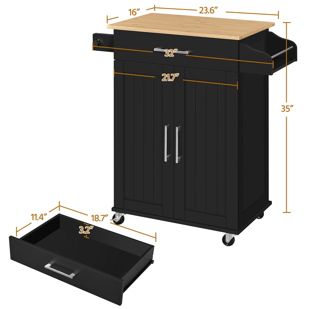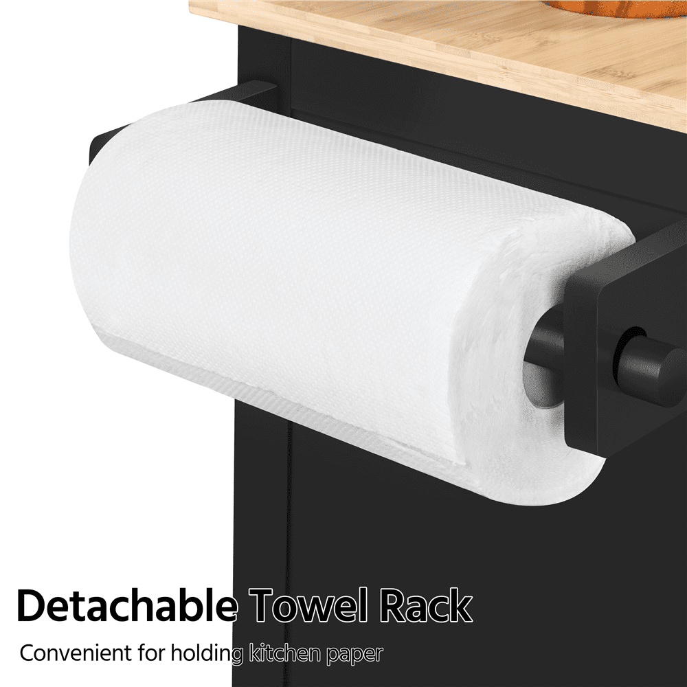 Multipurpose Storage: The kitchen cart features a slide-out drawer under the top and a storage cabinet on the bottom. You can store kitchen accessories in the cabinet and small tableware in the drawer Versatile Design: Designed with simple color and realistic wood grain countertop, this kitchen island cart features an aesthetic modern look and can be fit into the kitchen, dining room, and living room Easy Cleaning: The water-resistant varnished countertop and painted stand make cleaning the kitchen island cart a breeze. With a wet cloth, you can wipe dirty stains easily from the smooth surface Elegant Decor: This rolling kitchen organizer is a stylish and solid cabinet with wheels that can fit into any contemporary kitchen. It will not only help organize but also add elegance to your home Multi-purpose Rack: The detachable towel rack on this kitchen island can hold towels, be detached to hold the kitchen paper roll, or be used as a handle to push the cart, providing convenience in the kitchen Specifications: Materials: Engineered Wood, Solid Wood, Metal; Color: Black; Assembled Dimensions: 32″” L × 16″” W × 35″ H; Maximum Weight Capacity: Countertop: 93 lb, Drawer: 11 lb, Shelf: 33 lb, Bottom Shelf: 33 lb, Spice Rack: 7 lb