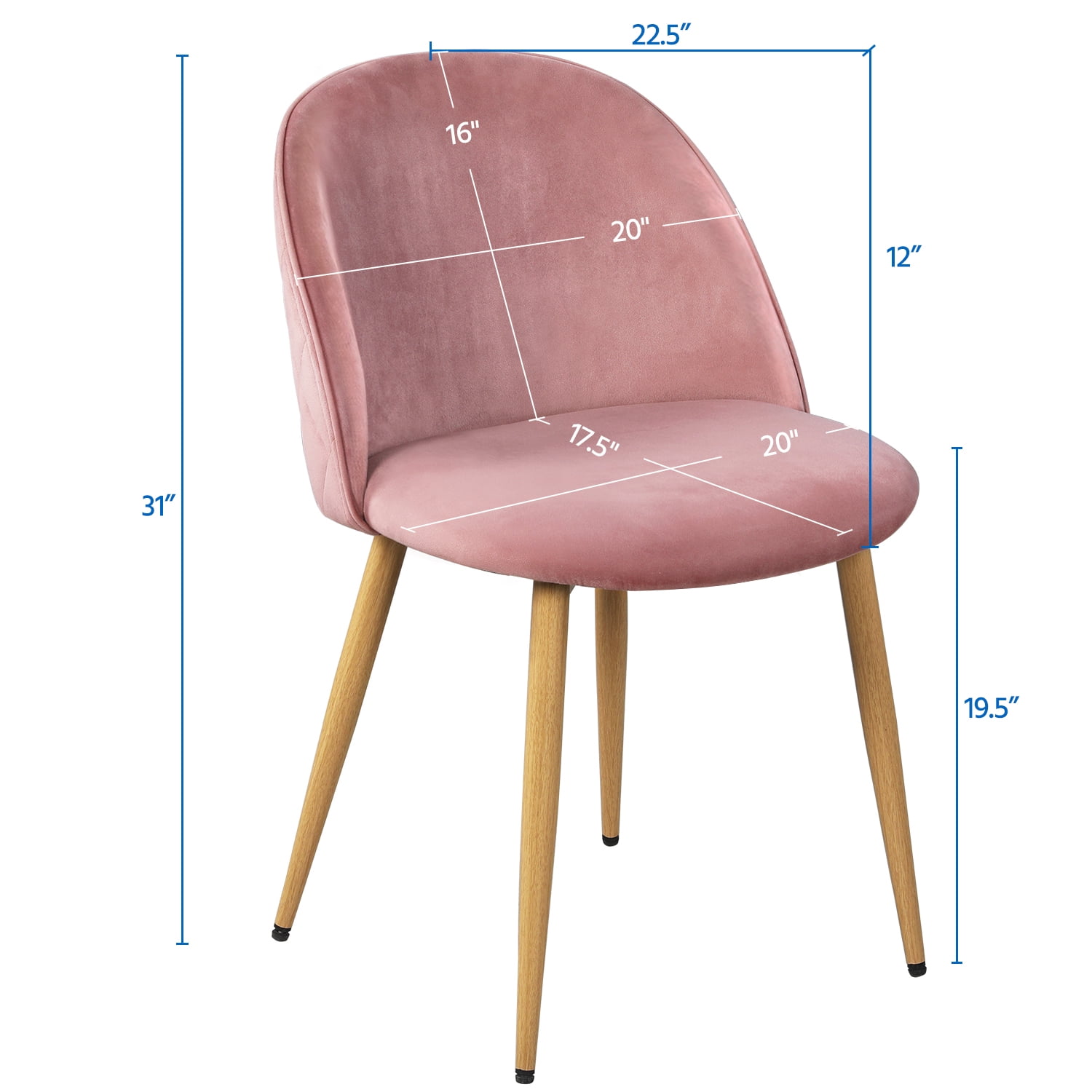 Renwick 2pcs Velvet Dining Chairs with Backrest for Kitchen, Pink Qty: 2PCS Color: Pink Material: Velvet, plywood, foam, nonwoven fabric and metal Overall size: 20” L x 22.5” W x 31” H Seat Depth: 17.3” Max. weight capacity: 298lb G.W.:33lb N.W.: 28lb