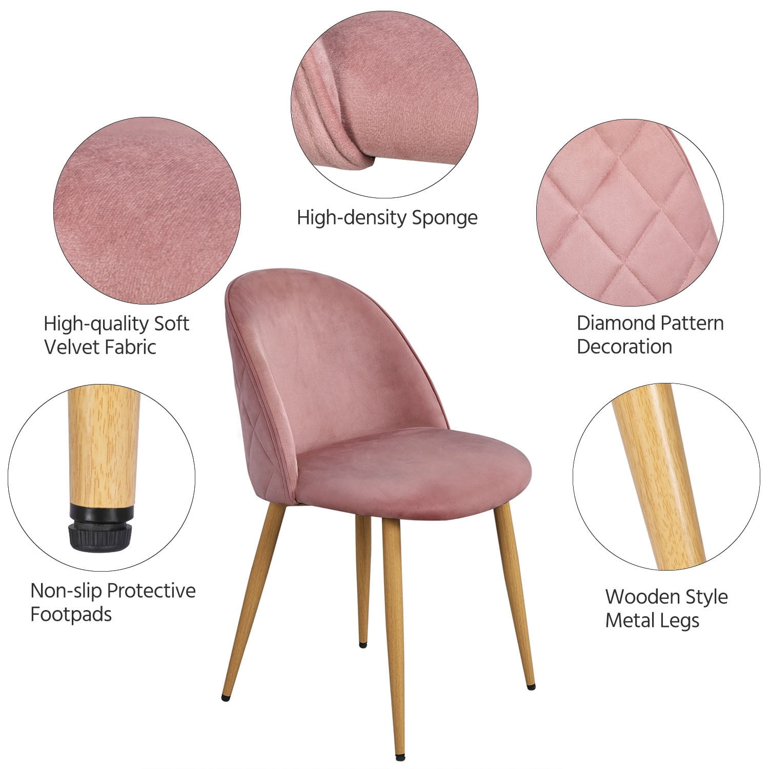 This set of 2 dining chairs are made of foam, nonwoven fabrics, velvet, plywood, and metal. Offer you a soft seat, comfortable backrest and durable metal legs. Each kitchen chair can bear up to 298lb. The legs of the dining chairs are made of metal and covered by spraying plastics, which makes them like wood but very sturdy. The whole style perfectly matches the cushioned seat, durable, sturdy and good-looking.The dining chairs come with the footpads at the end of the chair legs. The footpads aim to achieve protection and the adjustment on uneven ground or floor. This chair is suitable for the living room, kitchen, restaurant, cafe, bedroom, office and so on