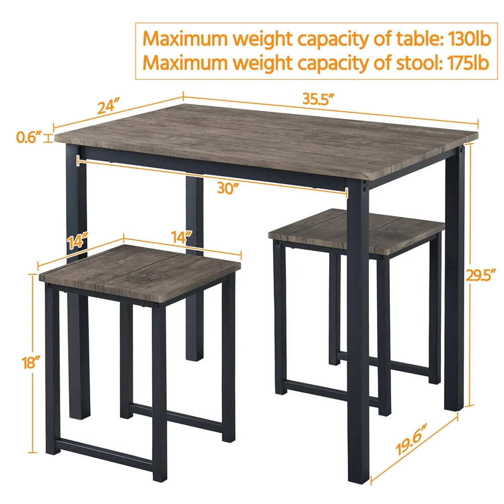 Material: Particleboard, iron Color: Drift Brown + Black Table dimensions: 35.5 x 24 x 29.5″ (L x W x H) Stool dimensions: 14 x 14 x 18″ (W x D x H) N. W.: 35.7lb G. W.: 41 lb Maximum weight capacity of table: 130 lb Maximum weight capacity of stool (ea. ):175 lb