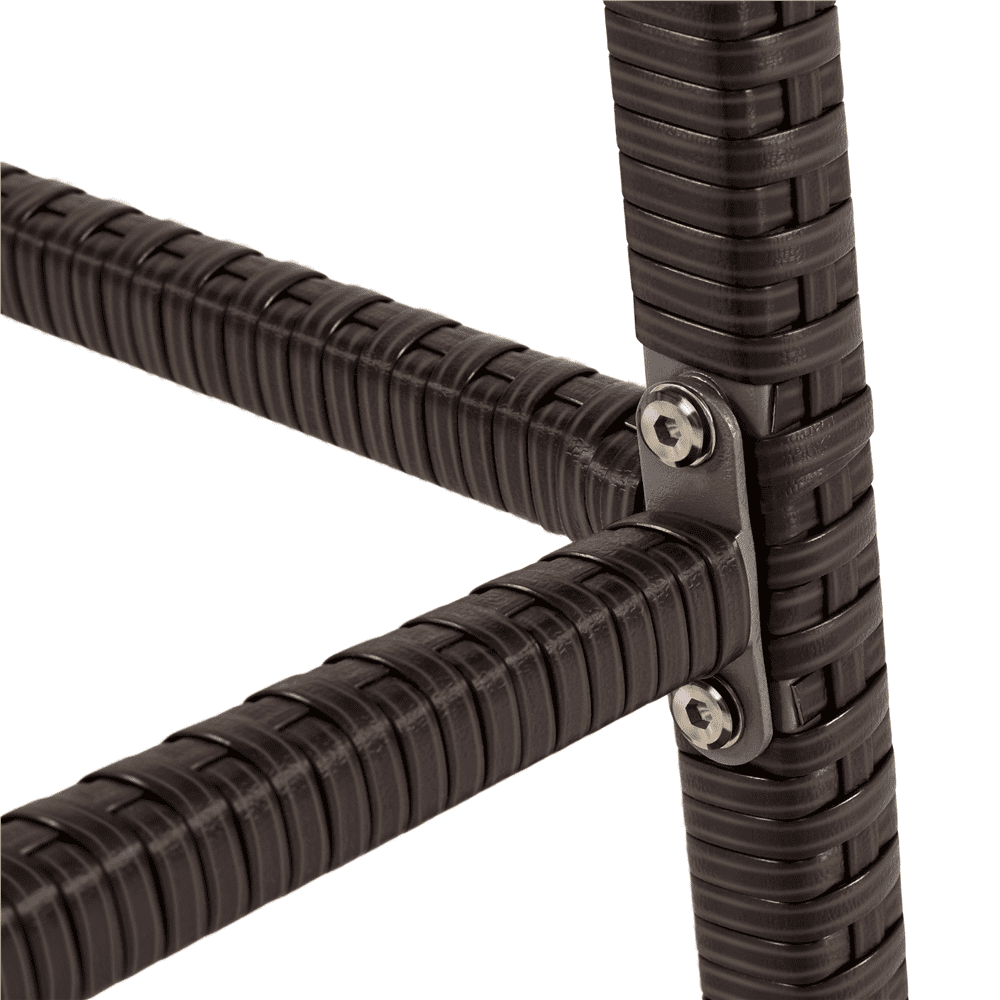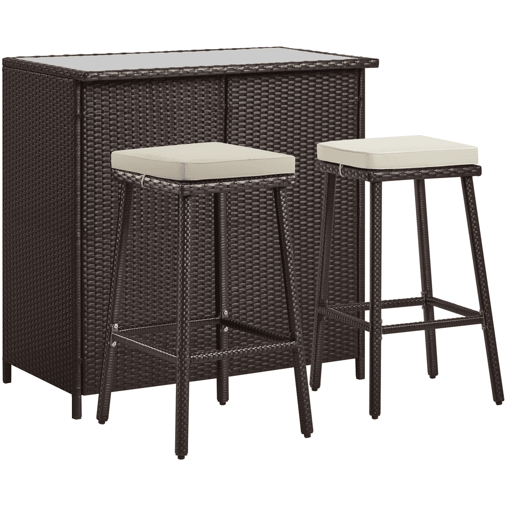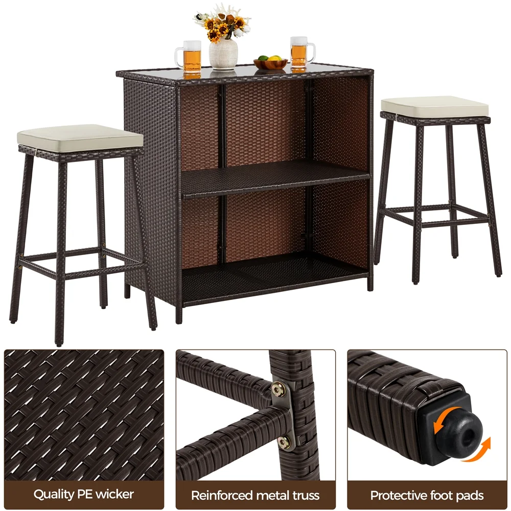 PE rattan wicker is durable but incredibly lightweight and easy to carry and move. The all-weather coating of this patio furniture set allows us to hose down the whole set to get away with dirt and let it dry. Two stools are thoughtfully designed with a footrest to rest your feet on them, the covers of seat cushions can be removed for convenient washing as well, and the whole bar set requires the least maintenance. Two compartments inside the table provide large space for your belongings. Simple and universal look also makes this 3-piece dining set suitable for any patio.