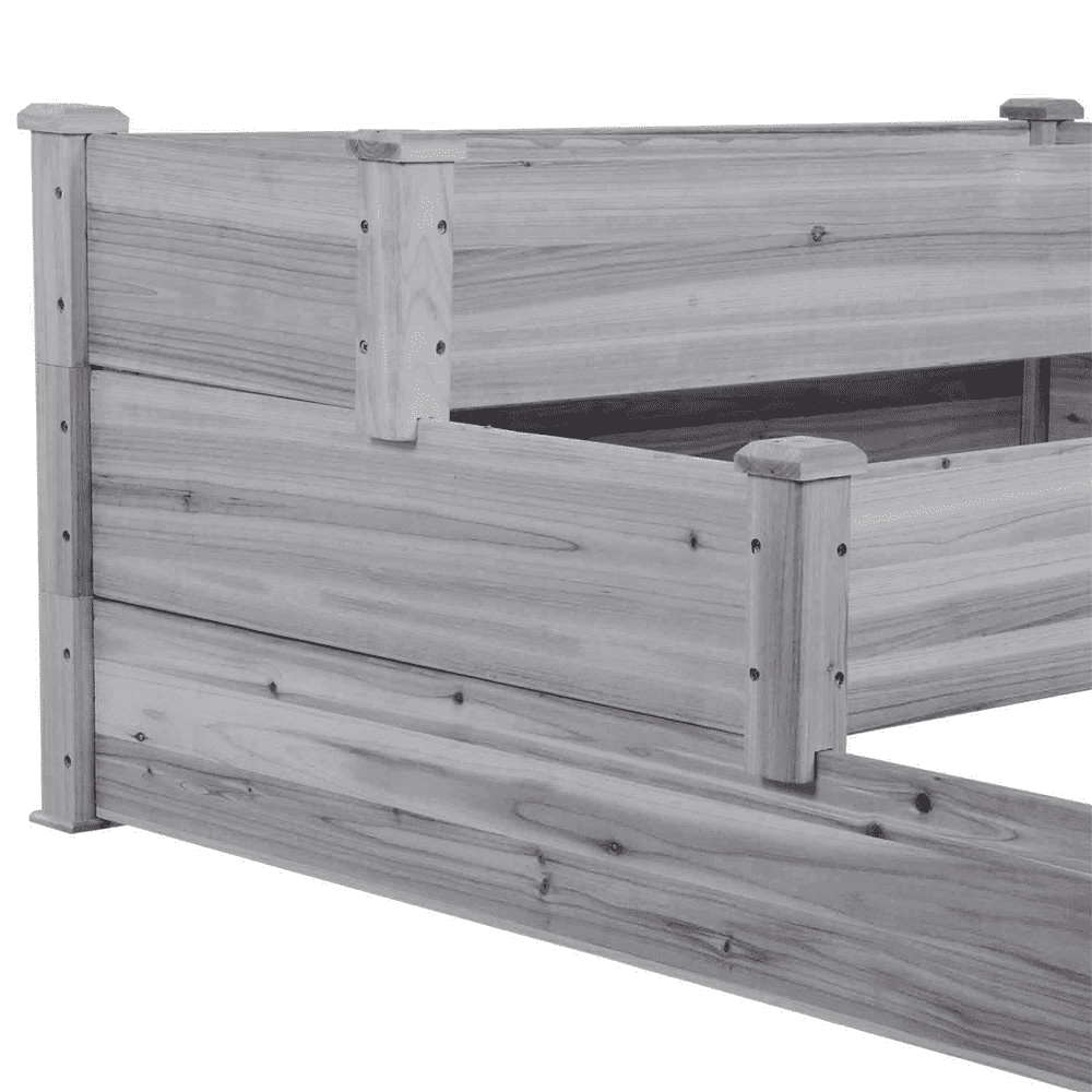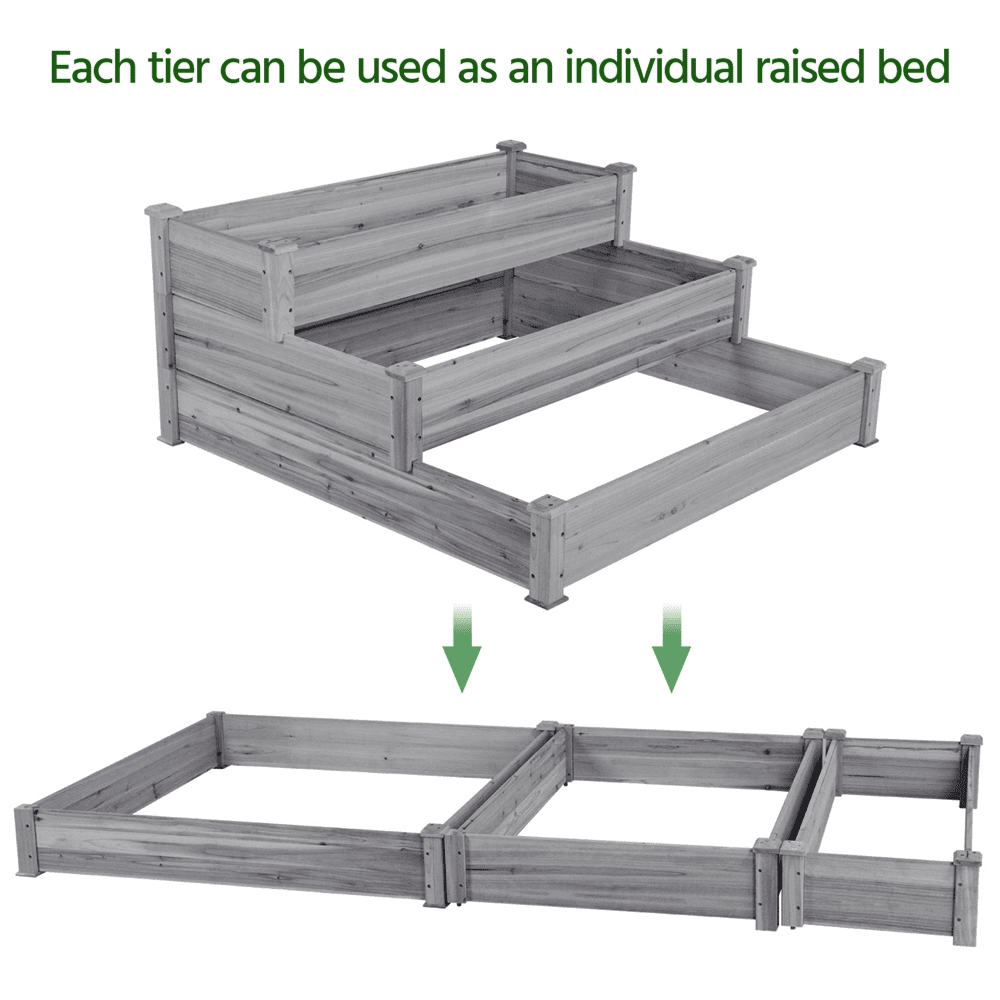 Made of natural fir wood without painting, this garden bed for horticulture is well sanded to ensure safe use. The 0.6” thick solid wood boards fixed by metal hardware are ready for use. This elevated planter for horticulture provides 3 growing areas for different plants or planting methods. Each tier is jointed with wood plugs, which allows this 3-tier garden bed to be easily turned into 3 separate growing beds of different sizes if needed.The divider boasts ample space for soil and plants. With adequate soil, plants will have a spacious room to develop their roots and grow lush.This multi-functional planter allows you to efficiently cultivate and oversee a variety of plants, including but not limited to vegetables, flowers, and herbs, across your patio, yard, garden, and greenhouse.