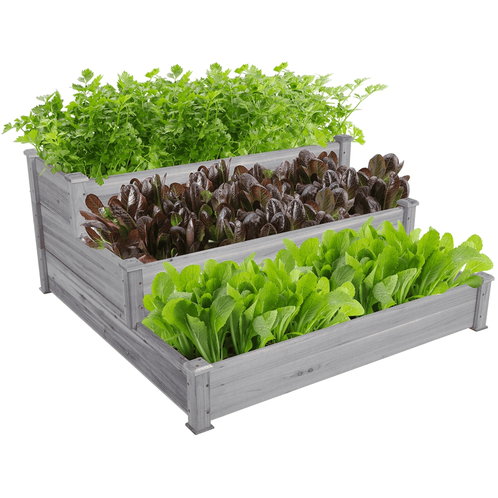 Renwick 3 Tier Raised Garden Bed Elevated Planter, Gray: Material: Fir Wood Color: Gray Assembled Dimensions:47.2 x 47.2 x 22inch (L x W x H); Board Thickness:0.6inch; Height: 8inch, 15inch, 21inch Shipping Weight:31lb; Item Weight:25lb Assembly Required Outdoor Use