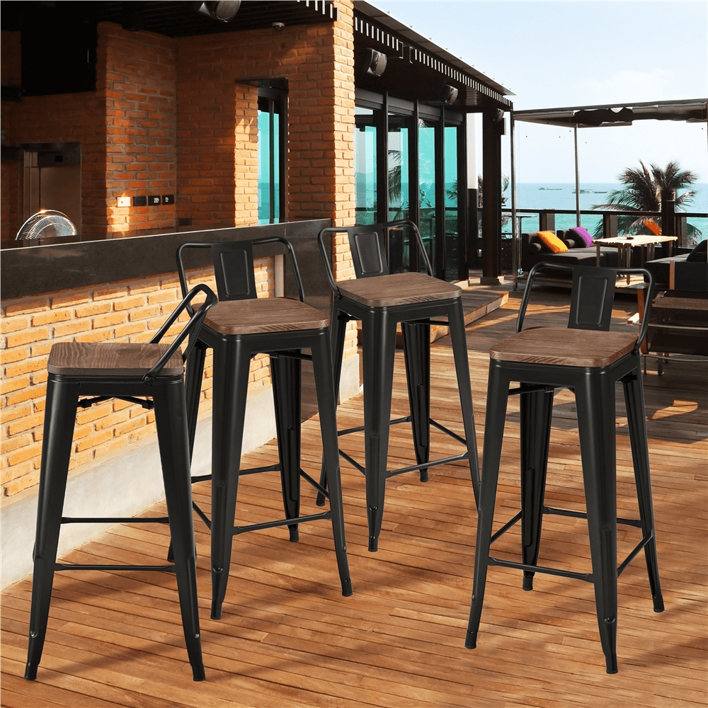 Crafted with firm metal with matte coating and quality sassafras, these 4pcs bar stools are sturdy and durable enough for daily use. With a low backrest design, our chairs provide you with good lower back support and take off some of the stress on your back. Best of all, the stool is equipped with a quadrate foot ring which can help you get onto the seat more easily and allow you to change positions. The industrial rustic style and neutral color of them can flawlessly go well with other furniture/décor in your home. These stylish and all-match dining chairs can look good in the home/dorms/bars/restaurants/cafés, adding style and something unique to any designated place.After assembly, the dimensions are 16.5″L x 18″ W x 36″H.