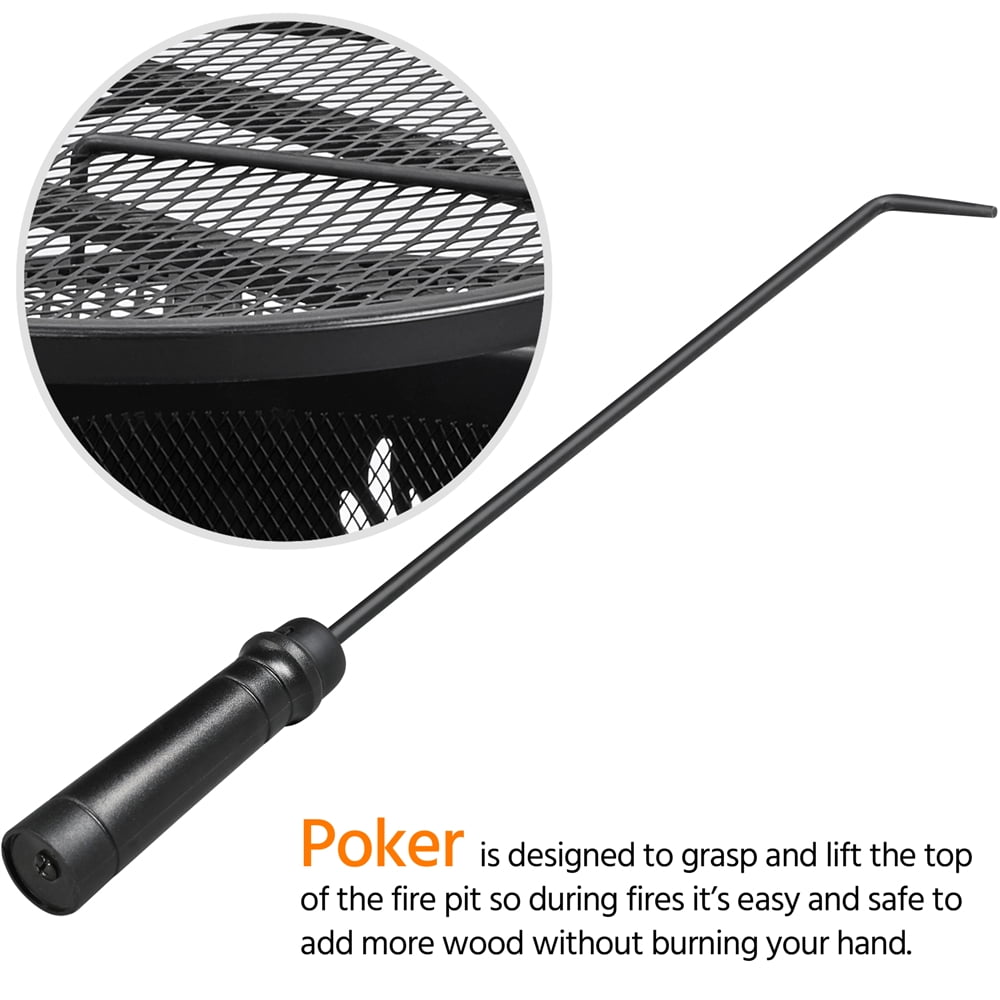 Renwick 32″ Round Black Finish Iron Fire Pit: Color: Black Materials: Metal Fuel Type: Charcoal, Firewood Overall Dimensions: 32″ Dia. × 23″ H Fire Pit Height:16.5″ Fire Bowl: 24″ Dia. × 12″ H Cooking Grate Diameter: 18.5″ Fire Poker Length: 23.6″ Net Weight (assembled product weight): 25.1 lb Gross Weight (product in the box):33.6 lb Safety Tips: 1. Please use this fire pit on non-combustible surfaces such as cement ground, rocks, or sand for your safety. 2. Please don’t use it on lawns, wooden decks, or in any enclosed room.