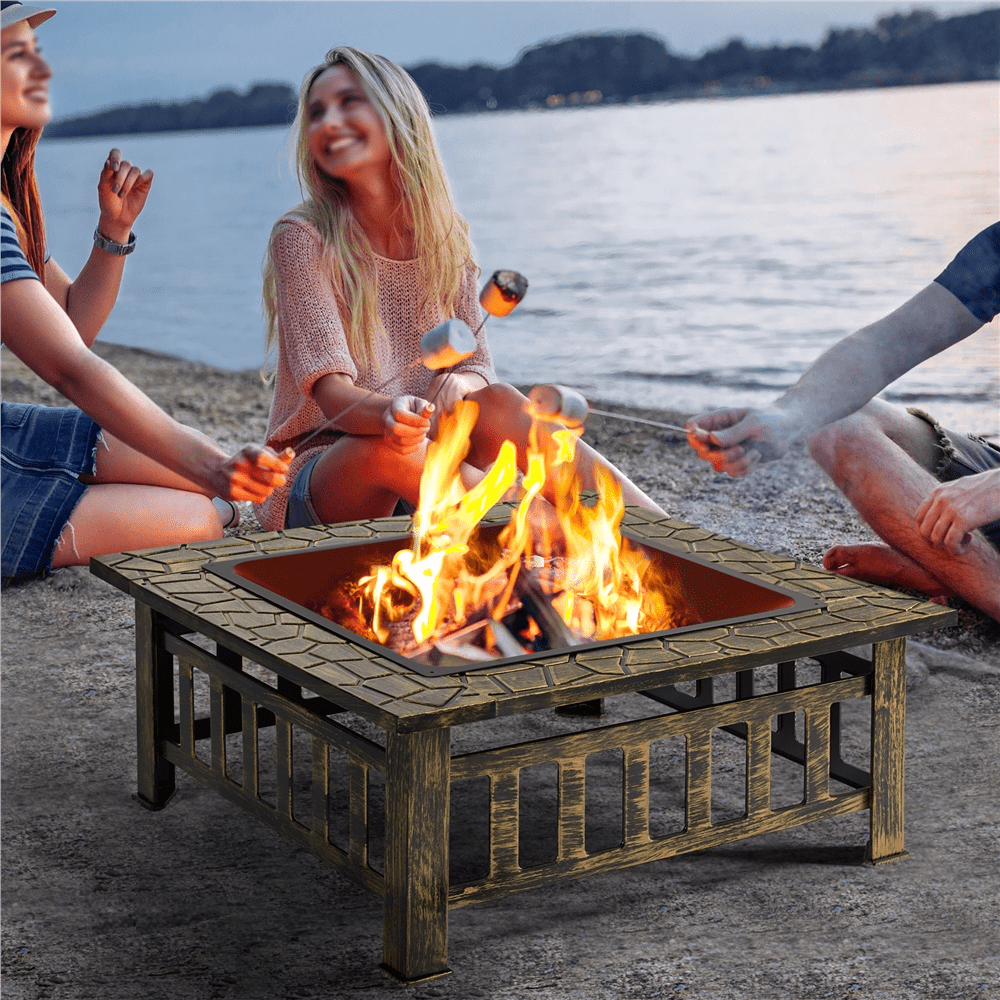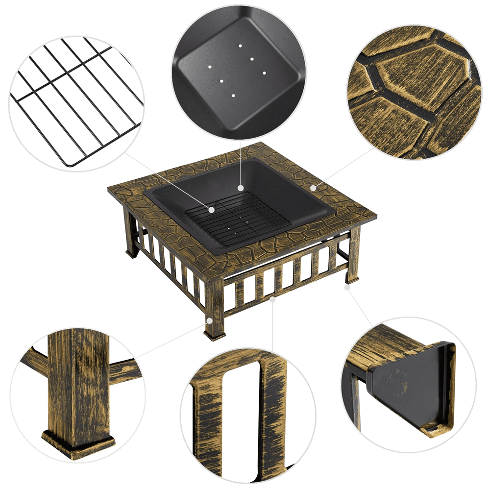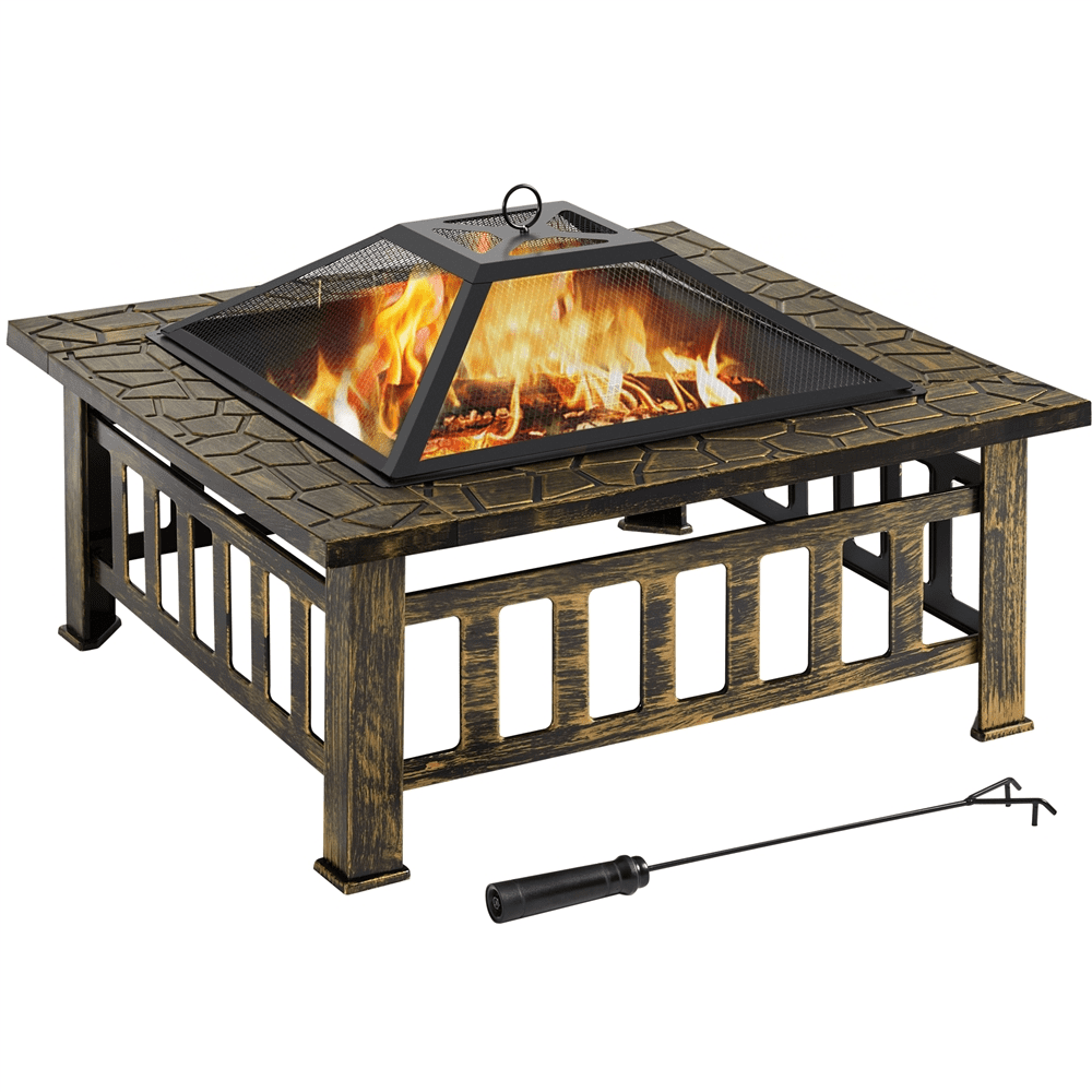 Renwick 34” Outdoor Square Fire Pit w/Cover & Poker, Bronze: Color: Bronze Materials: Metal Fuel Type: Charcoal, Firewood Overall Dimensions (w/ lid): 34” L × 34” W × 21.5” H Fire Pit Height (w/o lid): 14” Fire Bowl: 25”L × 25” W ×5” D Fire Poker Length: 20” Net Weight (assembled product weight): 26 lb Gross Weight (product in the box): 30.4 lb Safety Tips: 1. Please use this fire pit on non-combustible surfaces such as cement ground, rocks, or sand for your safety. 2. Please don’t use it on lawns, wooden decks, or in any enclosed room.