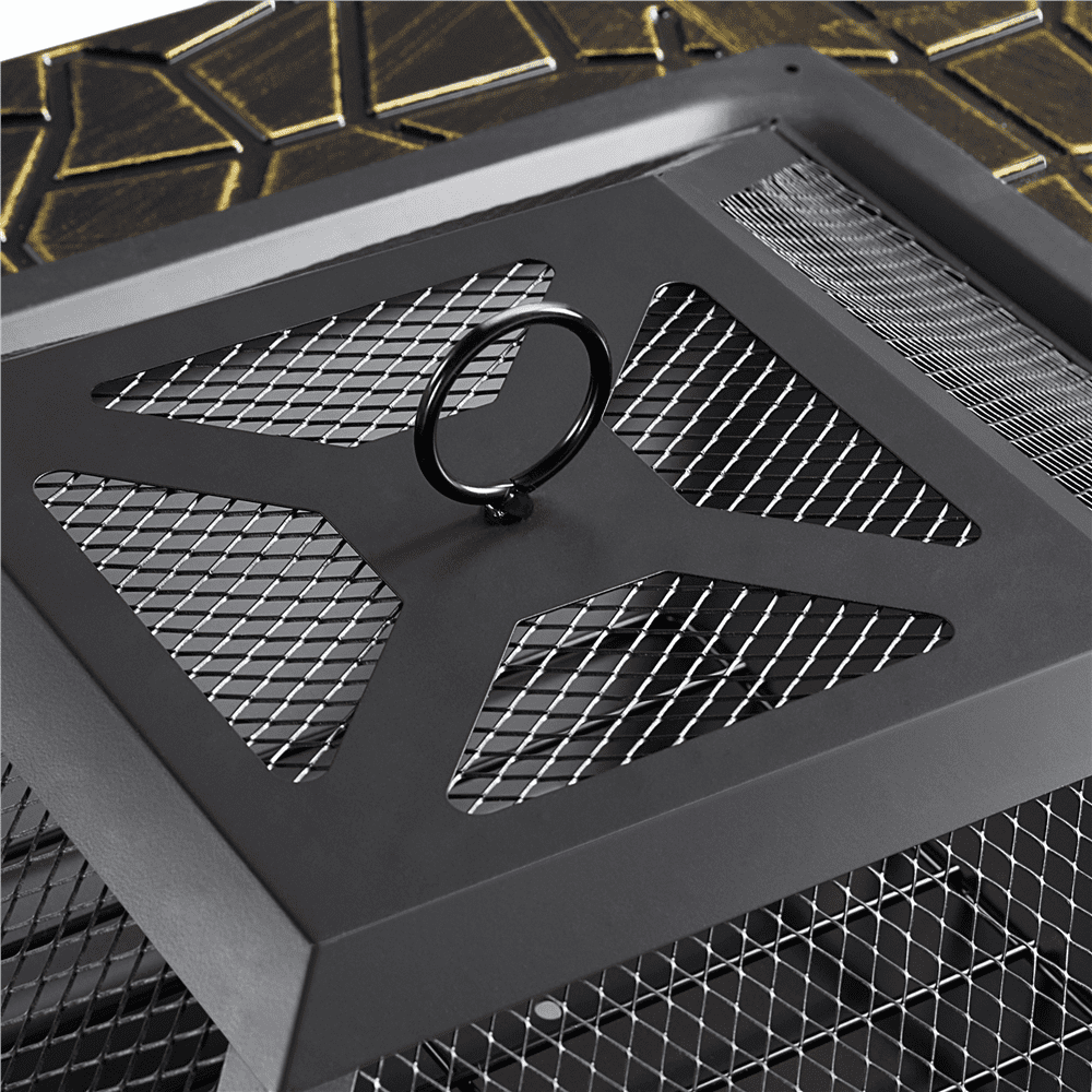 The fire pit spark screen protects you from strays of embers or sparks. The wood poker helps tend the firewood and the flames. It also helps you lift the lid from a safe distance. Founded atop a weather-resistant powder-coated metal frame, the metal fire bowl is finished with heat resistant coating that can withstand temperatures ranging from 400℃/752℉ to 600℃/1112℉. A waterproof PVC cover keeps the fire pit dirt-free when not in use. The 5.3” wide edges provide extra space for holding plates, sauces, brushes and other barbecue supplies, allowing for convenient access during cooking.There are six holes at the bottom of the fire bowl to increase airflow, giving you a beautiful furious fire throughout the cold nights.