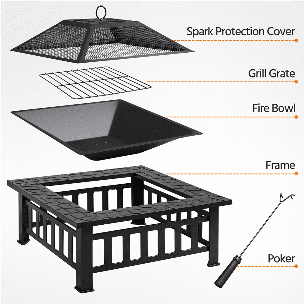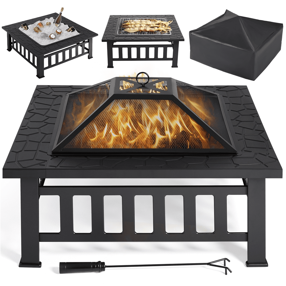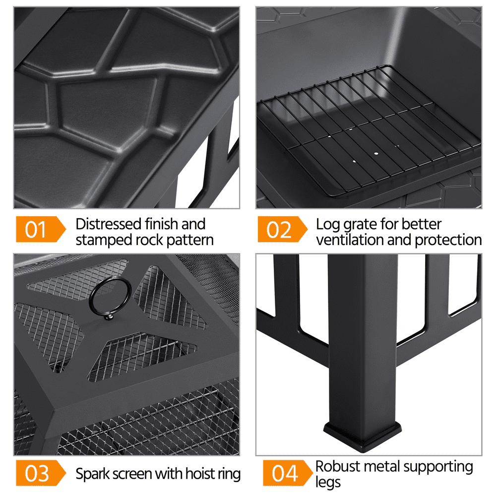 Renwick 34” Outdoor Square Metal Fire Pit with Cover & Poker, Black: Color: Black Materials: Metal Fuel Type: Charcoal, Firewood Overall Dimensions (w/ lid): 34″ L × 34″ W × 21.5″ H Fire Pit Height (w/o lid): 14″ Fire Bowl: 25″ L × 25″ W ×5″ D Fire Poker Length:20″ Net Weight (assembled product weight): 26 lb Gross Weight (product in the box): 30.4 lb Safety Tips: 1. Please use this fire pit on non-combustible surfaces such as cement ground, rocks, or sand for your safety. 2. Please don’t use it on lawns, wooden decks, or in any enclosed room.