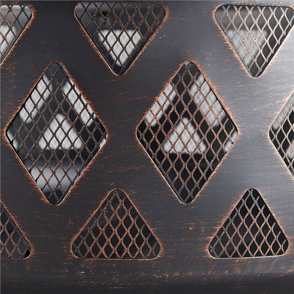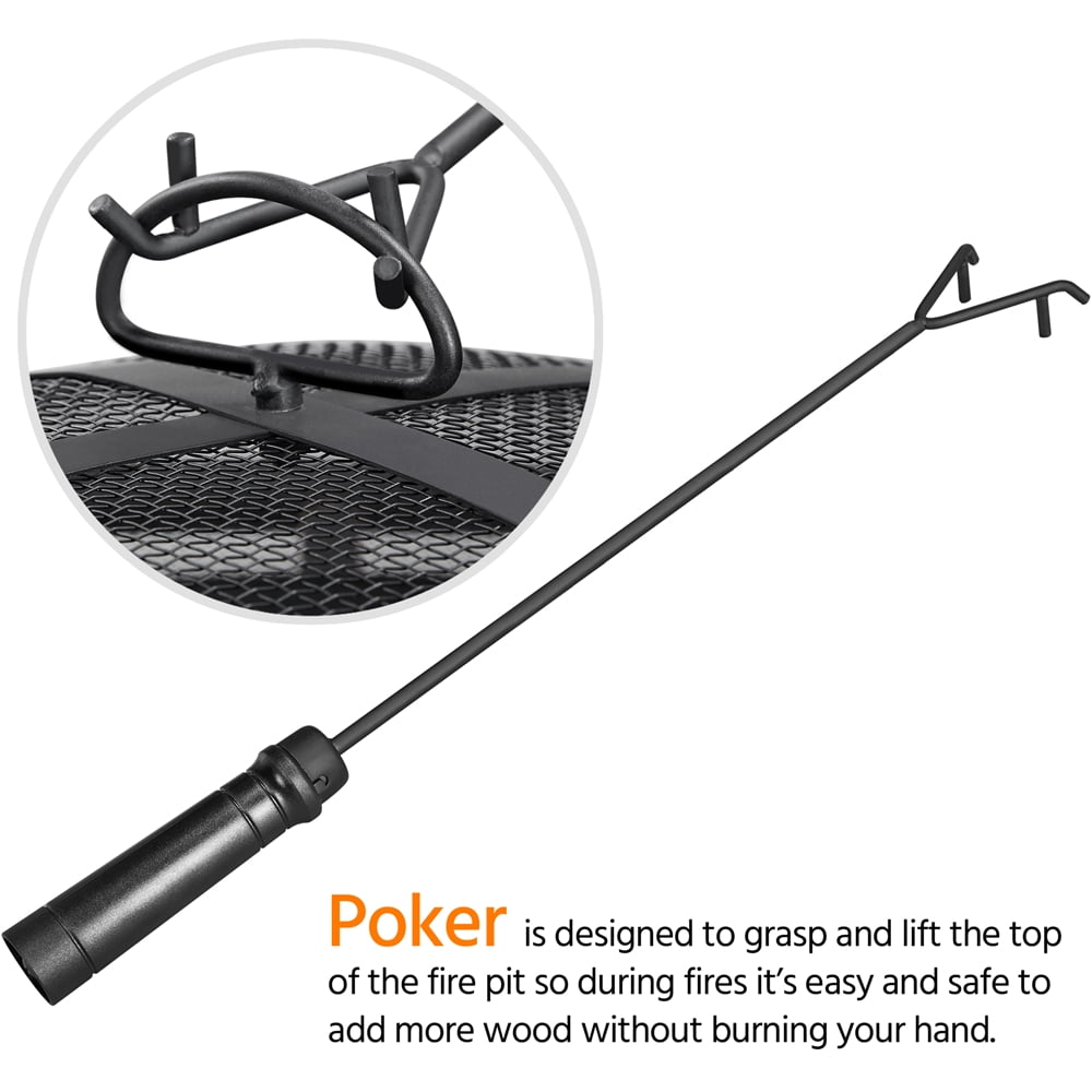 Renwick 36in Outdoor Iron Fire Pit with Mesh Screen Poker, Bronze Materials: Metal Color: Oil-rubbed Bronze Fuel Type: Charcoal, Firewood Overall Dimensions (w/ lid): 36″ Dia. × 23.5″ H Fire Pit Height (w/o lid):17″ Fire Bowl: 29″ Dia. × 10.5″ H Distance Between Fire Bowl & Ground: 6″ Fire Poker Length: 20″ Net Weight (assembled product weight): 20.3 lb Gross Weight (product in the box): 27.2 lb Safety Tips: 1. Please use this fire pit on non-combustible surfaces such as cement ground, rocks, or sand for your safety. 2. Please don’t use it on lawns, wooden decks, or in any enclosed room.