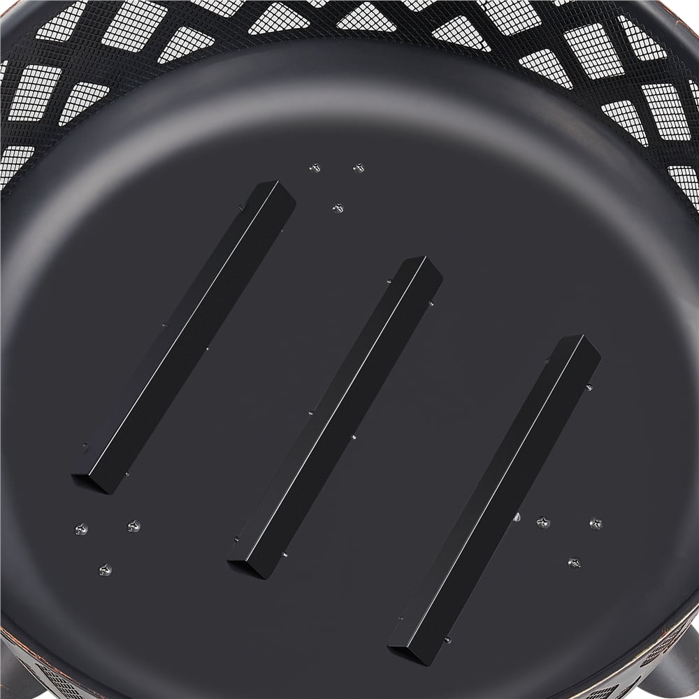 Founded atop 3 sturdy metal legs, this 36” round garden fire pit features a heavy-duty metal construction finished with high-temperature paint, ensuring high strength and durability to withstand the heat of flames. With a bowl size of 29″ Dia. × 10.5″ H, this spacious outdoor fireplace has plenty of room to contain firewood and put out a sufficient amount of heat.Besides the cutouts lined with mesh screens on the bowl, there are 9 air holes at the bottom of this outdoor fire bowl protected by 3 risers at the bottom for aeration.