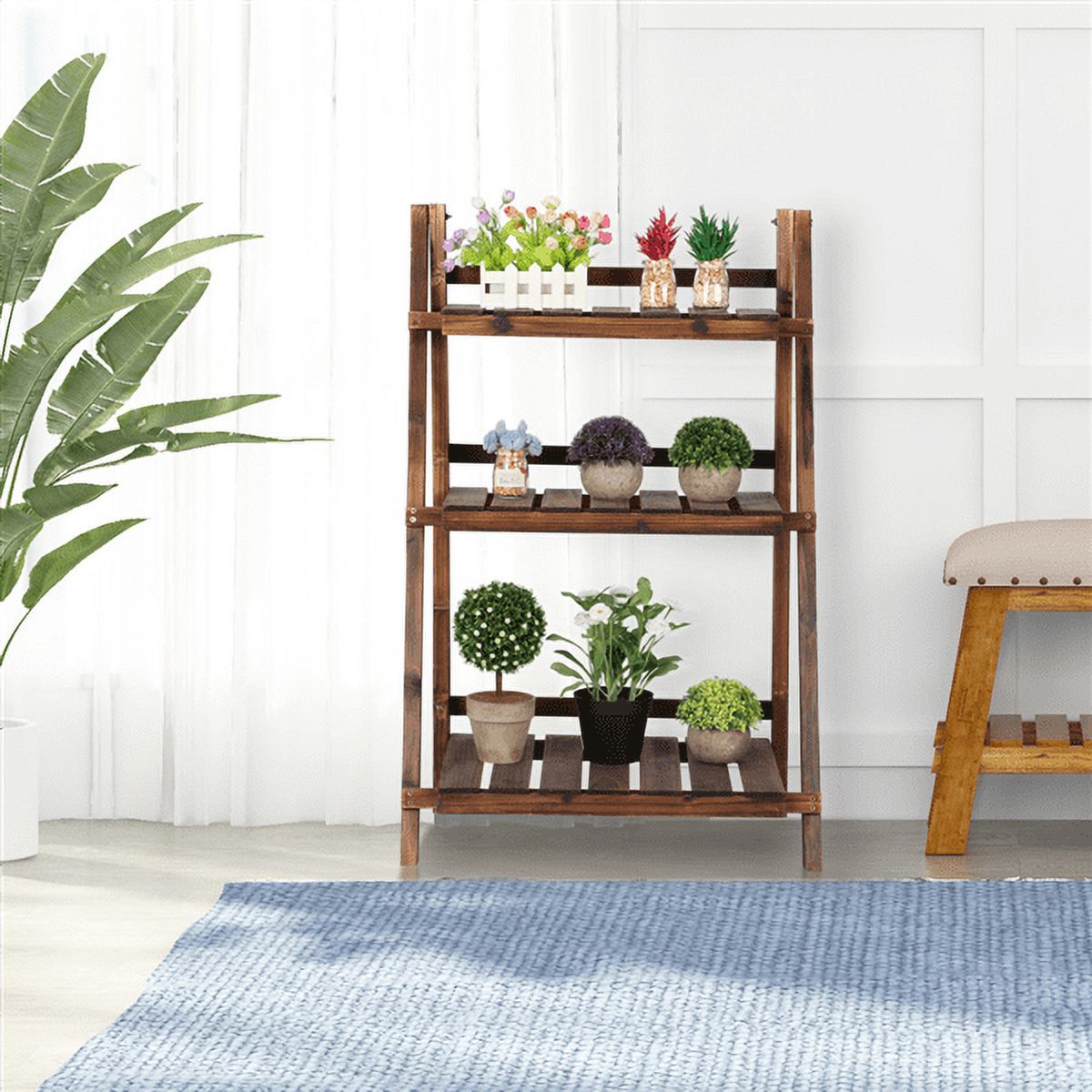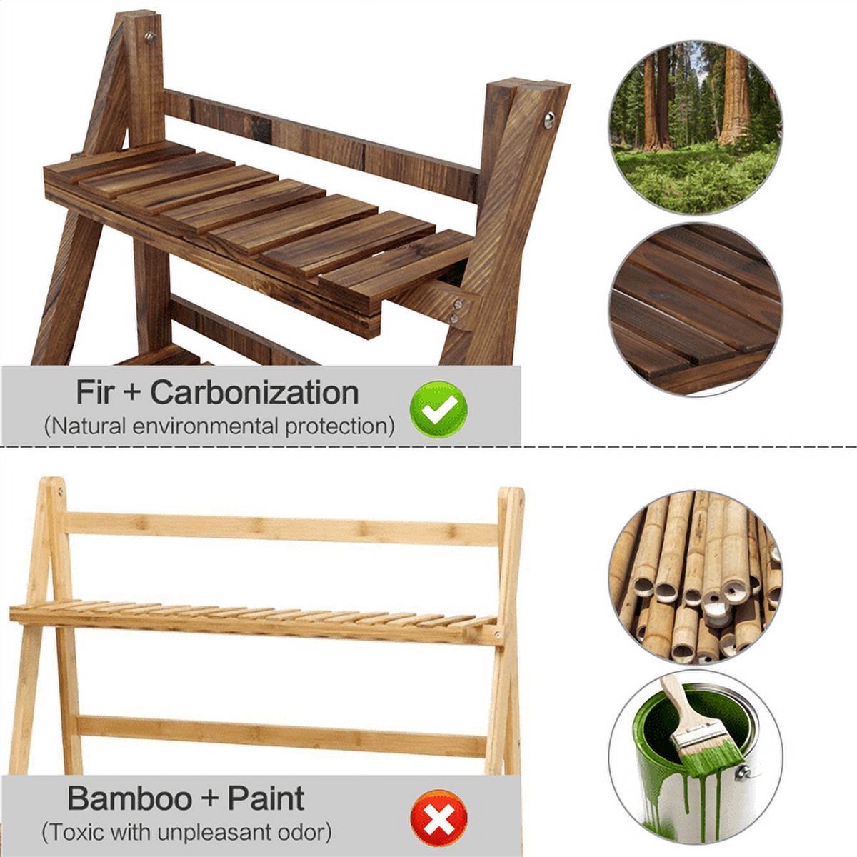100% SOLID WOOD SHELVING UNIT: This flower stand is made of 100% fir wood, which is known for its strength and dimensional stability as well as its natural resistance to rot and pests. 3-TIER FLOWER STAND: Built in a stable structure with a total of 3 platforms in 3 heights, this plant ladder stand provides ample space to display plants of different heights and shapes. FOLDABLE DESIGN: Flexibly flip-up tier panels and collapsible frame allow this wooden flower stand to be folded into a compact and thin size that only takes up a little space and can be stored in any narrow place when not in use. EASY TO APPLY: No assembly required. Just take out from the package and unfold it, a beautiful and practical 3-tier shelf stand is ready to use. RICH & ASSORTED USAGE: This aesthetically-pleasing shelving unit can be a display stand for plants, photos, handicraft, books in the living room, patio, balcony, and also can serve as a fancy storage shelf for toiletries, towels, hats in the bathroom, hallway, bedroom, kitchen, etc. LOW MAINTENANCE REQUIRED: This high quality wood flower stand is built to last without much care and maintenance. It can be wiped clean with mild detergent and damp cloth. WELL PROTECTED: The product is protected in several layers of wrapping materials and the package has passed 10 times of drop tests to ensure the product is intact during the delivery.