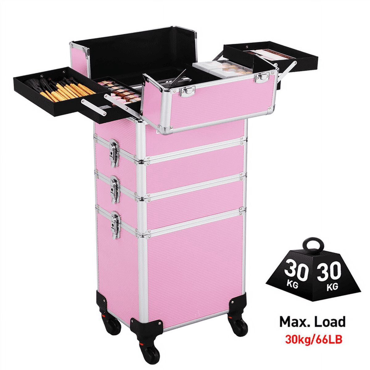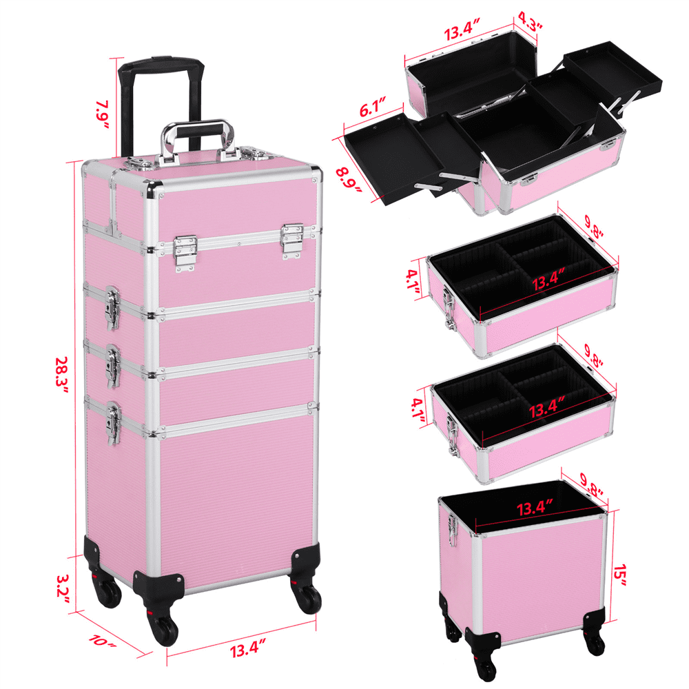 Box Structure and Material: Aluminum alloy frame, rust-proof silver iron alloy corner, abs box surface, middle mdf plate, 210D polyester lining, hexagonal telescopic rod, plastic universal caster. Case Dimension: 13.4 x 10 x 31.6″(L x W x H). Total Dimension: 13.4 x 10 x 39.4″(L x W x H). Net Weight: 7.07 kg. Gross Weight: 8.75 kg. Shipping Box Size: 42.5 x 34.4 x 83 cm. Color: Pink. Package Includes: 1 x rolling cosmetic cases.