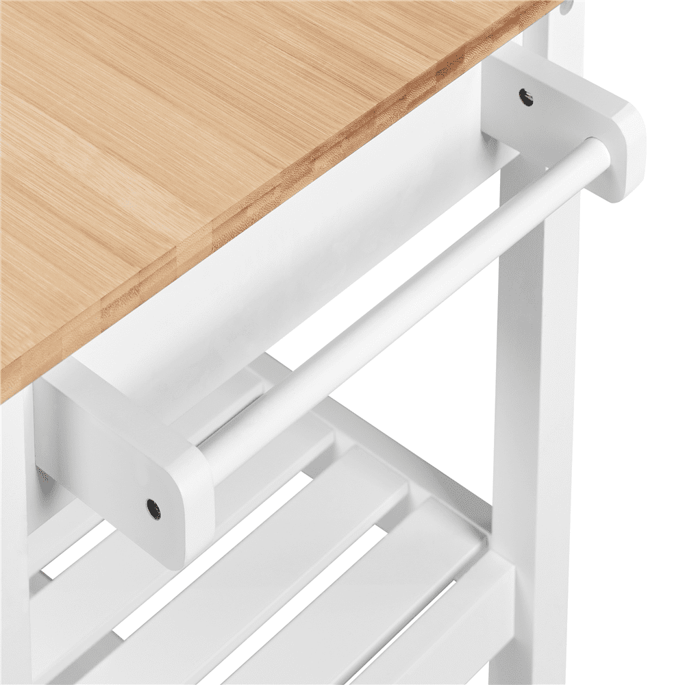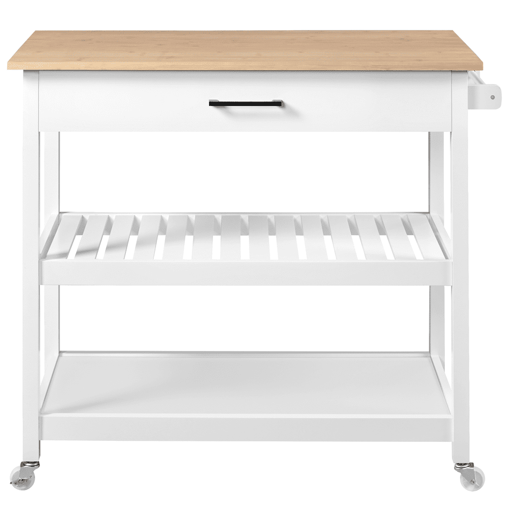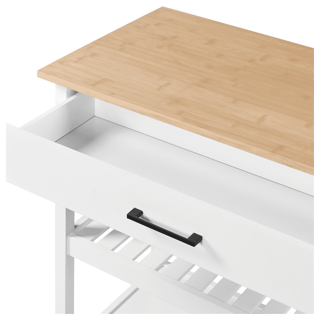 Renwick 40″ W Kitchen Island Cart with Storage & Drawer on Wheels, White Color: Natural Wood Countertop, White Stand Materials: Bamboo, MDF, Pinewood Assembled Dimensions: 40” L × 20” W × 36.5” H Countertop:40” L × 20”W Drawer Interior Size: 33”W × 11.3” D × 3” H Shelf: 35”L × 17.2”W Distance Between Shelves:11” Ground Clearance: 4” Item Weight:54.9 lb Shipping Weight:54.9 lb Maximum Weight Capacity: Static: Countertop: 66 lb, Drawer:11 lb, Shelf (ea.): 33 lb Dynamic: Overall: 44 lb