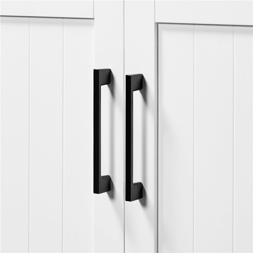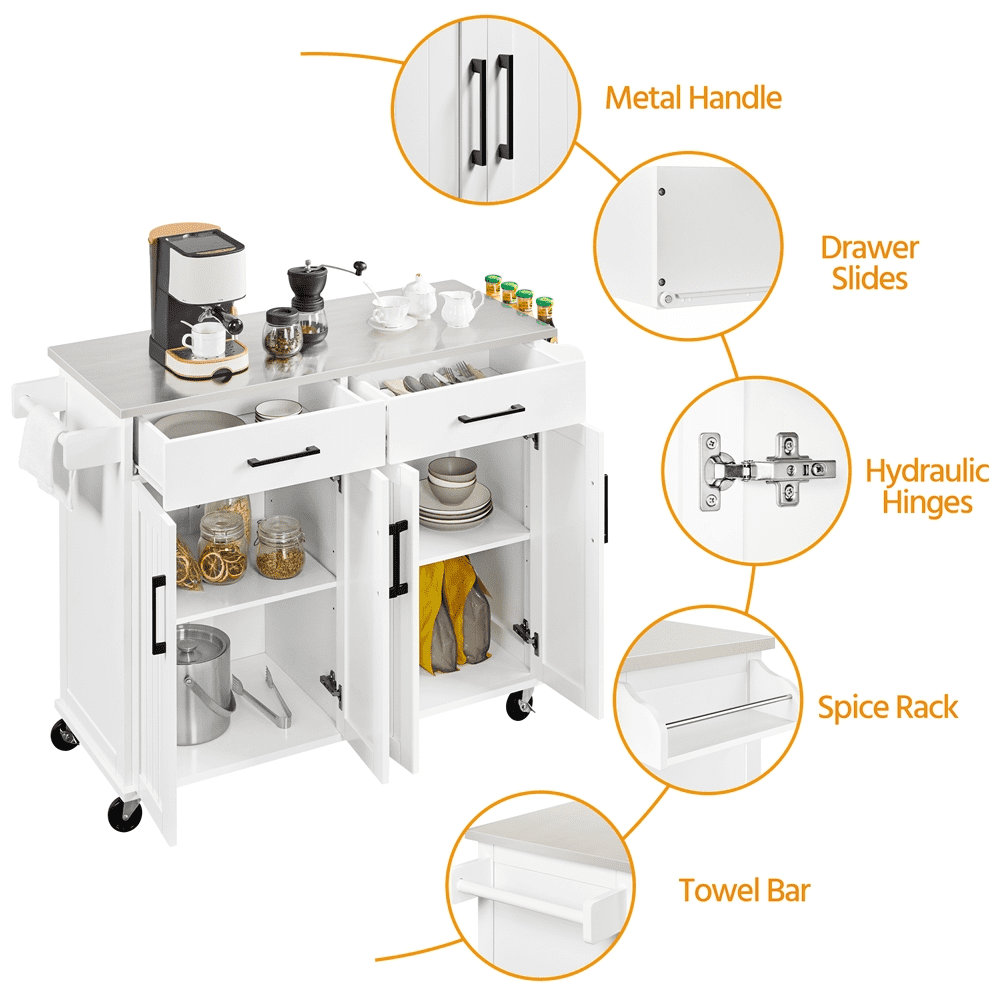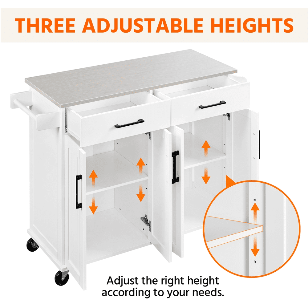 Made of sturdy MDF with stainless steel cover, the tabletop is stain and water-resistant. It can totally hold up to 298lb. The rolling storage kitchen cart has two cabinets with a four-door design which includes two adjustable shelves that can store utensils, pots, pans, and other small appliances. The shelves can be adjusted to different heights of 10”, 12.4” and 15” to accommodate your storage needs and help keep your kitchen essentials handy.Most importantly, the Nordic style and modern design of it also add a touch of elegance to your home.