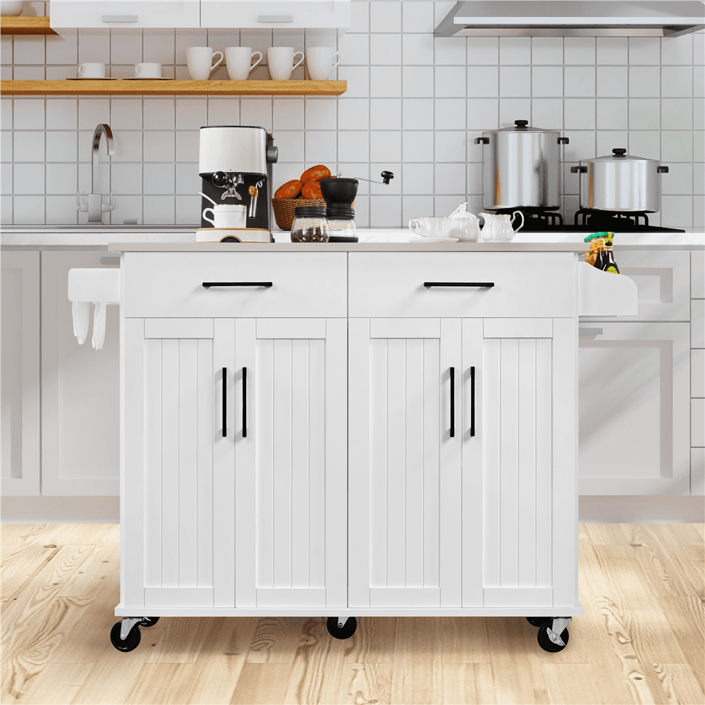 Renwick 42in Kitchen Island on Wheels with Storage Drawers & Cabinets, White