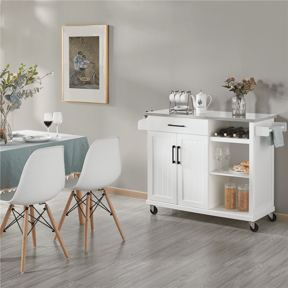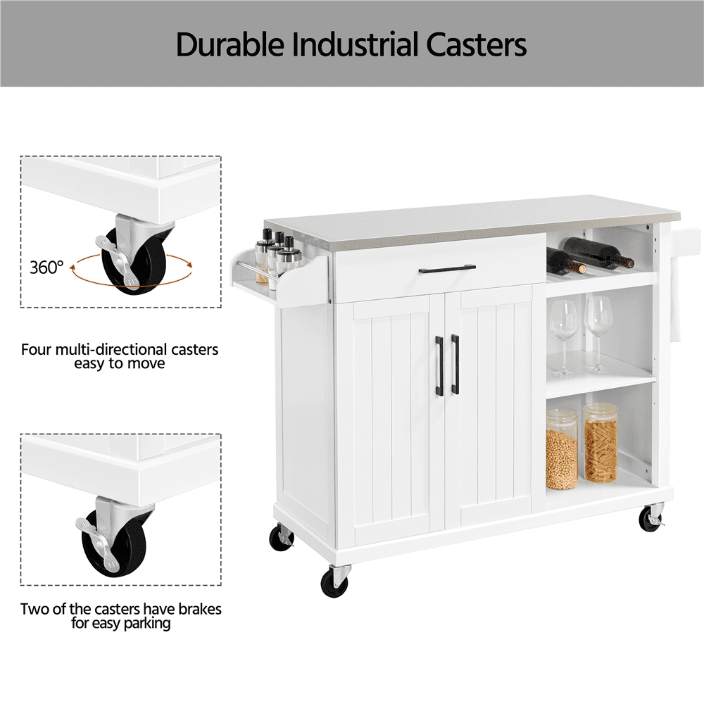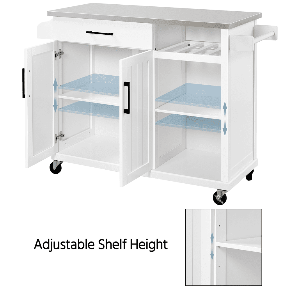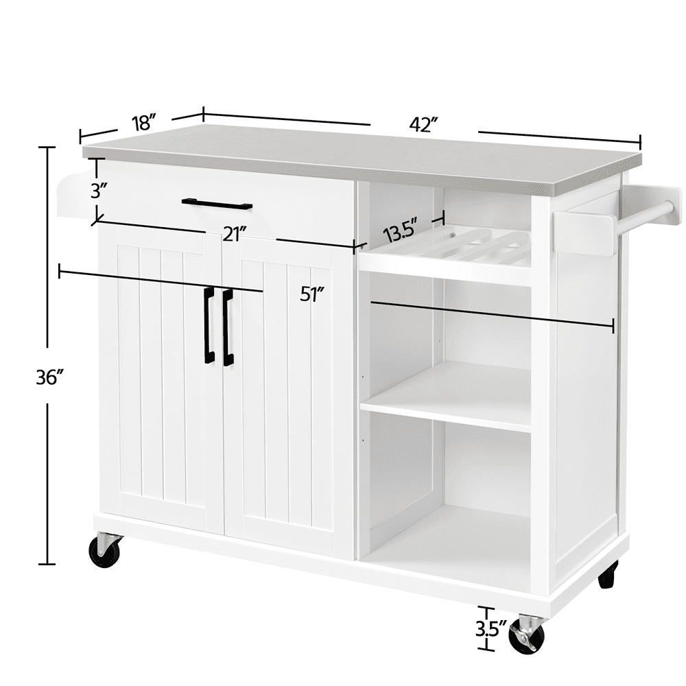 Renwick 42in Rolling Kitchen Island Cart with Stainless Steel Top and Storage, White: Color: crisp white cart, silver stainless steel countertop Material: engineered wood, stainless steel, metal Overall dimension:51x18x36” (LxWxH) Stainless steel sheet thickness: 0.5mm Countertop size:42×18” (LxW) Drawer inner size: 21×13.2×3”(LxWxD) Wine rack size: 14.7x15x5.7” (LxWxH) Cabinet shelf size:23×13.6” (LxW) Open shelf size: 15.6×15.2” (LxW) Adjustable shelf height:9.4”,12”,14.4” Static load capacity: countertop: 175lb; cabinet shelf: 33lb; open shelf :22lb; wine rack: 22lb; drawer:11lb; spice rack: 7lb Dynamic load capacity: overall: 77lb G.W.: 84.3lb