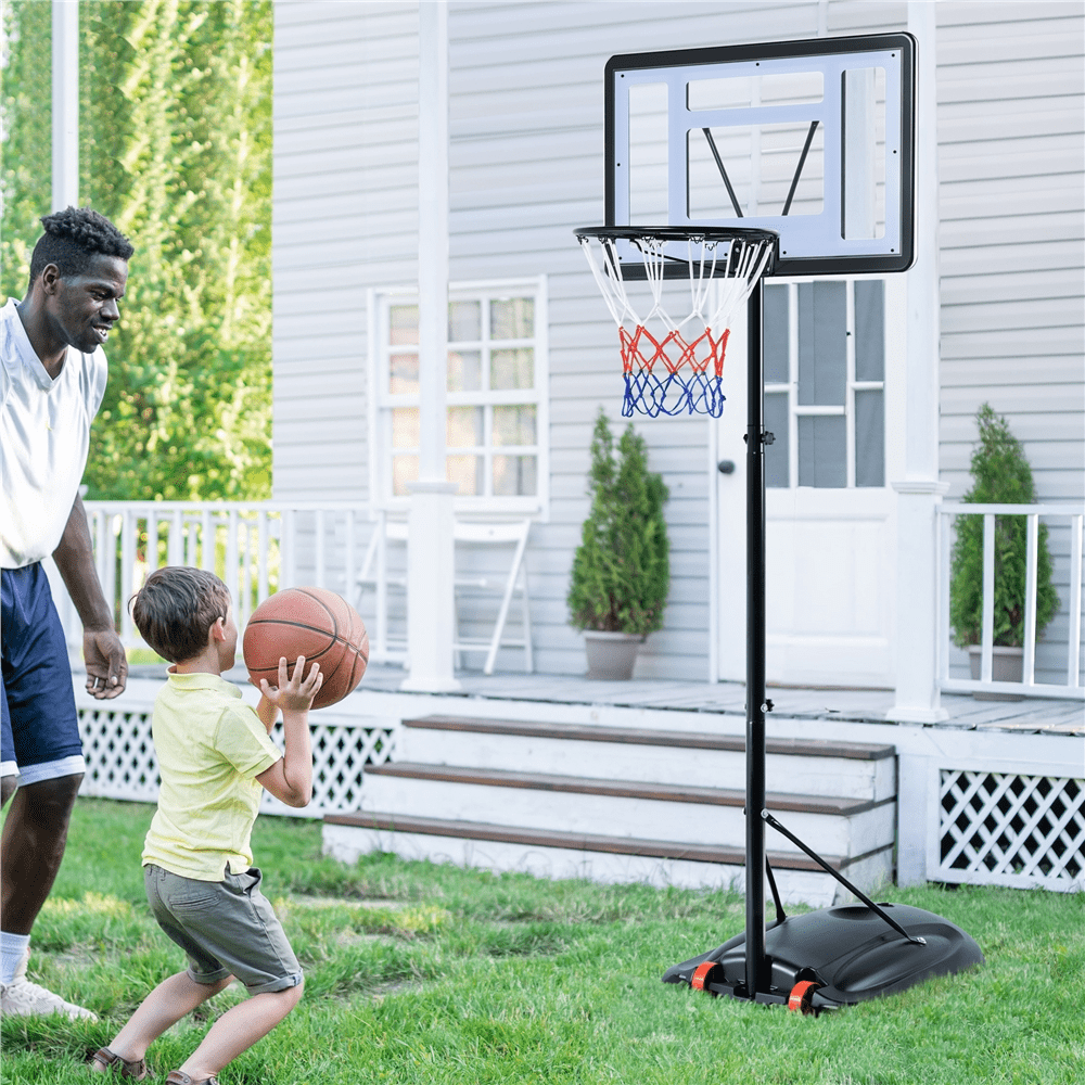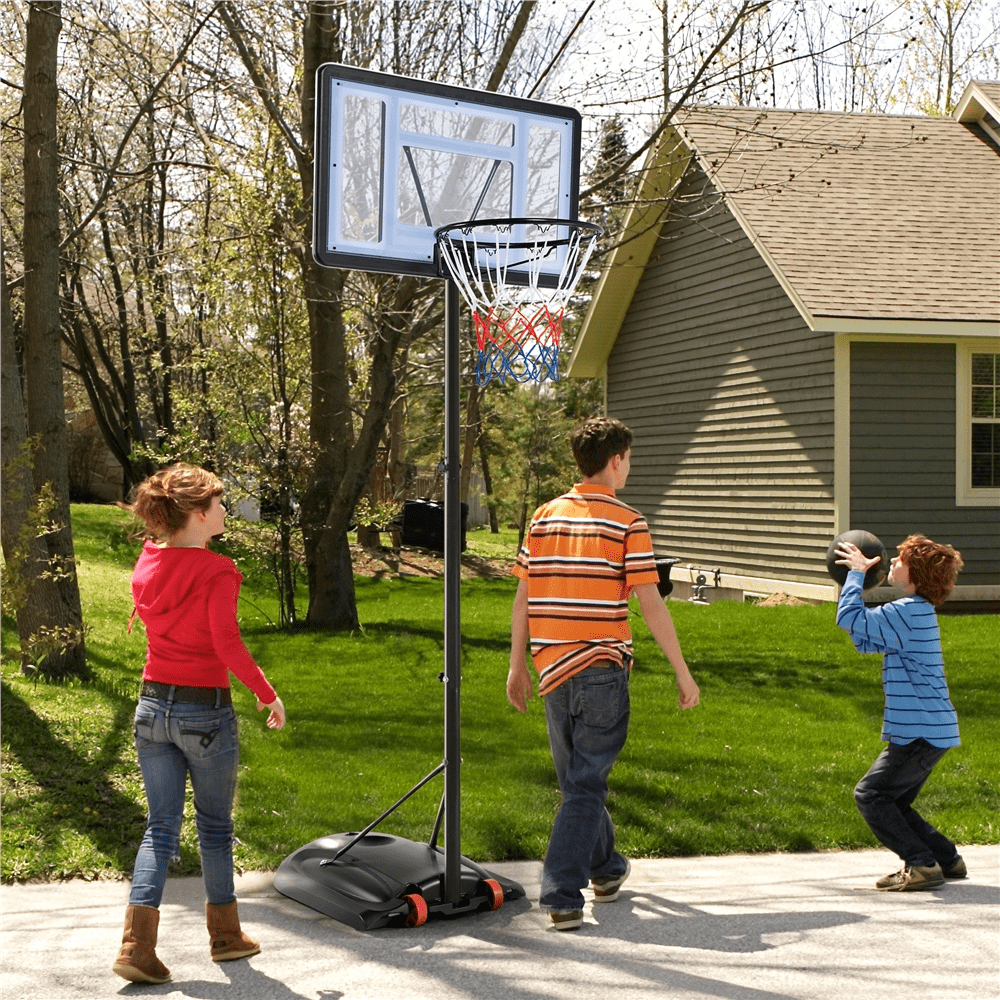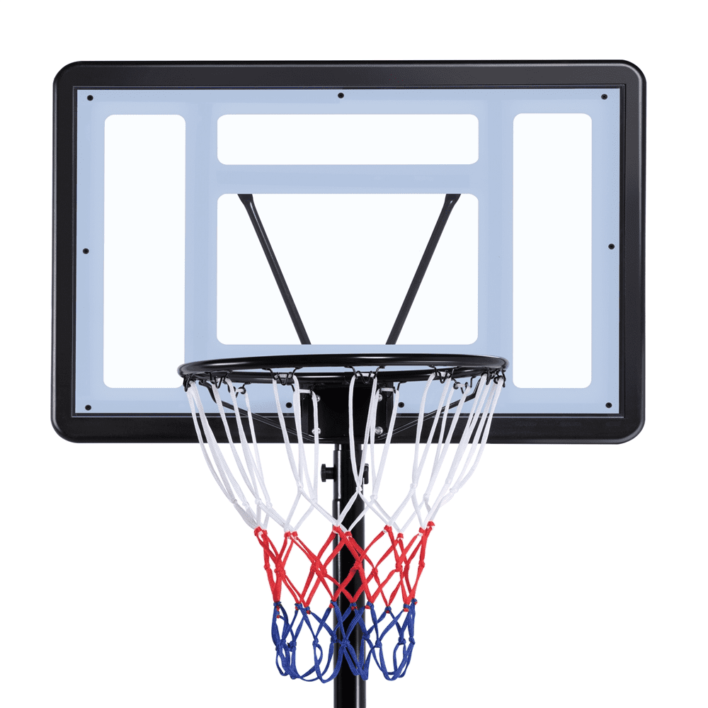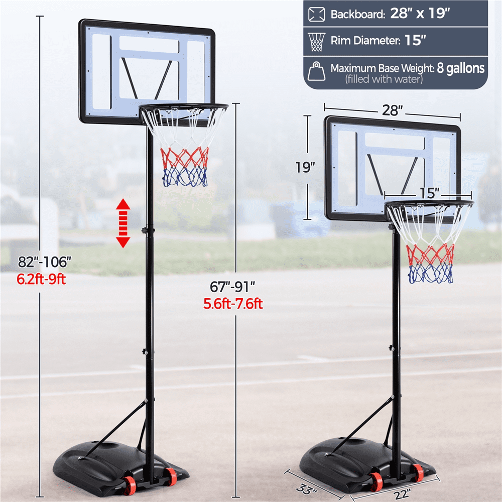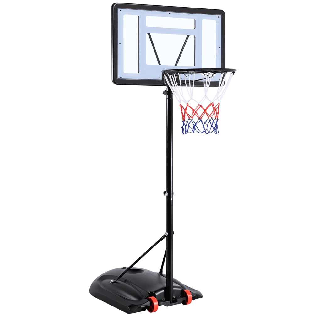 Renwick 5.6′-7.6′ Adjustable Height 28″ Outdoor Portable Basketball System (Child) Height adjustable from 5.6′ to 7.6′ in 4” increments for growing players Durable construction with a clear backboard and black stand Made from high-quality PVC plastic, powder-coated metal, and PE plastic Rim diameter of 15” for standard play Backboard dimensions: 28” L × 19” W