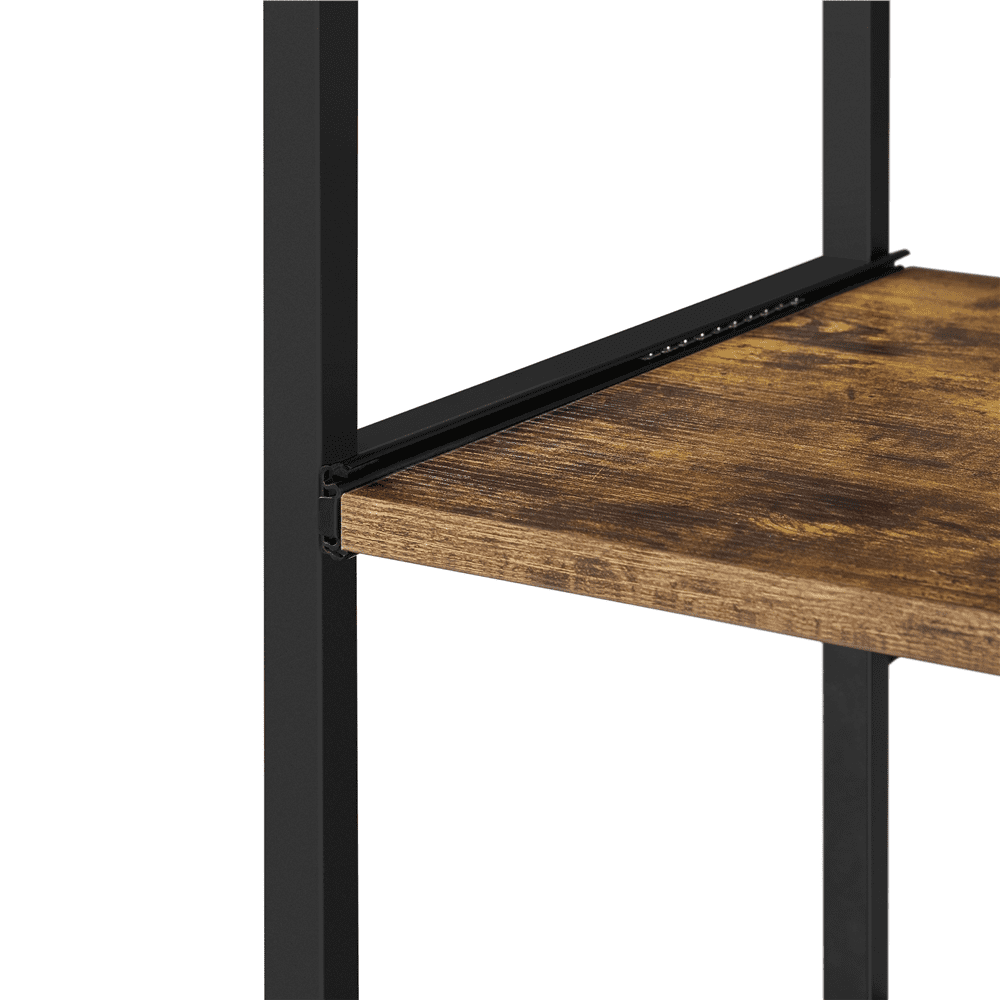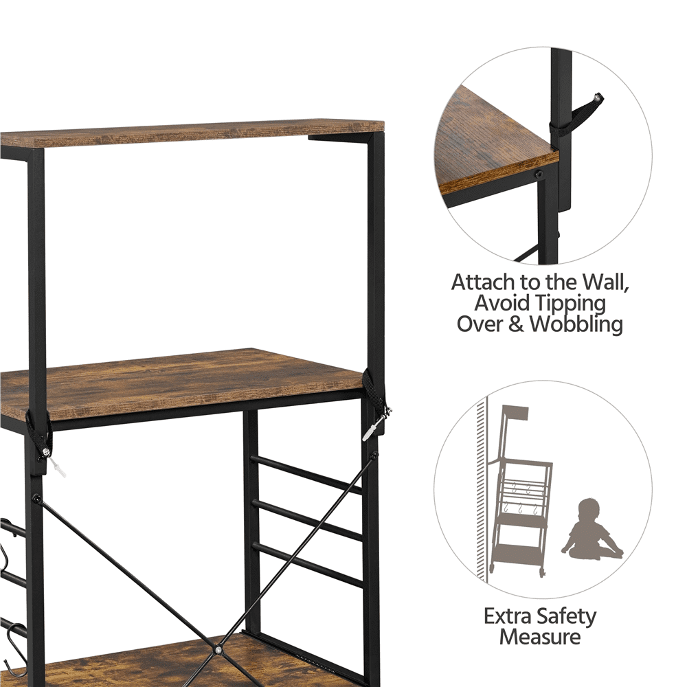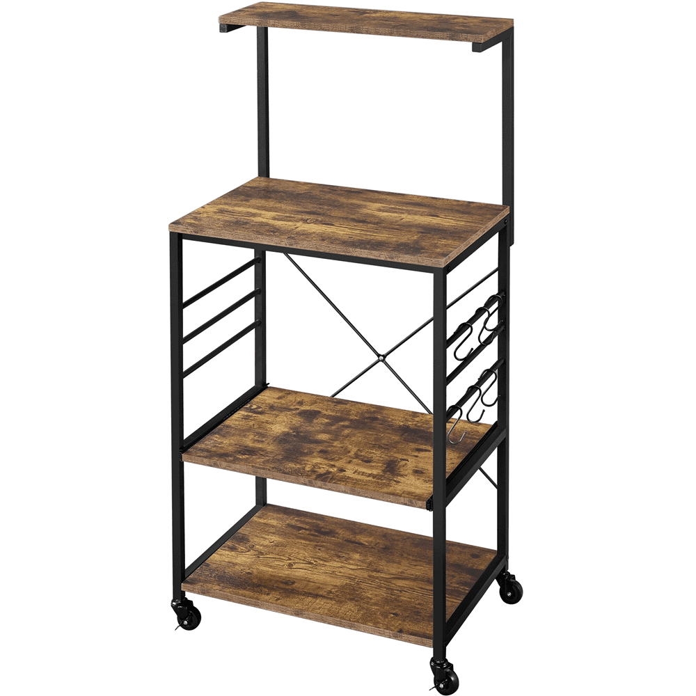 Durable Build: Made from sturdy metal and CARB P2-compliant particle board, this kitchen organizer rack is built to last. The smooth, matte finish of the powder-coated metal frame adds a high-end touch Stylish & Practical: Combining particle board shelves with a robust metal frame, this baker’s rack offers utility without losing style. It adds a vintage vibe to your home while serving as a great spot to display baked goods Built to Last: Featuring 0.5″ thick particle boards, this four-tier utility storage rack offers strong support for your kitchen essentials, with a total weight capacity of 132 lb for all your items Flexible Feet Design: The baker’s rack includes four anti-slip foot pads to prevent scratches on your floor. If you prefer mobility, simply replace the foot pads with casters, allowing you to move it with ease Easy Movement: Equipped with four universal wheels (two with brakes), this baker’s rack can be easily moved around. The casters offer quick mobility, or you can swap them with foot pads for stationary use Specifications: Color: Rustic Brown; Materials: Particle Board, Metal; Assembled Dimensions: On Wheels: 24″ L × 16″ W × 50.5″ H, On Footpads: 24″ L × 16″ W × 48″ H; Total Maximum Weight Capacity: 132 lb
