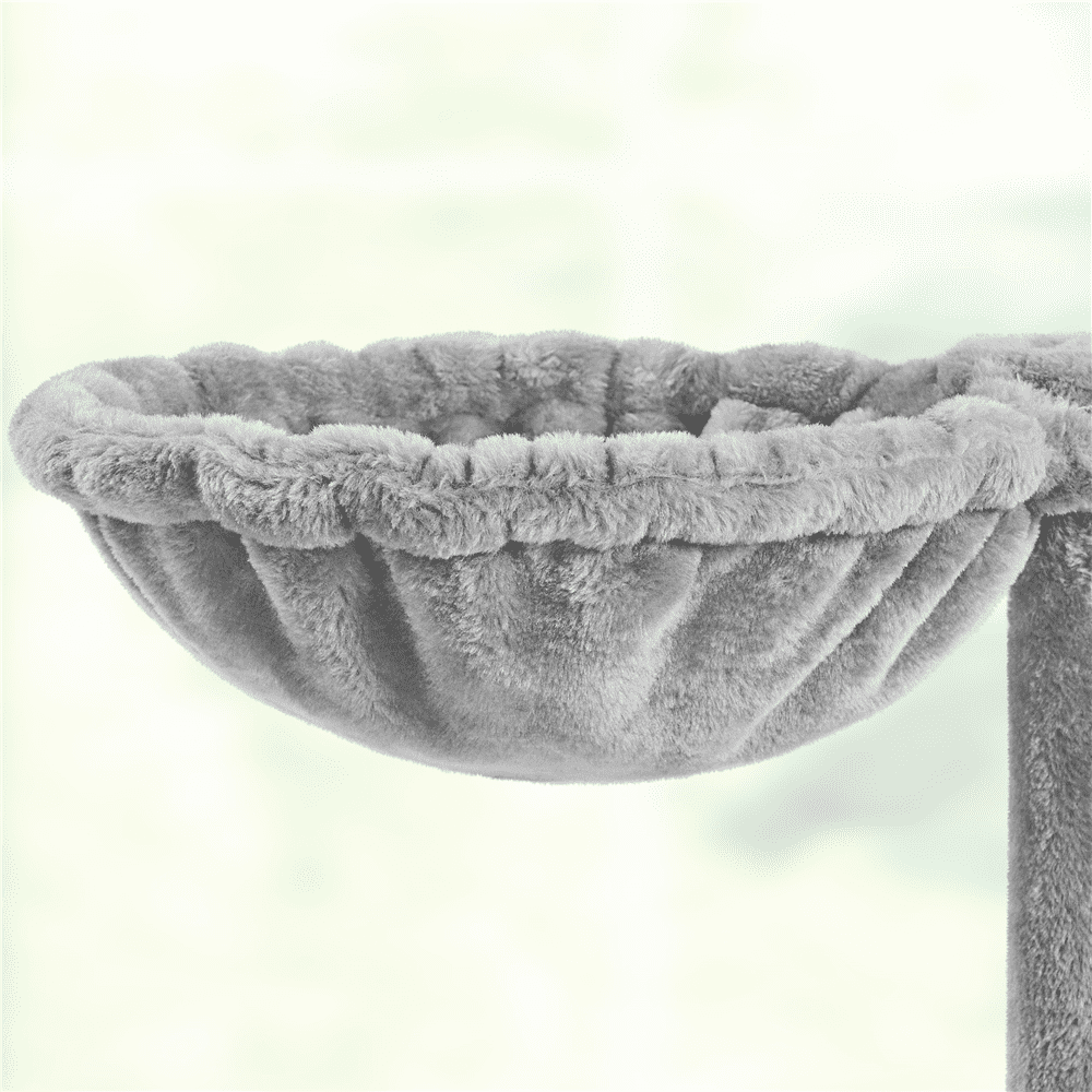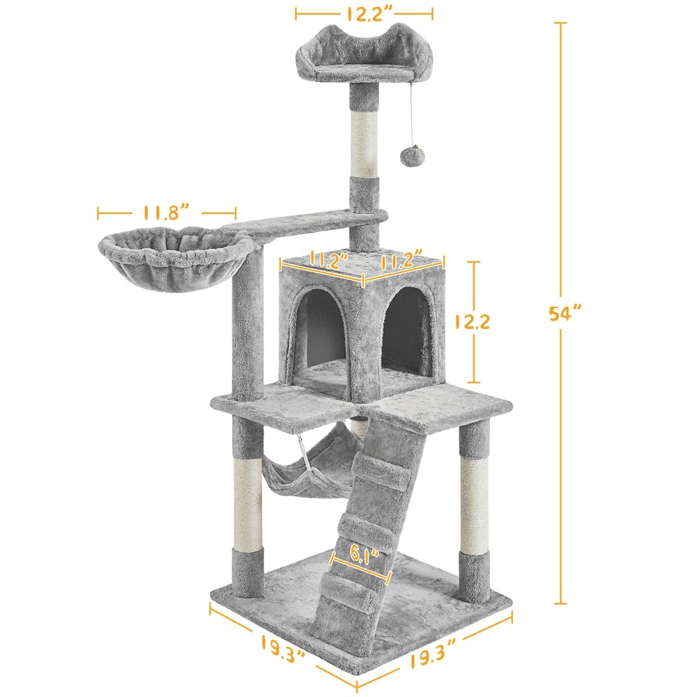 Color: Light Gray Materials: Particle Board, Plush, Sisal Rope Assembled Dimensions:19.5″ L × 19.5″ W × 54″ H Top Perch with Cat-ear Edge: 12″ Dia. × 5″ H Condo: 11.2″ L × 11.2″ W × 12.2″ H Hammock:13.4″ L × 10.6″ W Baseboard: 19.3″ L × 19.3″ W × 0.5″ Thickness Basket Diameter: 12″ Maximum Weight Capacity: Top Perch / Condo: 22 lb; Basket: 11 lb Item Weight: 21.2 lb Shipping Weight: 23 lb