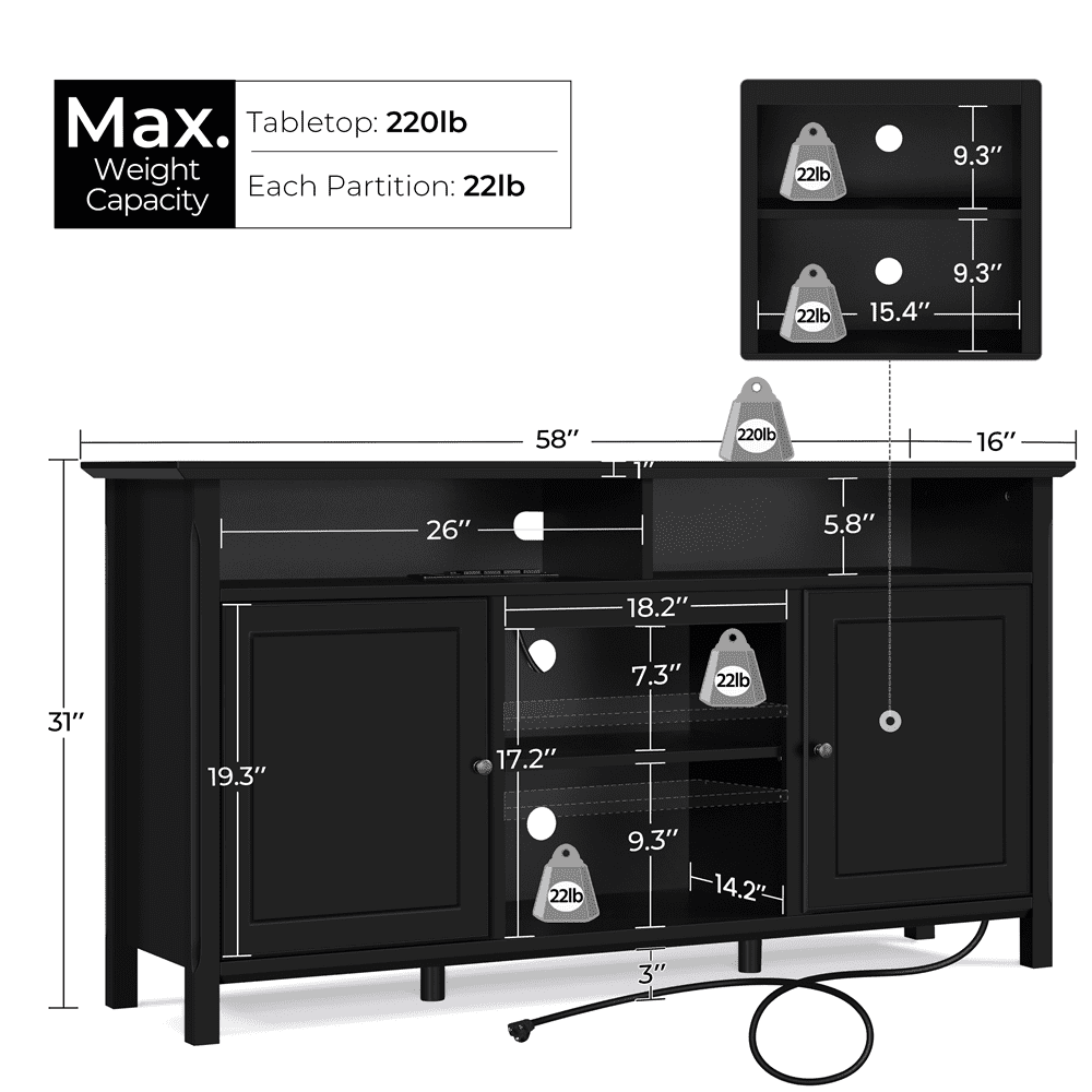 Renwick 58in Width Modern TV Stand TV Console with Power Outlet for TVs up to 65in, Black: Color: Black Materials: MDF board Overall Dimensions: 58”L × 16”W × 31” H Each Top Separated Shelf: 5.8”H × 26″ W × 13.4”D Upper Central Compartment: 7.3”H × 18.3”W × 12.2” D Lower Central Compartment: 9.3”H × 18.3” W × 12.2”D Ground Clearance: 3” Max Weight Capacity: Top: 220 lb Each panel: 22 lb Net Weight (assembled product weight): 97.5 lb Gross Weight (product in the box): 108 lb Power Outlet: Length: 2m Rated Power: 2000W Ports: 4 ACs Comprising: a switch, a hook & look Plugs: 3-plug Cable: double-insulated round wire Assembly Required Residential Use