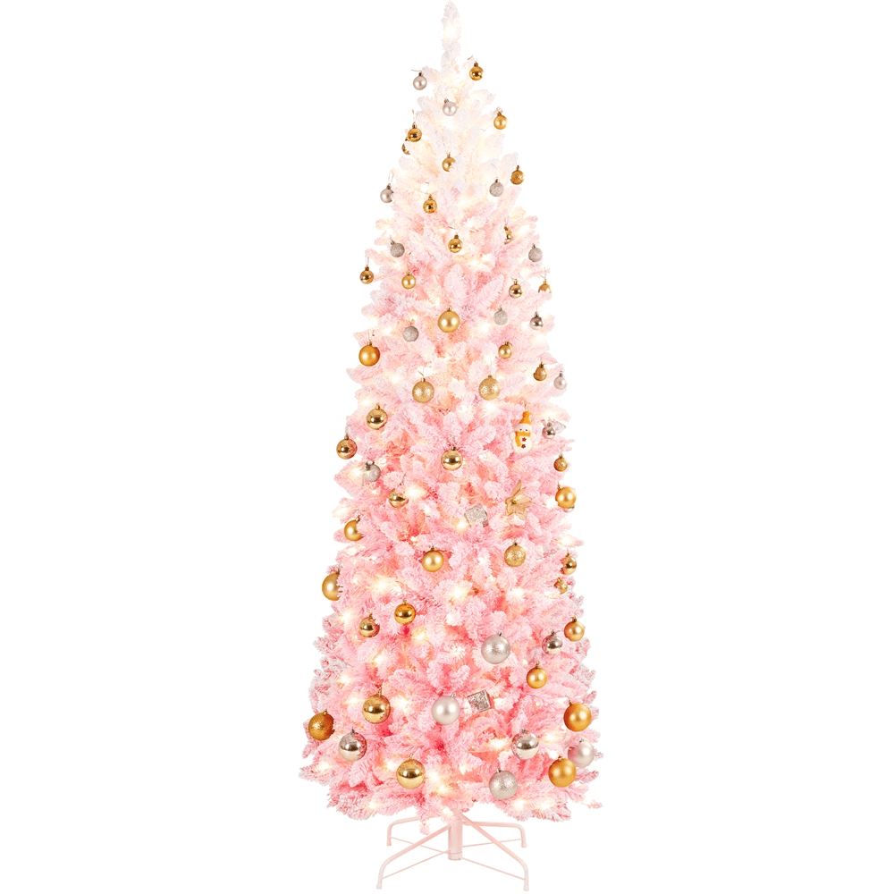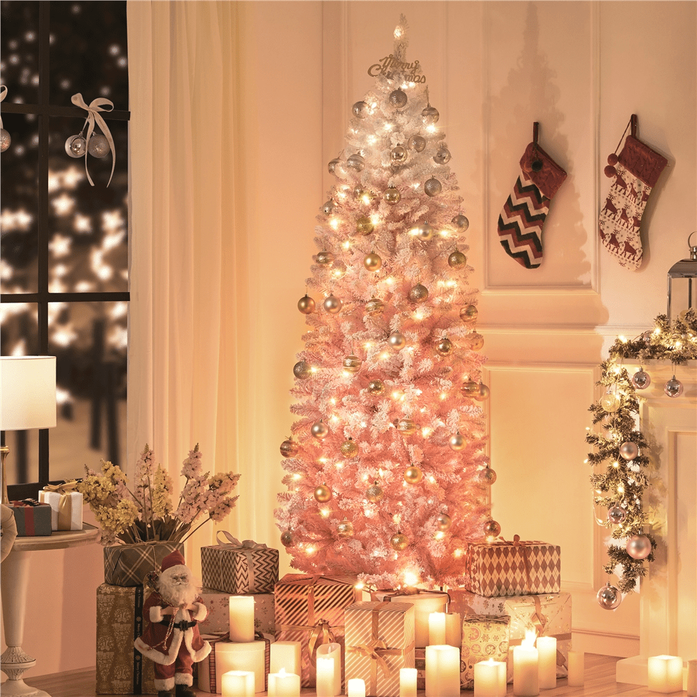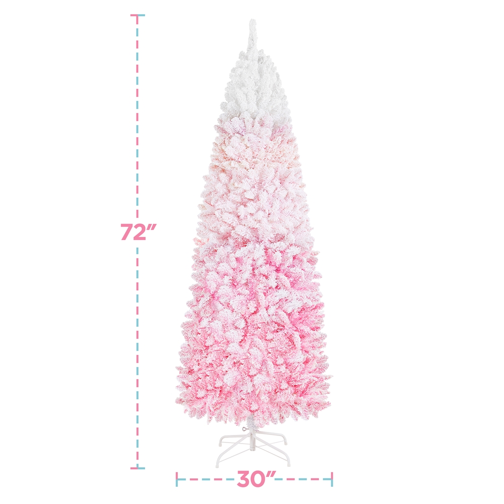 Renwick 6 Ft Artificial Christmas Tree with Foldable Stand,Pink Gradient: Color: Pink Gradient Materials: PVC, Iron Category: Flocked Pencil Prelit Spruce Total Tips Count: 814 Total Lights Count: 250 Assembled Dimension: 29 × 72” (Dia. ×H) Stand Dimension: 20 × 5.5”(Dia. ×H) Shipping Dimension: 42″ × 14″ × 13.5” (L×W×H) Diameter of the Trunk Pole:1” Shipping Weight: 22 lb Item Weight: 17 lb Foldable Stand Space-saving Solution Residential Use Assembly Required