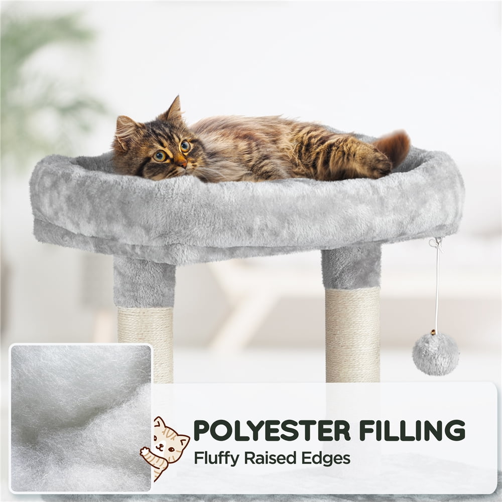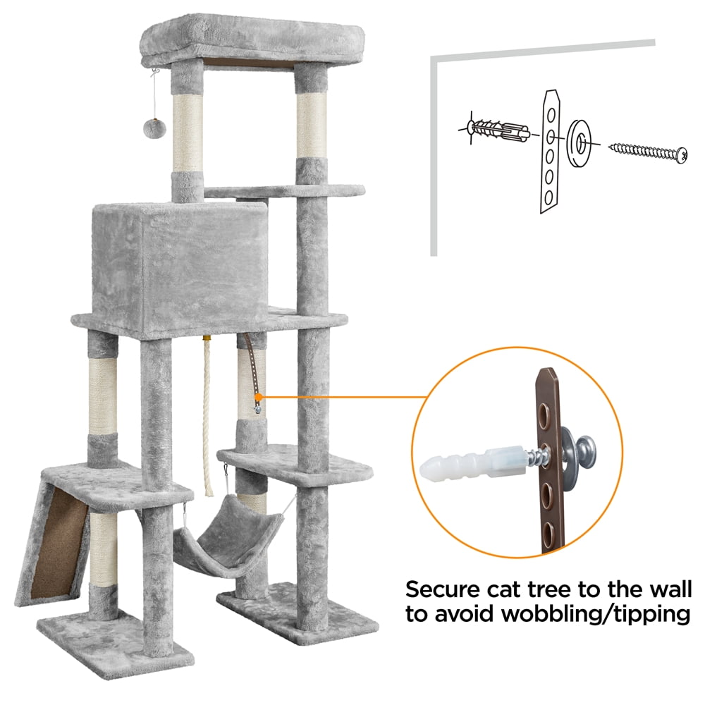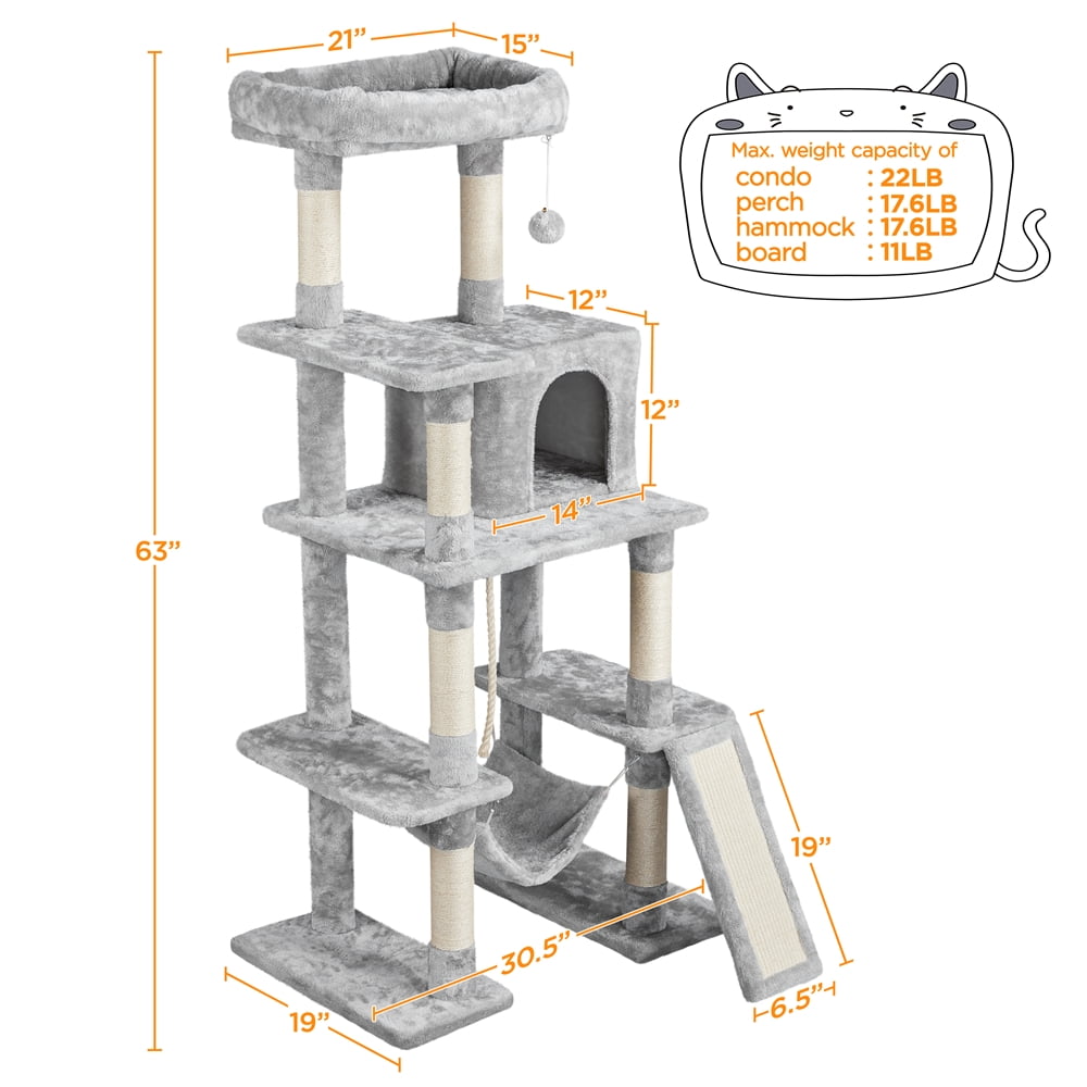 *Renwick Large Plush Cat Tree Indoor Cat Condos Cat Tower with Hammock Toy Ball for Kittens Cats, Light Gray: Material: P2 Particleboard, 400g plush, sisal ropes, paper tube, plastic, and iron Color: Light gray Overall size: 30.5x19x63in (LxWxH) Scratching board size: 19×6.5×0.5in (LxWxzH) Condo size: 14x12x12in (LxWxH) Perch size: 21x15x3.5in (LxWxH) Hammock unfolding size: 16.5×12.6in (LxW) G.W.: 35.7lb N.W.: 33.7lb Please allow ±1cm/0.5inch error due to manual measurement. Assembly required Instructions Included Residential Use Assembly required