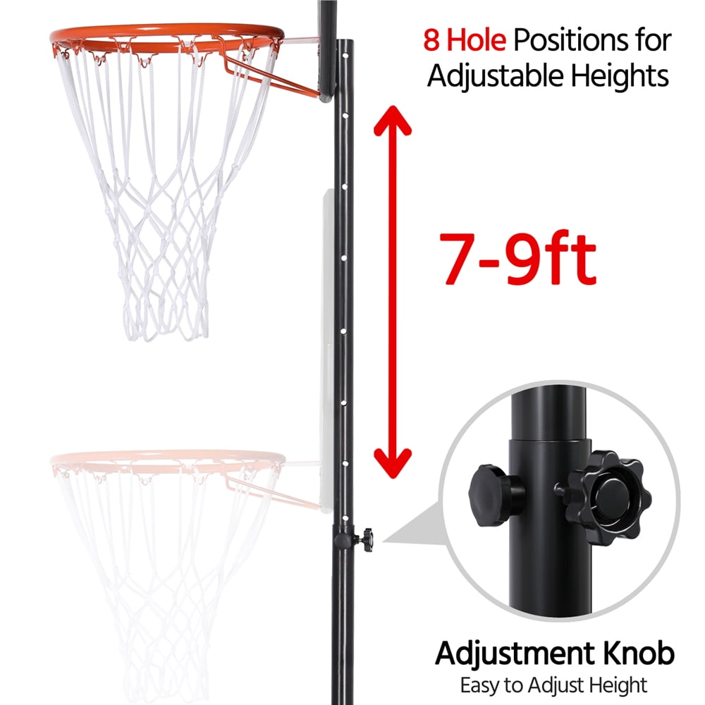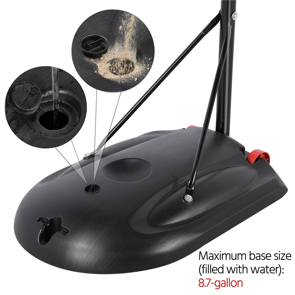 [Selected materials for outdoor use] : Weather-resistant, high-impact polyethylene plastic backboard and powder-coated steel pole ensure high strength, good durability and weather resistance of this basketball hoop [Height adjustable] : This basketball hoop can actually “grow” with your little athletes! The telescoping height rim adjustment allows for a range of 5.6 ft to 7.5 ft in 4.7’’ increments. With the height adjustment, the portable hoops will be good practicing equipment for younger players who are continually growing [Effortless portable design] : The base is equipped with two big wheels for effortless moving even when the base is weighted by stuffing. And what’s awesome is that our basketball hoop system can be dismantled into a compact size and easily stored in your garage or transported in your trunk [Versatile basketball hoop] : Suitable for size 3-7 basketball. This height-adjustable basketball hoop can be set at 9 ft high for courts or lowered to 7 ft for indoor games. The rim height can be adjusted from 5.6 ft to 7.5 ft incrementally for ground and pool basketball games [Convenient temporary court] : With this portable basketball hoop, you can easily turn your backyard/driveway into a temporary court for the family. It’s a convenient alternative to an in-ground basketball hoop