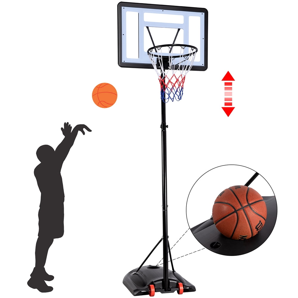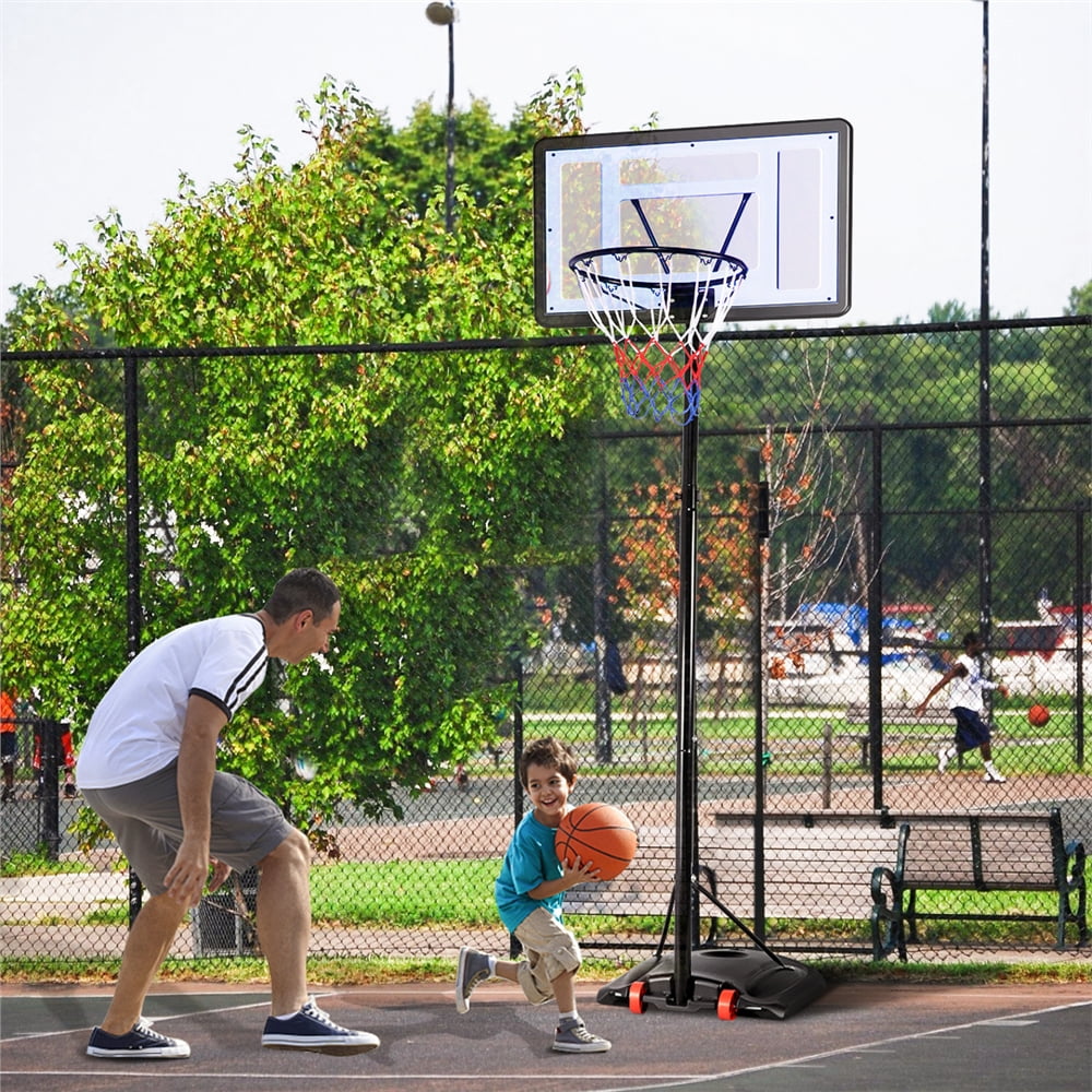 Selected material for improved durability : Constructed of waterproof powder-coated steel posts measuring 1.5inch in diameter, shatterproof PVC and PE backboard and base, and durable nylon net, this basketball hoop system is made for lightweight and good durability as well Weight base with wheels : The 32.7 x 22’’ (LxW) tank base can be weighted with water or sand to ensure the stability and safety of your every shot. It equips with two 10cm/4’’ big wheels, so you can transport it with ease wherever you want even when the base is weighted Versatile : This height-adjustable basketball hoop can be set at 9.2’ high for the backyard court or lowered to 7’ for indoor or pool basketball games. The 16.5-inch metal rim is suitable for size 3-7 basketball and is recommended for young players whose height ranges from 3.3ft-4.6ft to use Hassle-free assembly : Simple assembly is required for this basketball hoop. With the illustrated user manual and tools enclosed, you can set it up quickly and without difficulties Compact storage size : Despite the large assembled size, this portable basketball system can be disassembled into a compact size so you can conveniently store it in the garage or transport it in the trunk