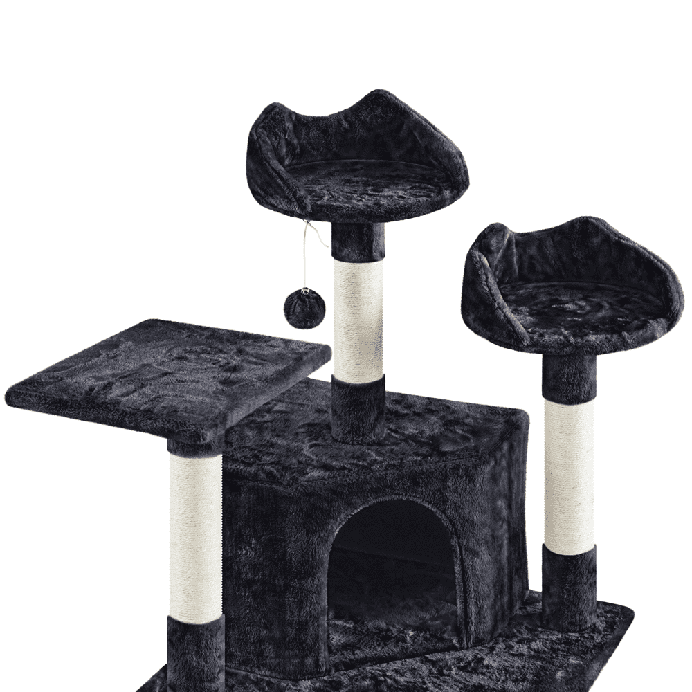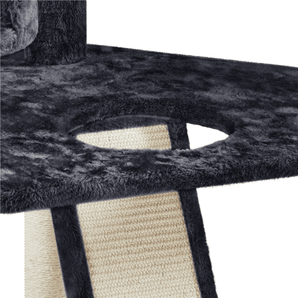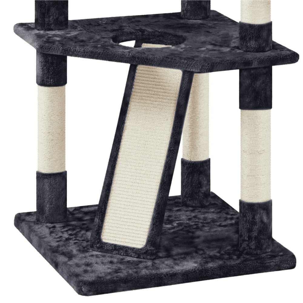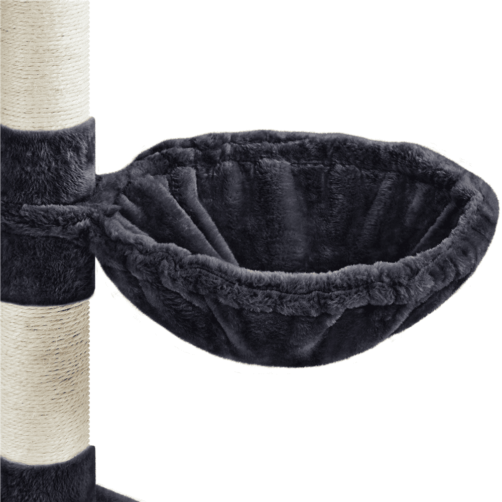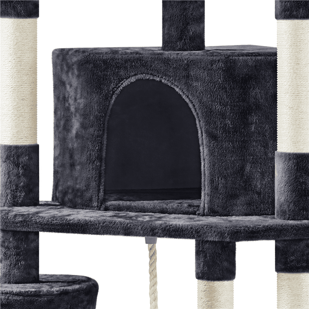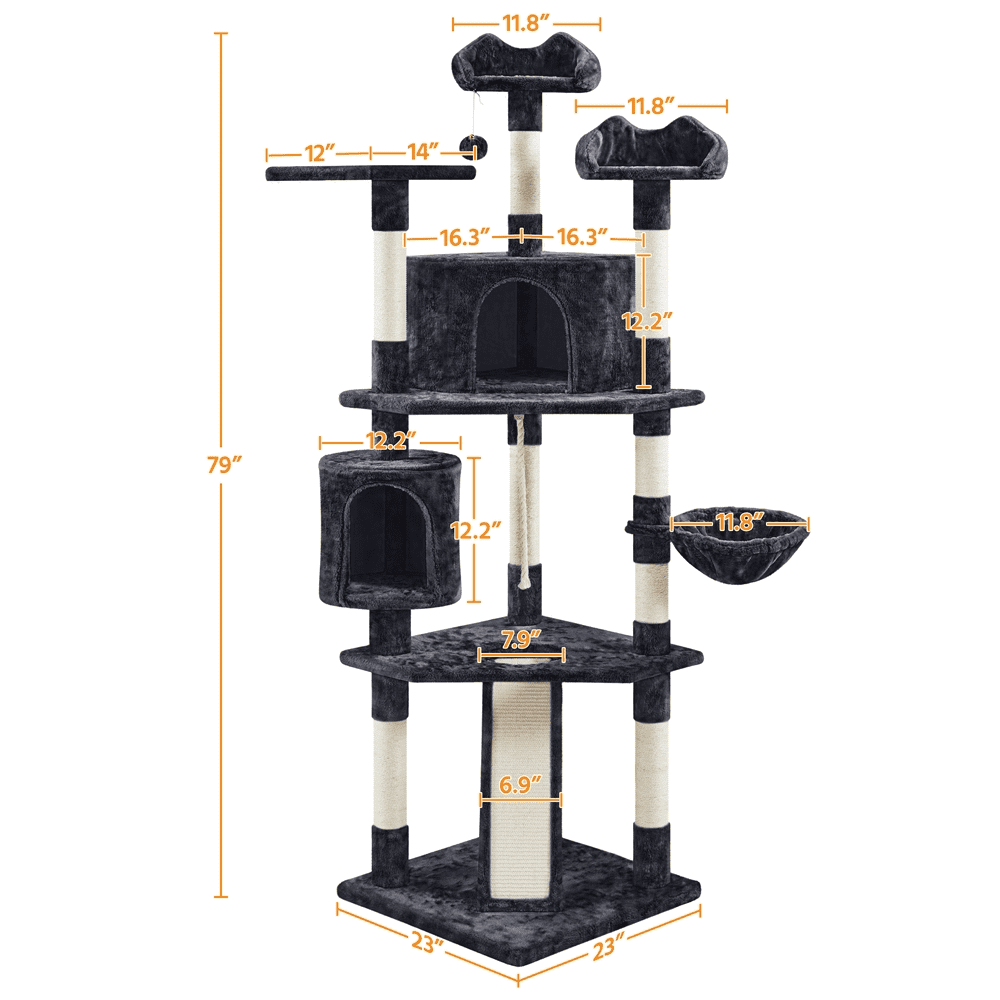 Pet-friendly Materials: Fashioned from CARB P2-compliant particle board, soft plush, and adorned with natural sisal rope, this cat tree becomes a safe activity center that meets your beloved feline scratching preference and both for climbing and resting. Scientific Layout: Standing at 79 inches, this cat tree condo features a stable structure with a vertical layout that increases the activity space, giving pets plenty of opportunities to climb, explore, and indulge their natural curiosity in your home. Cat’s Activity Center: Boasting nine scratching posts, the cat climbing frame promotes healthy scratching habits. A corrugated sisal ramp and a hanging sisal rope above it provide additional options for stretching and engaging their scratching instincts. Thoughtful Designs for Extra Safety: The provided anti-toppling kit allows secure attachment to the wall, enhancing the overall stability of this versatile cat tower. Also, the posts are wrapped in extra-strong sisal, ensuring long-lasting durability. Specifications: Color: Black; Materials: Particle Board, Plush, Sisal, Foam, and Plastic; Assembled Dimensions: 23″ L × 23″ W × 79″ H; Baseboard: 23″ L × 23″ W × 1.2″ Thickness; Maximum Weight Capacity: Condo: 22lb; Basket / Perch: 11 lb.