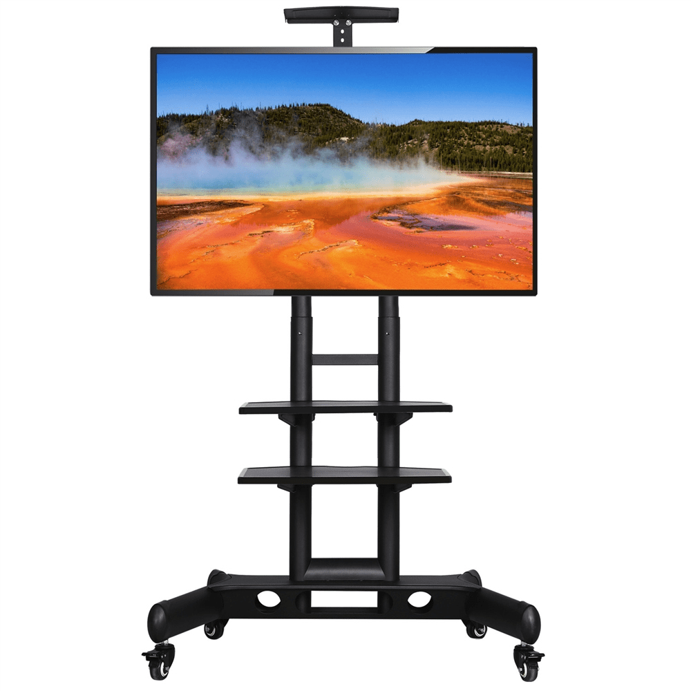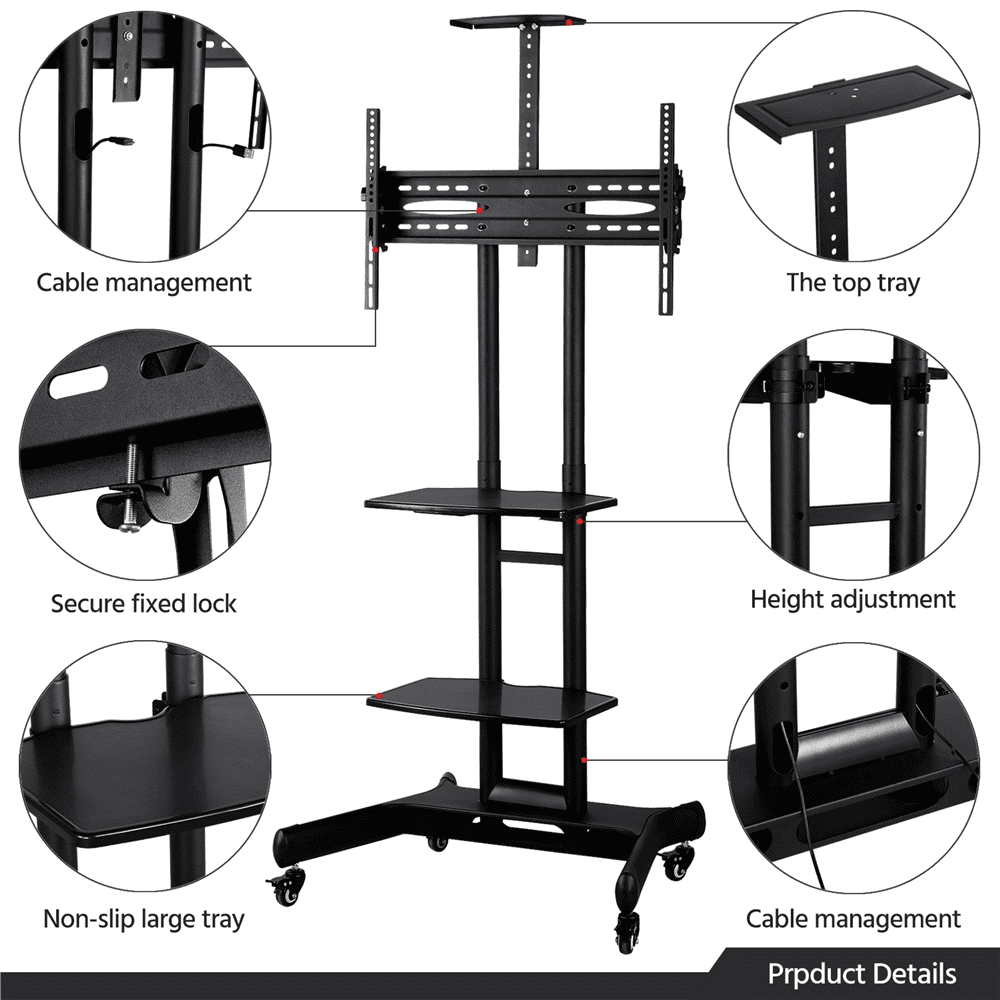This height adjustable mobile TV stand makes it possible! You can raise or lower the TV screen to a comfortable height to reduce pressure on your neck, and back. This metal TV stand has four 360° spinner and lockable wheels which help you move and stop the stand easily and smoothly everywhere at any time. The mobile TV cart features three storage shelves for placing devices and accessories. What’s more, its cable management design completely makes cables and wires neat to avoid twisting. TV trolley with wheels is suitable for many occasions, for example, living room, yard, office, meeting room, expo, trade show, hospital, classroom, lecture hall, hotel, bar, gym, etc. Do not miss this practical and modern mobile TV stand!